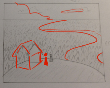 Ta dernière compo est sympa, voilà de quoi l'améliorer facilement : un peu de volume sur la maison, décaler le personnage légèrement sur la gauche pour le décentrer de l'image, et rajouter une rivière qui disparait dans le lointain pour guider l'œil et que l'arrière plan soit moins monotone. Éviter la symétrie avec les nuages aussi :)