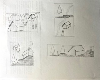 Les autres c'est moins ça, tes éléments ne sont peut-être pas assez hierarchisés (t'es tu demandé où tu voulais qu'on regarde sur ta composition ?) Celle a droite aurait pu être bien mais la colline du fond qui est parallèle à la ligne du toit et qui est très proche, ça casse toute la profondeur de l'image. Je te joins un petit redraw qui j'espère te mettra en évidence comment améliorer la compo en changeant des toutes petites choses ^^