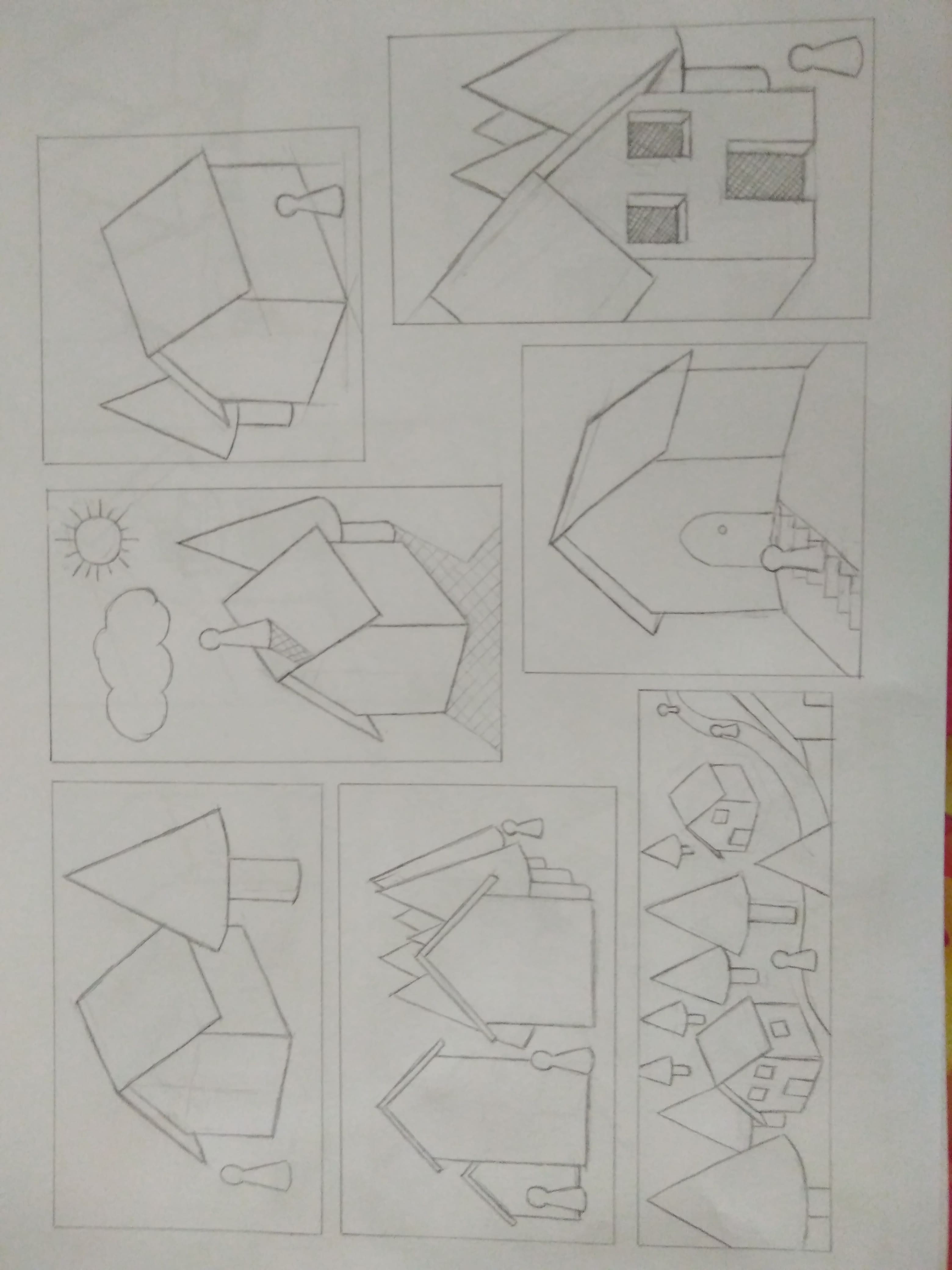 Mmmmh it seems like you've focused a lot on format changes while somewhat overlooking the creativity of the composition. You're not required to keep the same layout/dimensions of the elements; on the contrary, you are even encouraged to vary as much as possible! So with the houses always oriented the same way and similar placements, it's a bit monotonous and I don't have much to correct in the end. Your elongated formats are more creative and interesting, you should continue in this direction :) I also like your small square format on page 3.