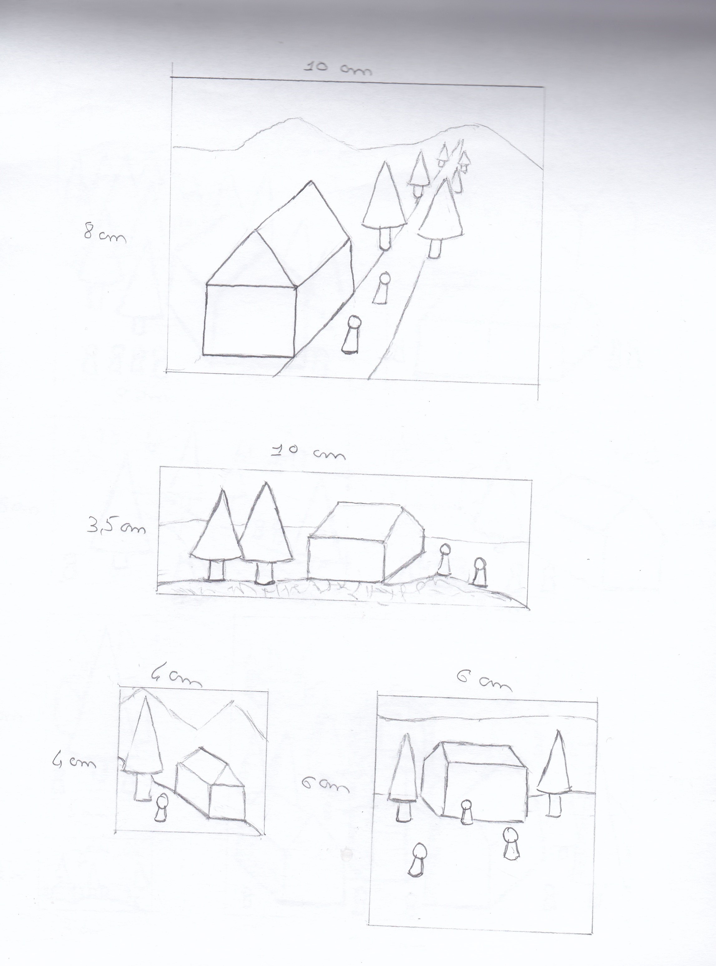 and in the other composition just to its right, the hill ends up at the same level as the tree and the house, I would have made it either higher or lower to avoid alignments.