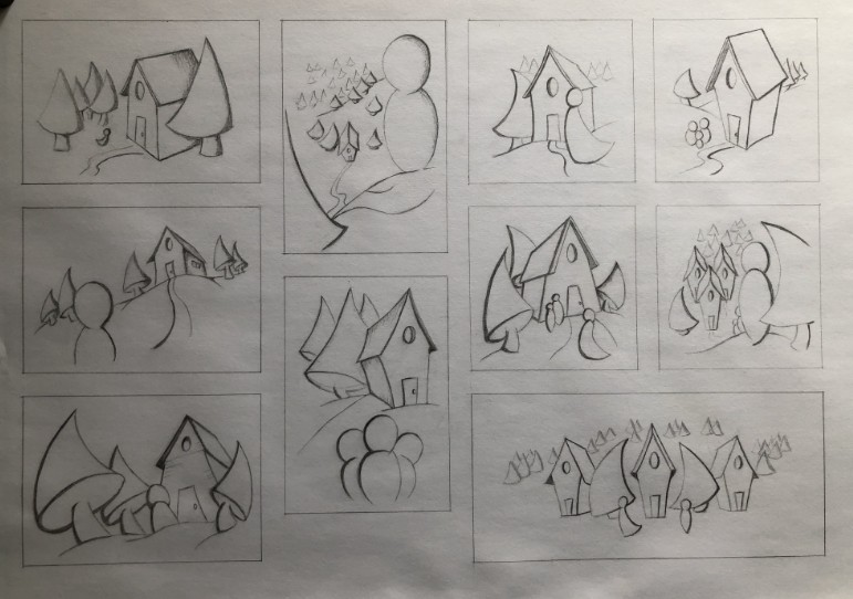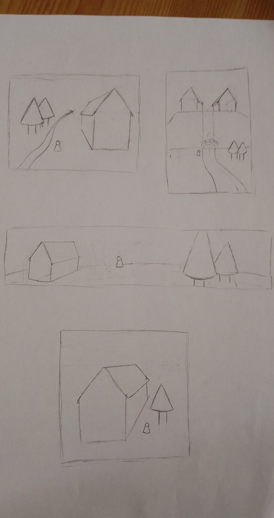 Your first sheet is really not bad, with nice proposals, no particular composition errors, even if your first drawing is more interesting than the second (presence of landscape, foreground, background), however, be careful with perspective when you delve into this kind of work 😁 (especially on the roof of the house in the foreground).