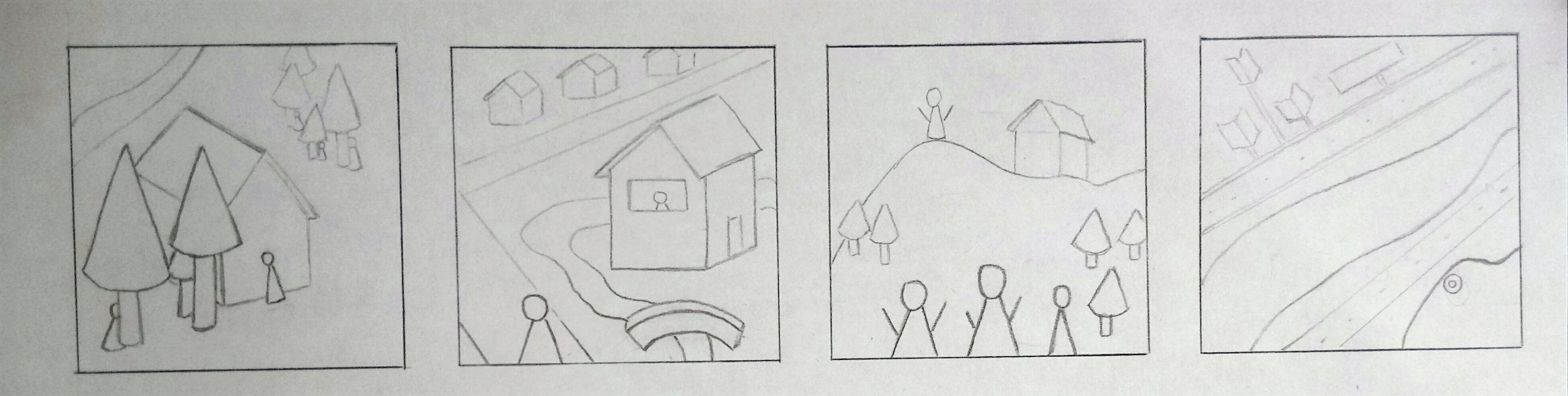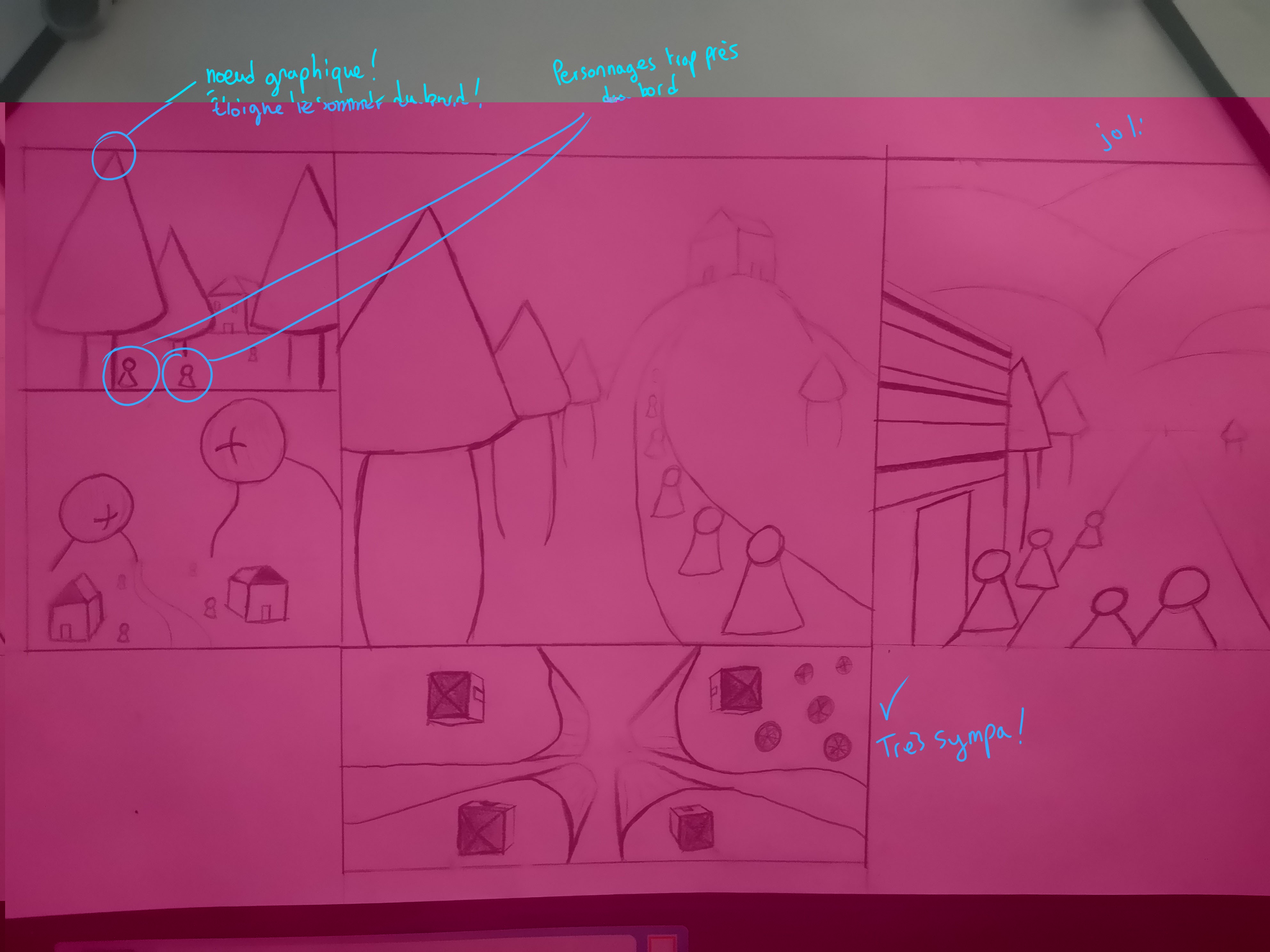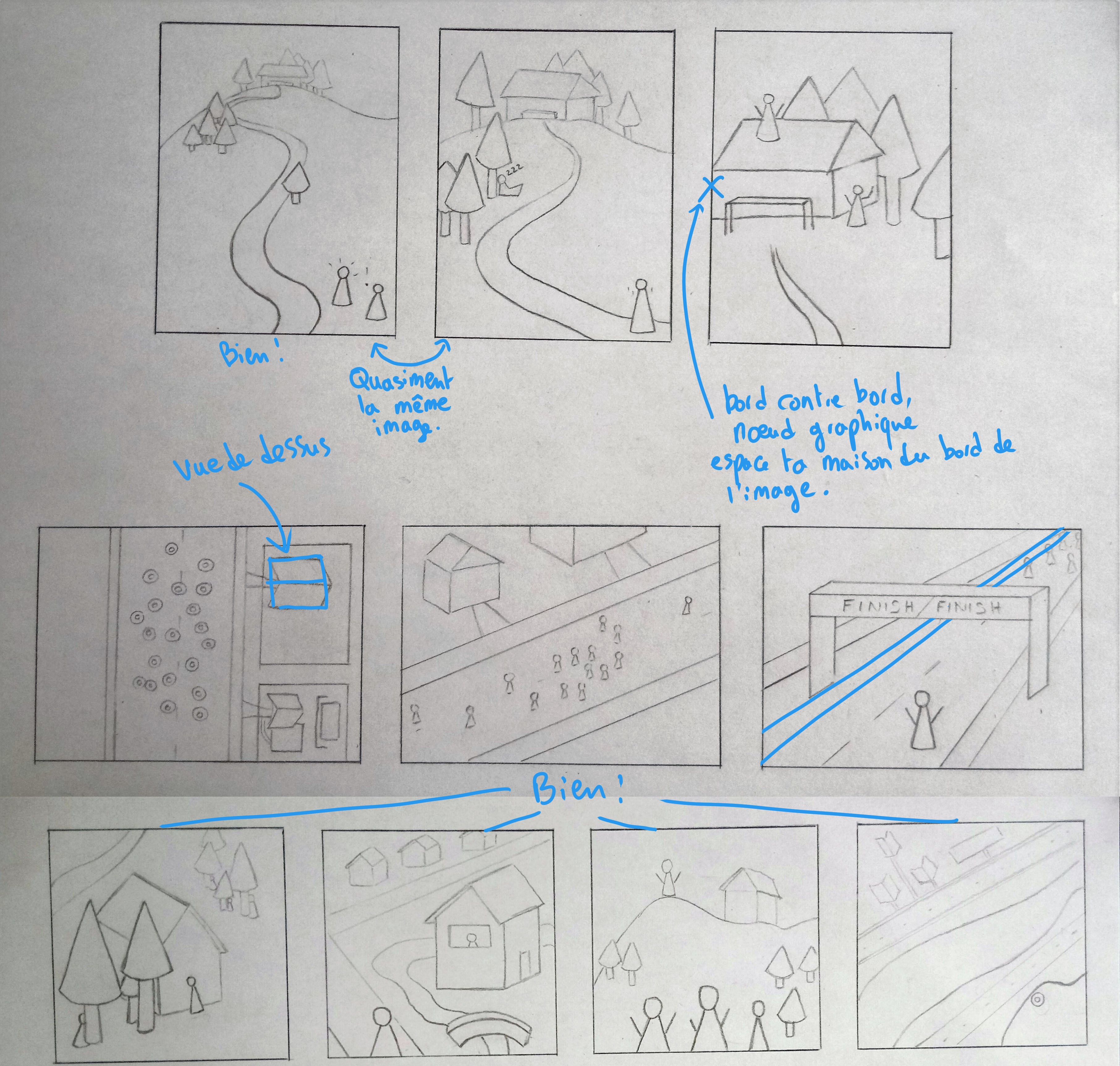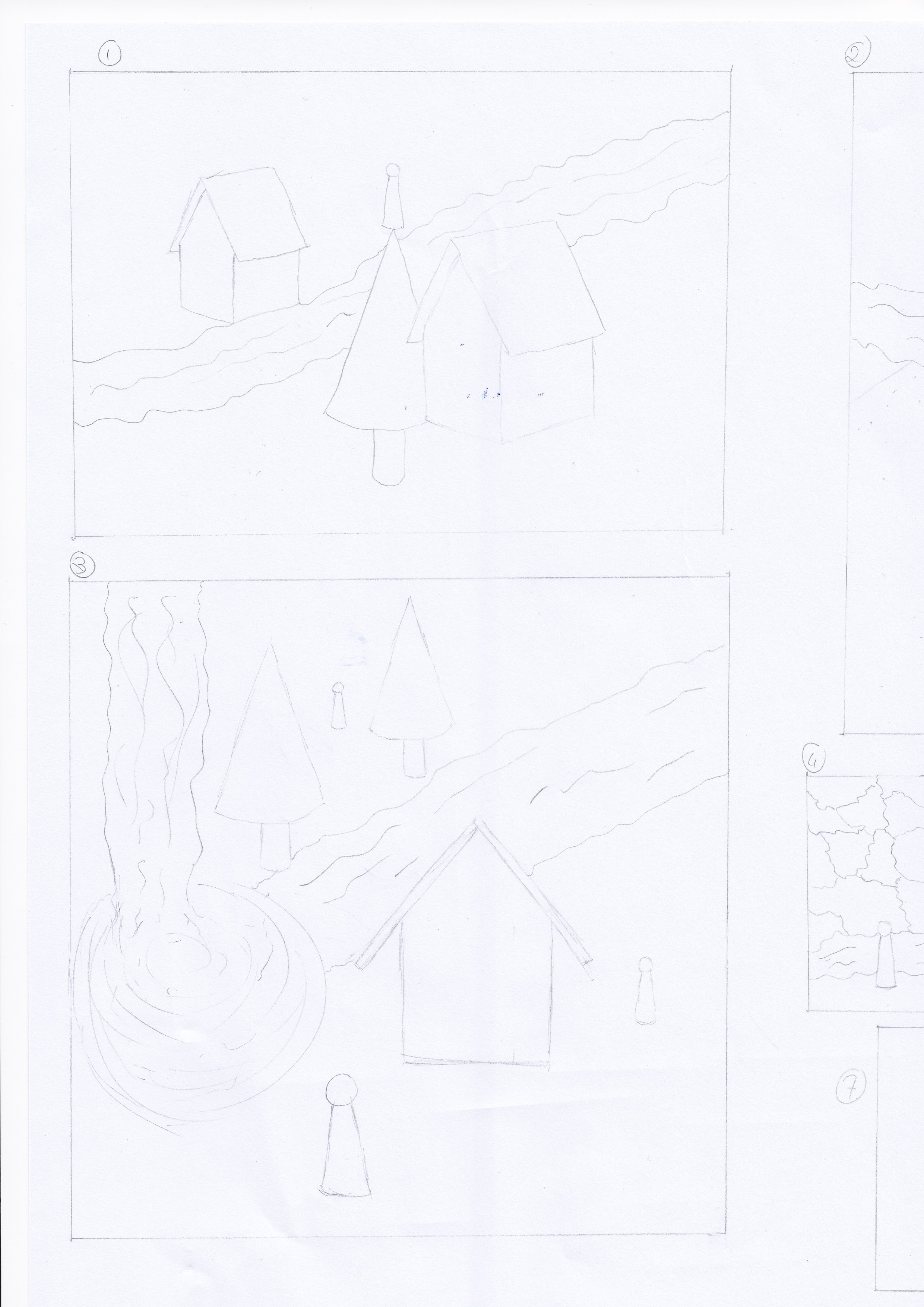 Your second board is also very creative, I like how you frame a scene with your characters using the houses in the first drawing. You respected the composition rules, well done! 👍