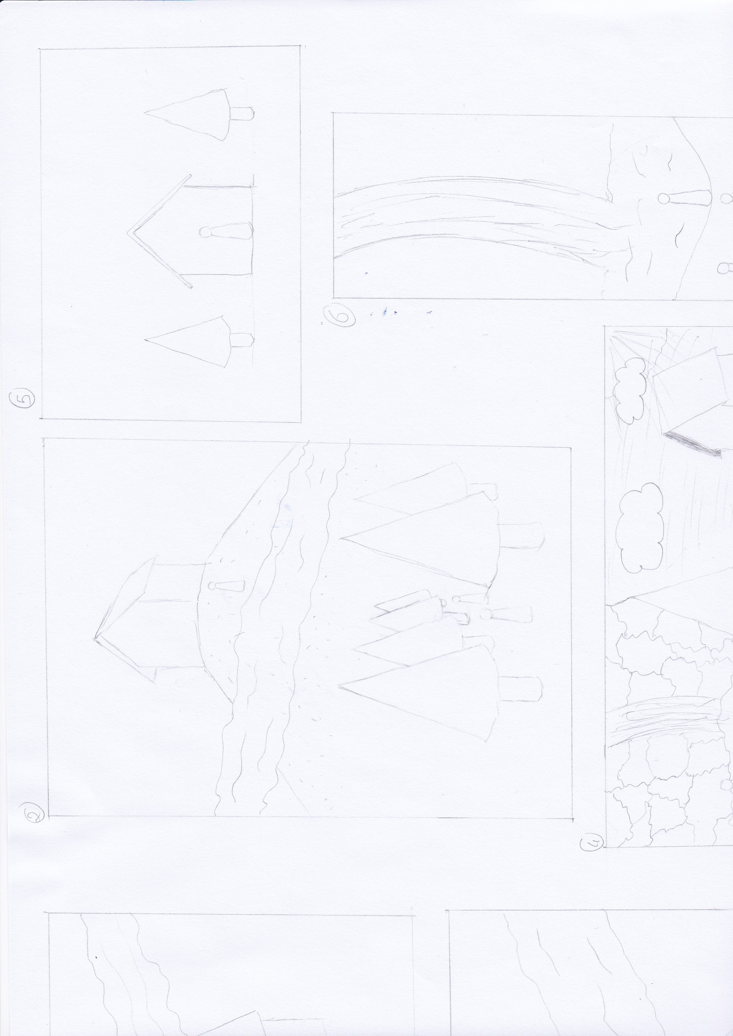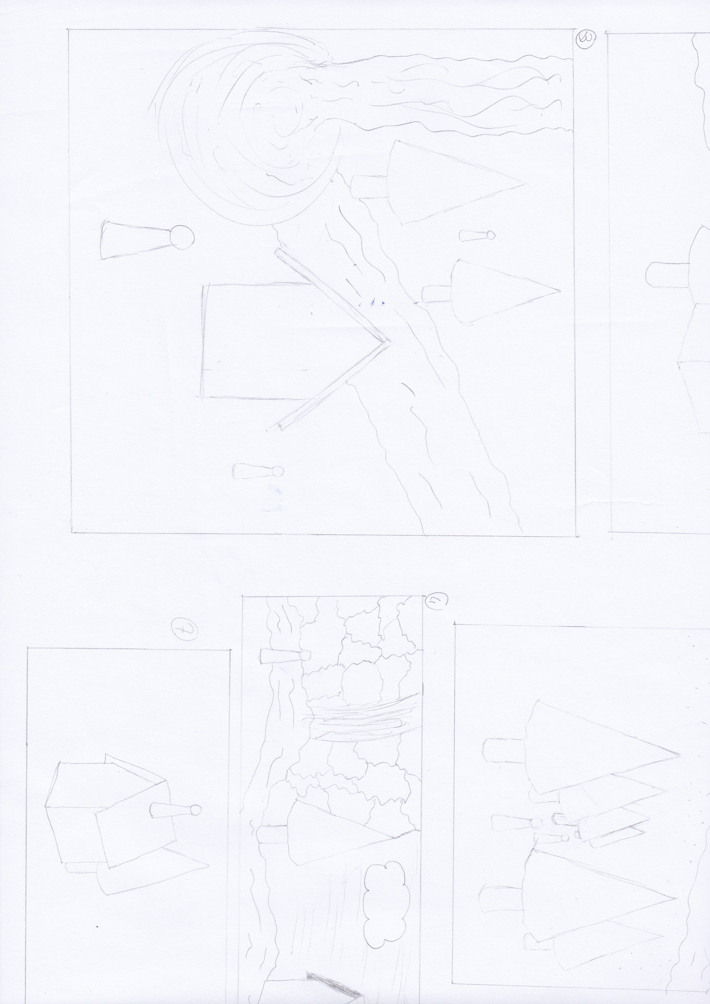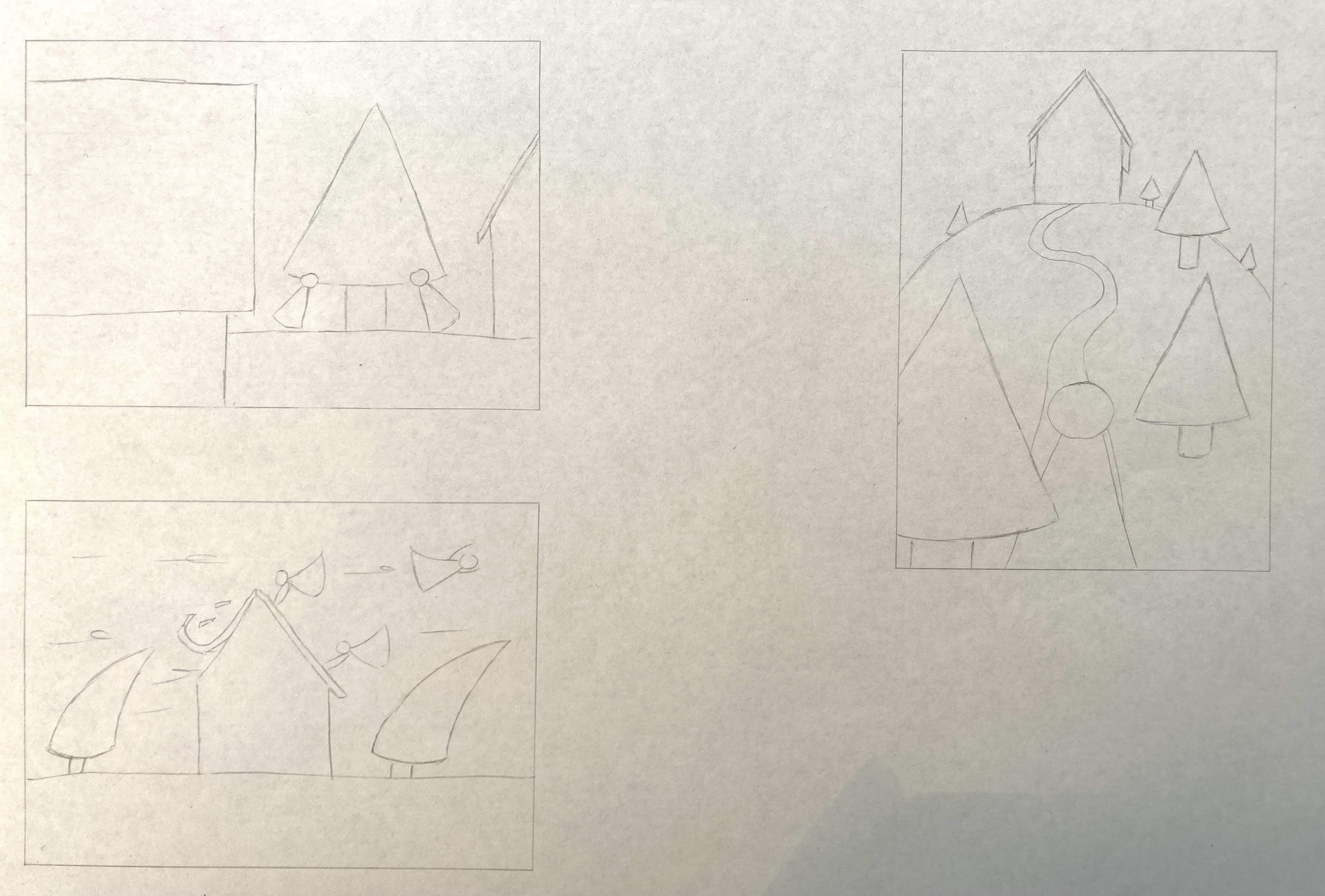 Your second board is also very creative, I like how you frame a scene with your characters using the houses in the first drawing. You respected the composition rules, well done! 👍