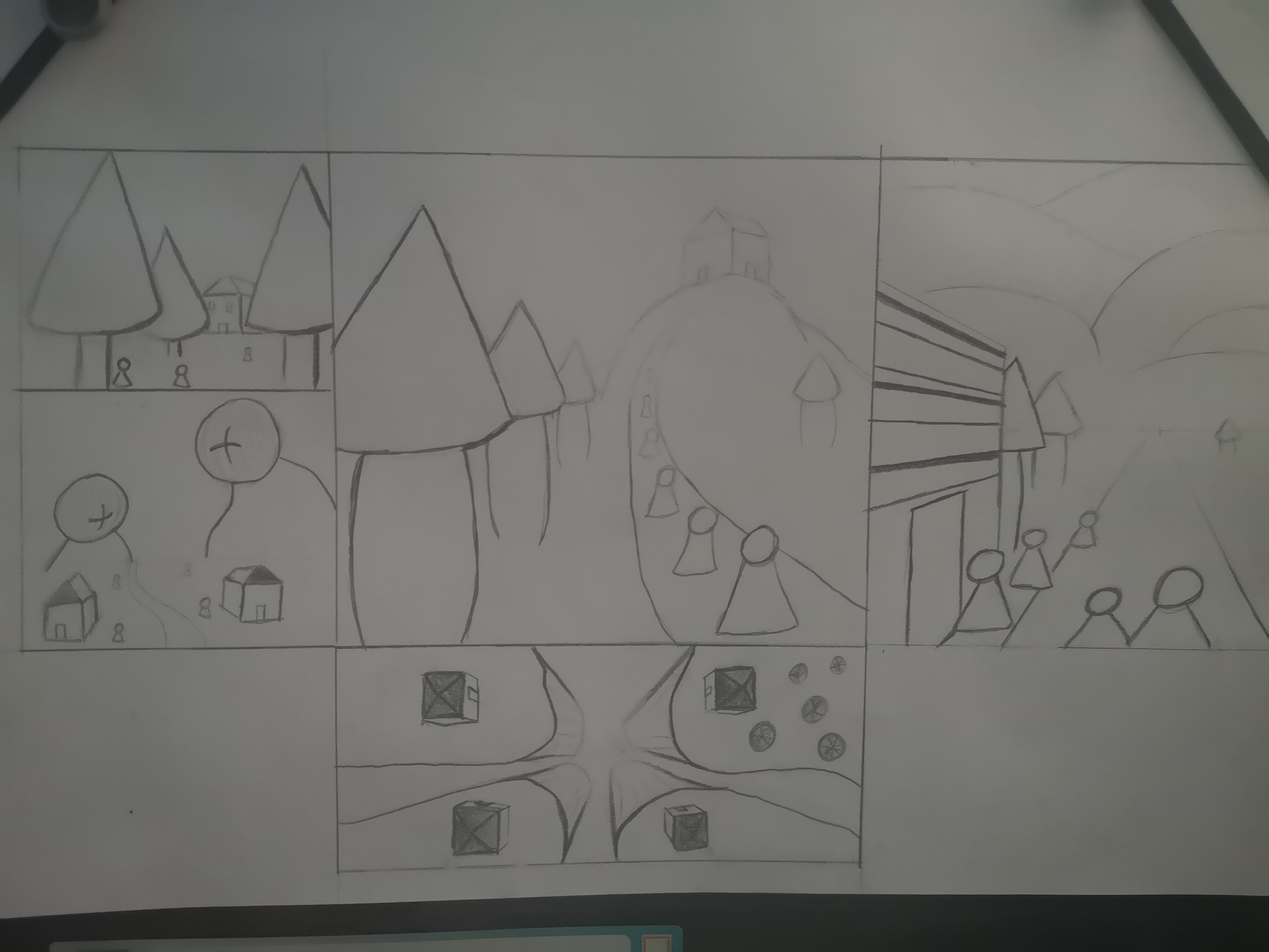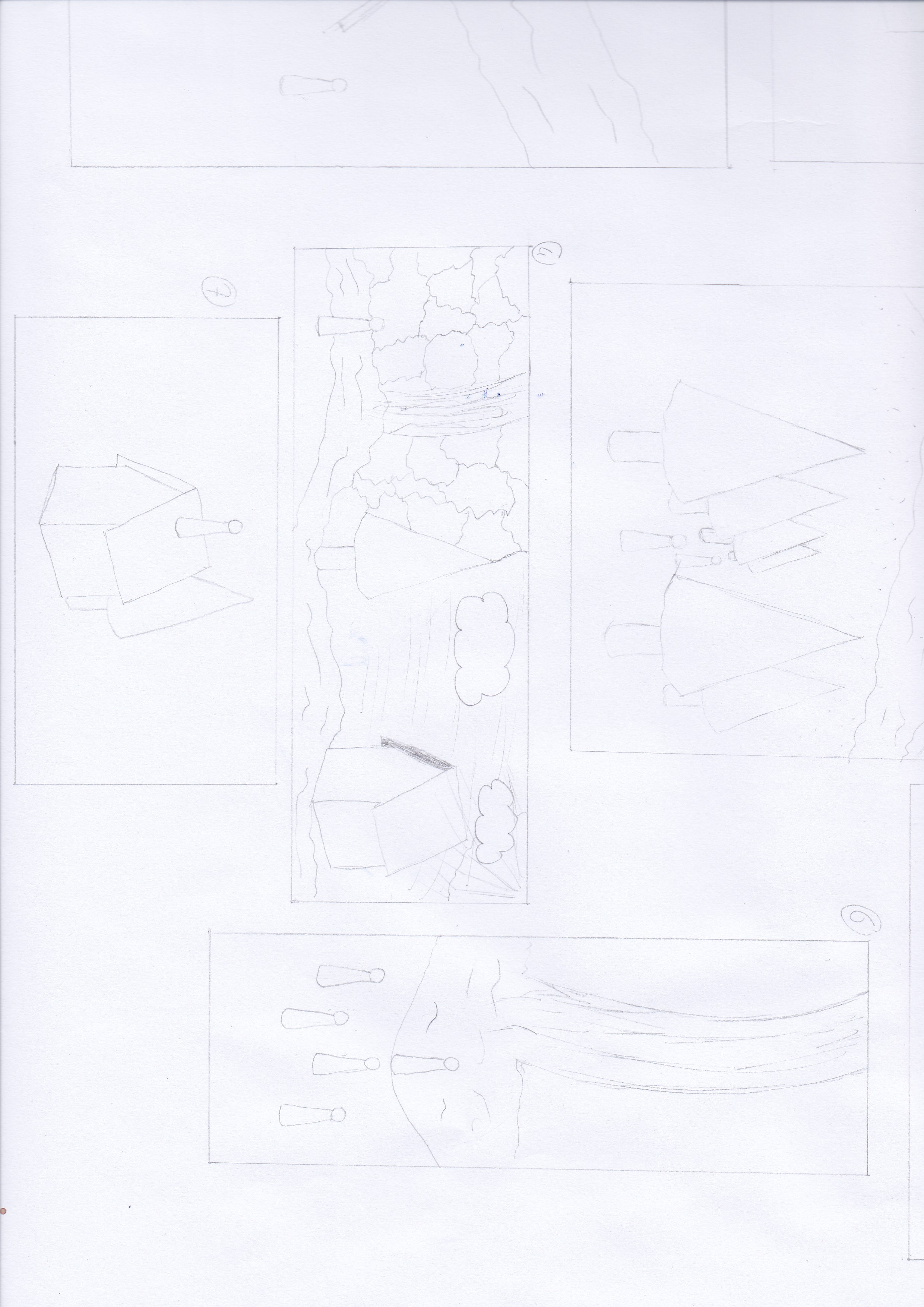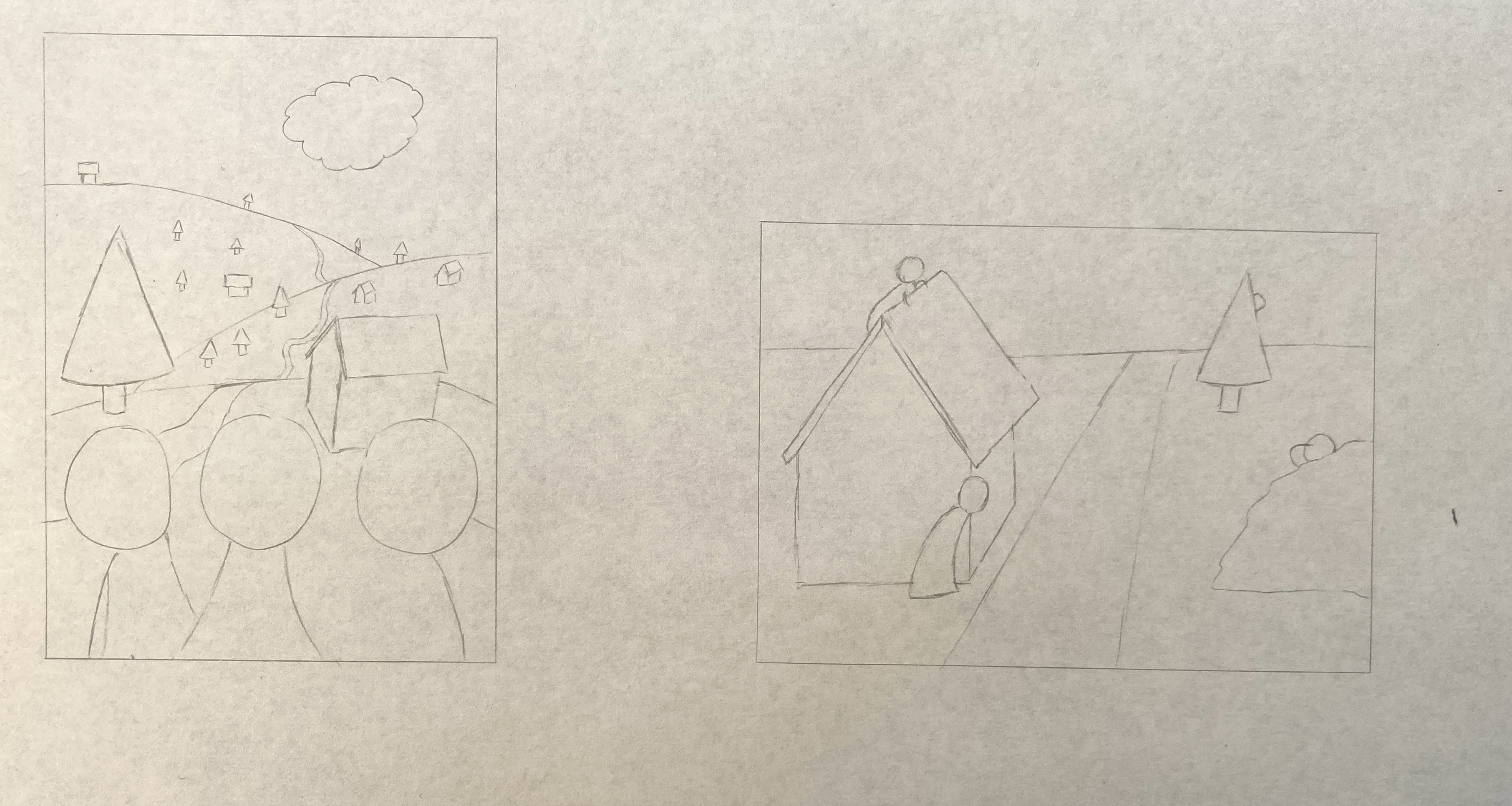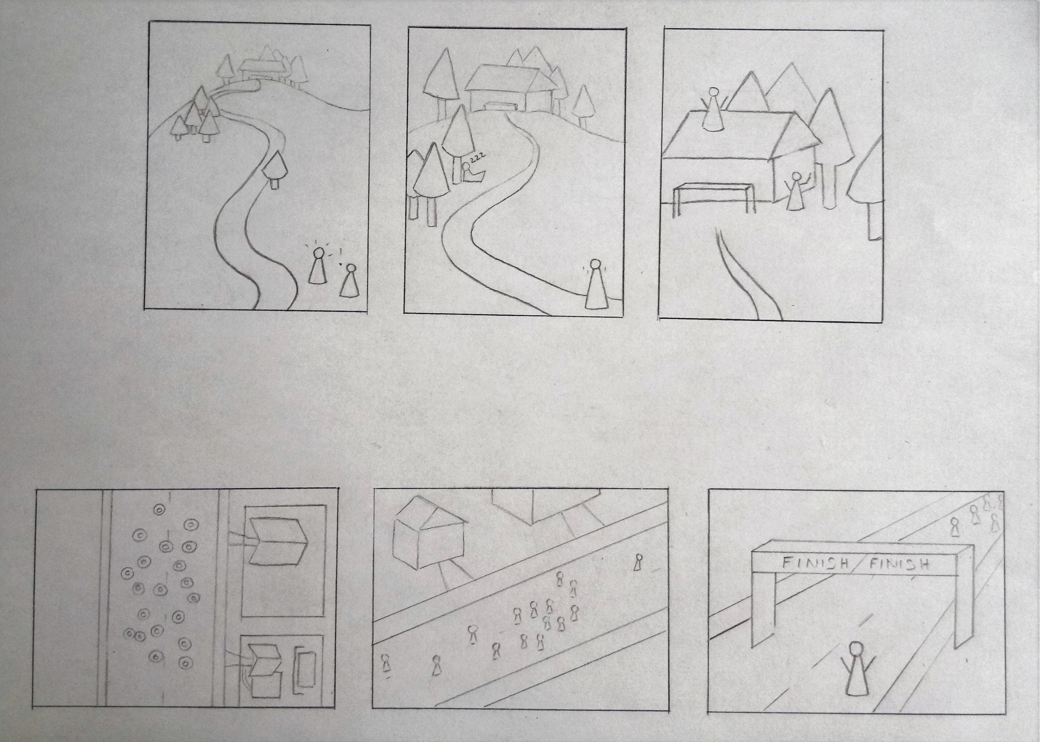 Your second board is also very creative, I like how you frame a scene with your characters using the houses in the first drawing. You respected the composition rules, well done! 👍