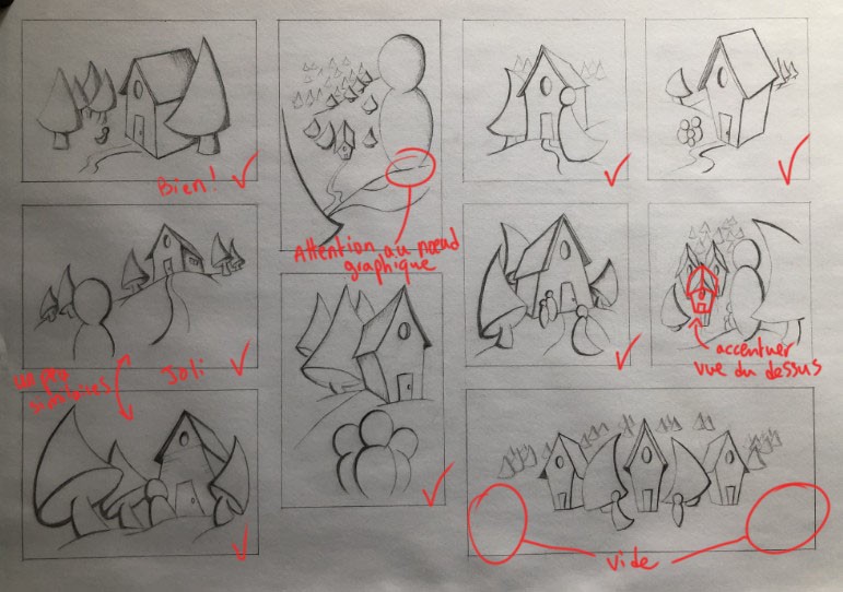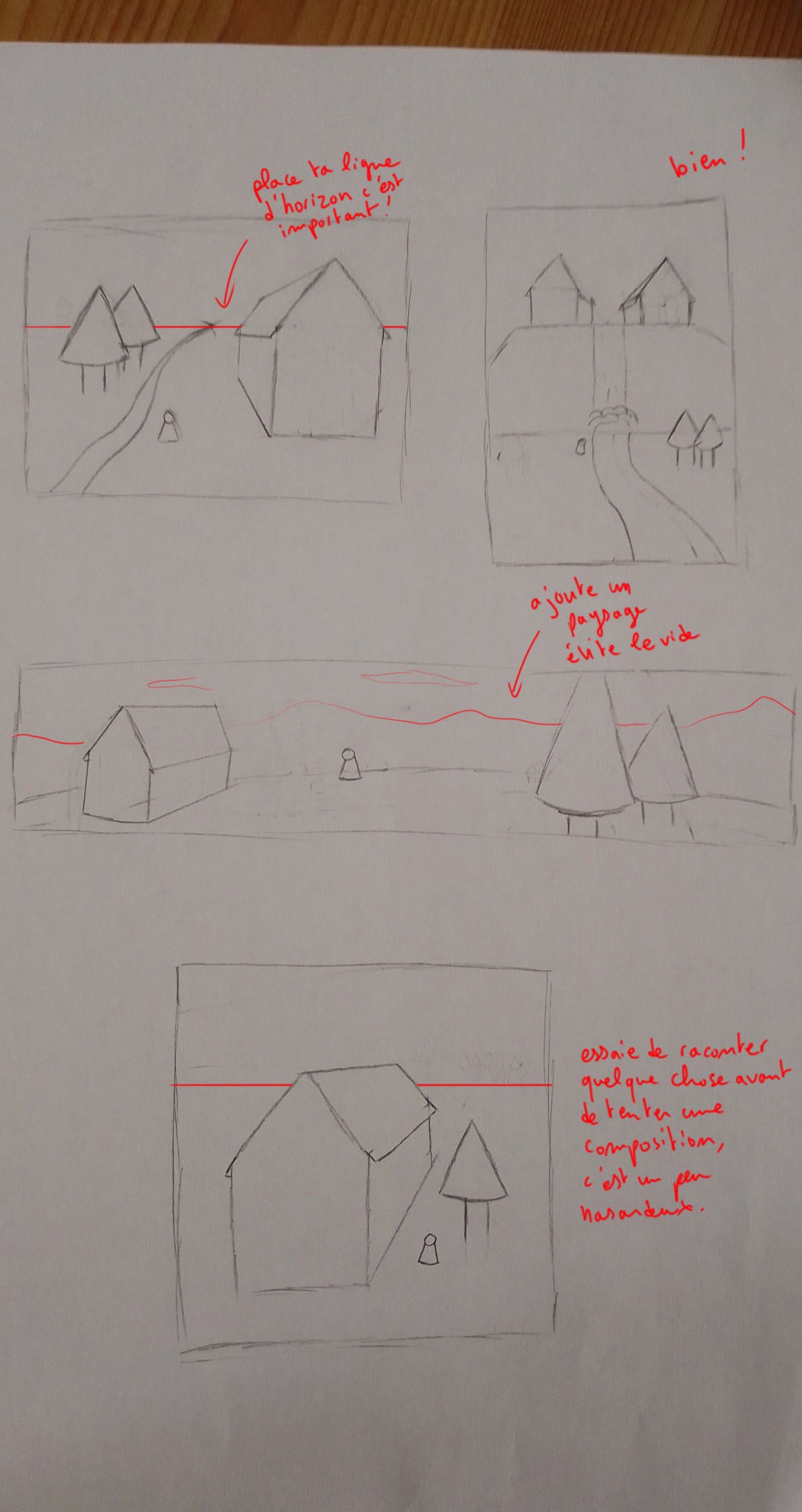 Ta première feuille est vraiment pas mal, des propositions sympas, pas d'erreur particulière de compositions, même si ton premier dessin est plus intéressant que le deuxième (présence de paysage, de premier plan, d'arrière plan), cependant attention à la perspective quand tu te lances dans ce genre de travail 😁 (sur le toit de la maison en avant-plan notamment).
