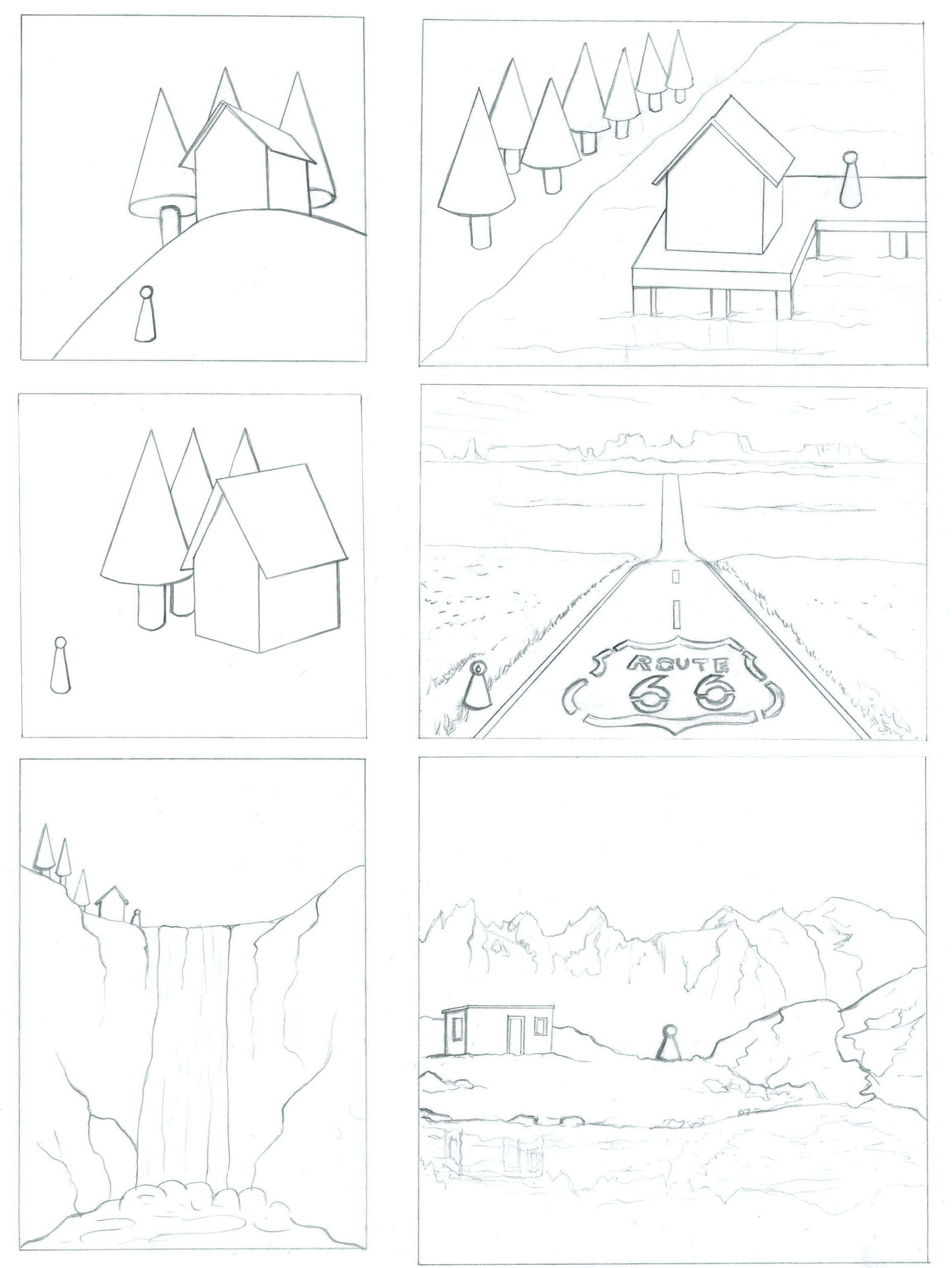 You can also move your character to the water's edge in your last sketch. This way, he will be more to scale since he will be in the foreground compared to the house.