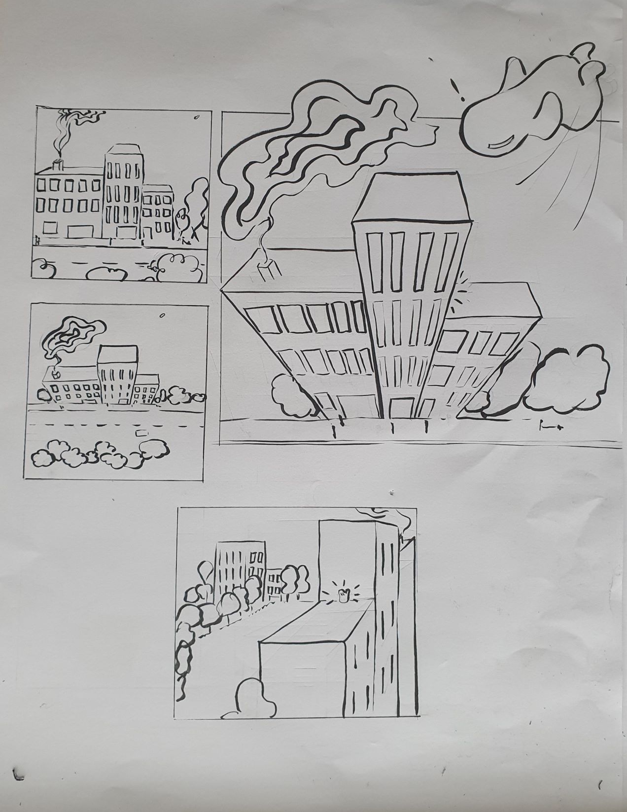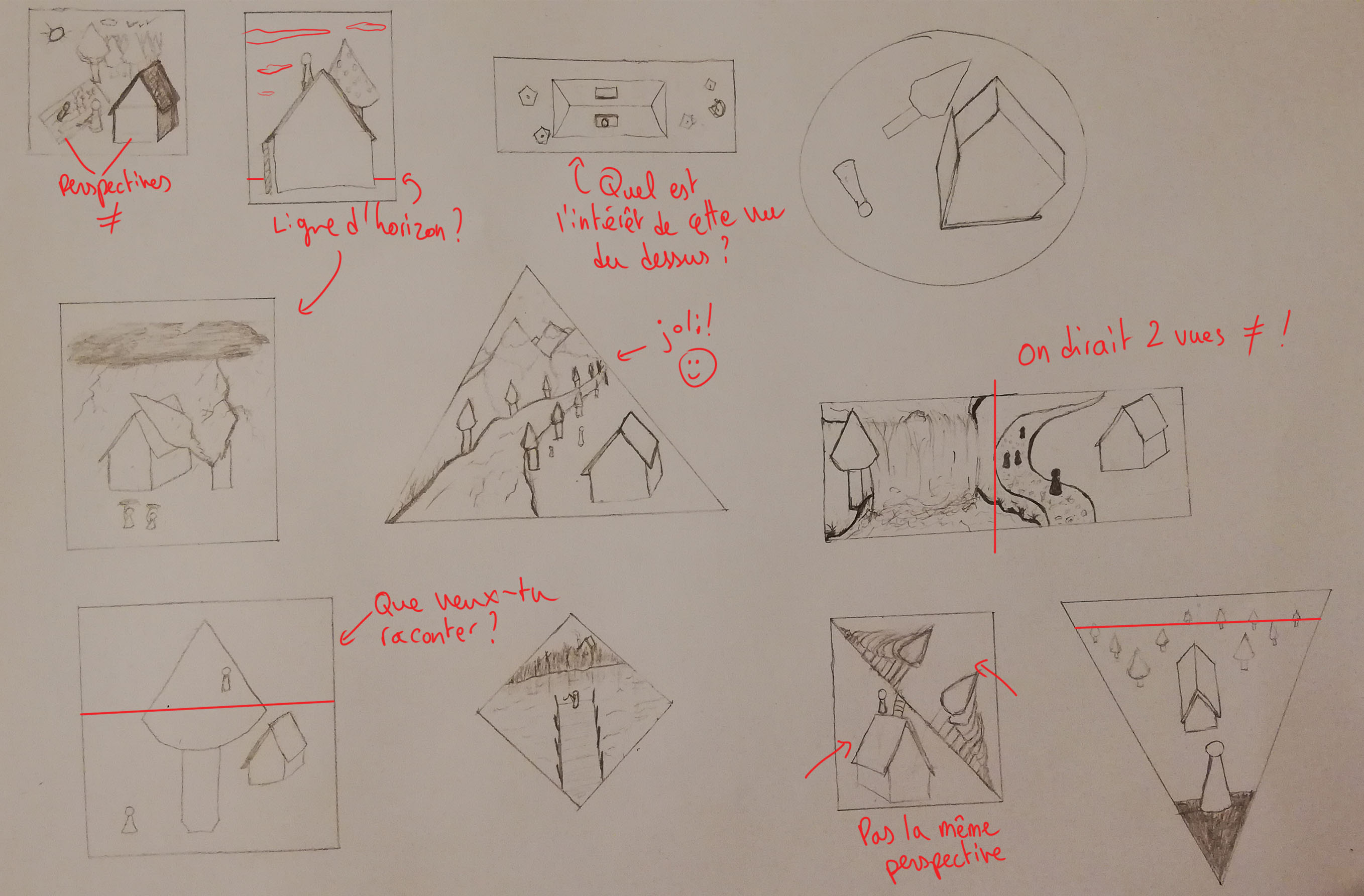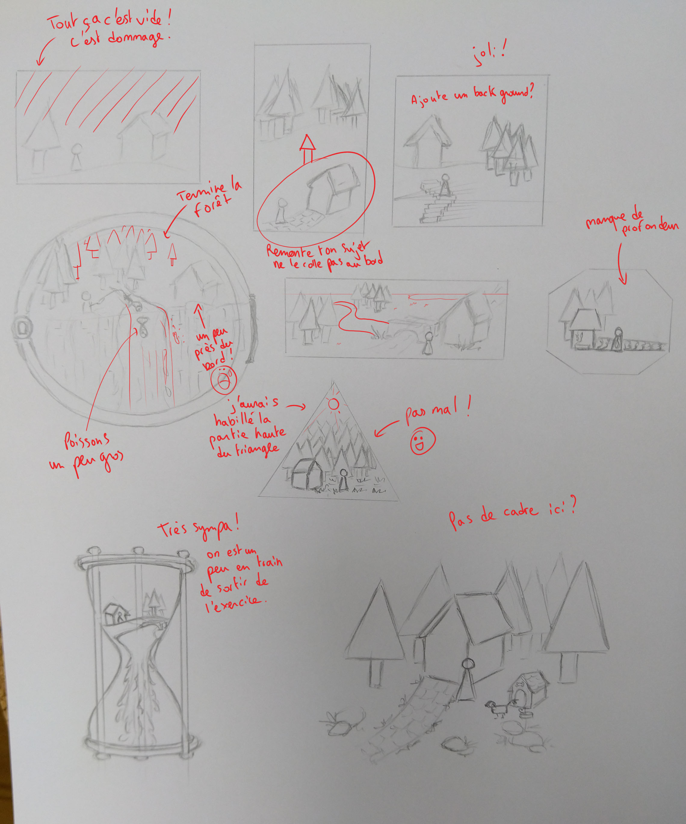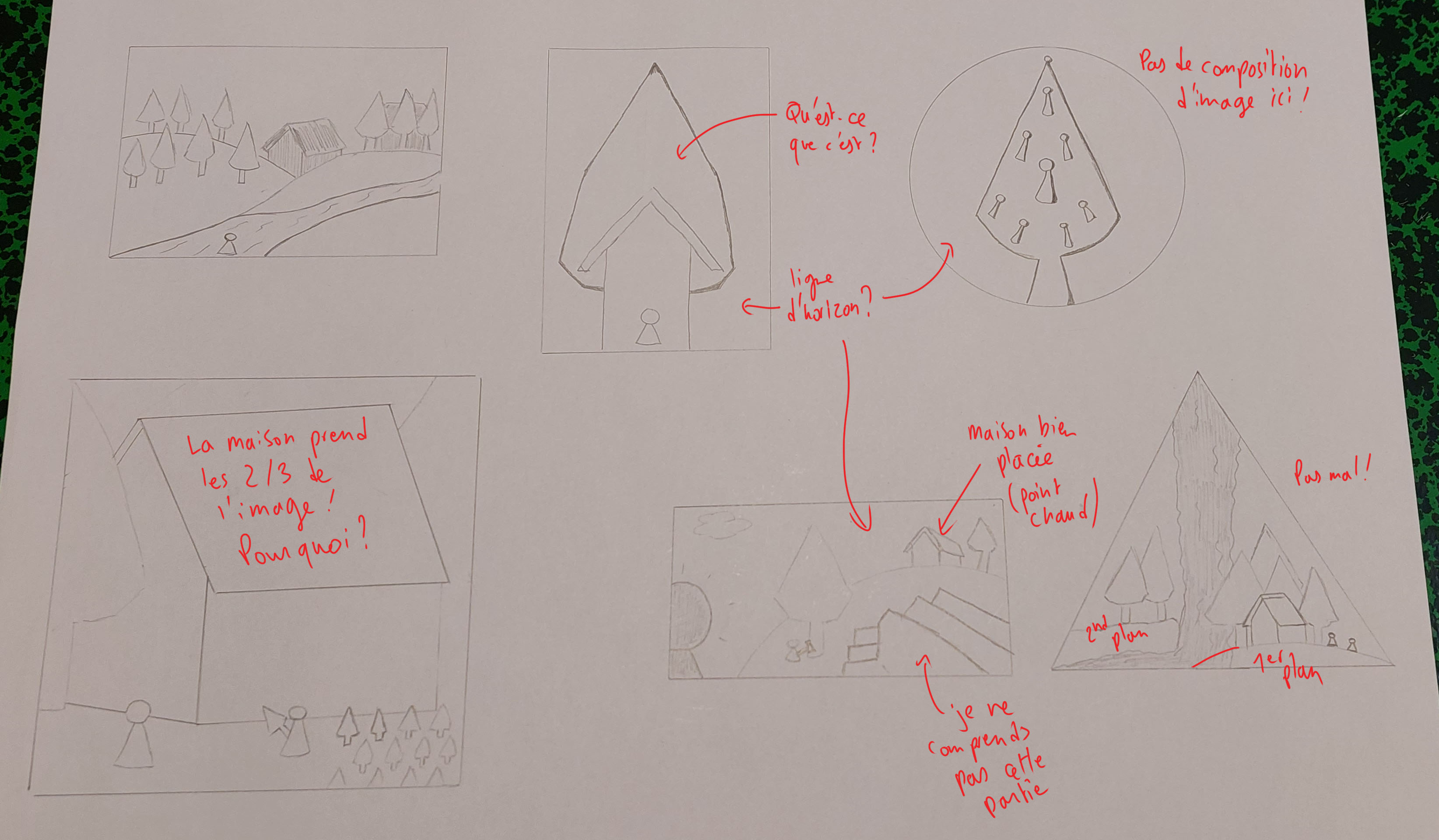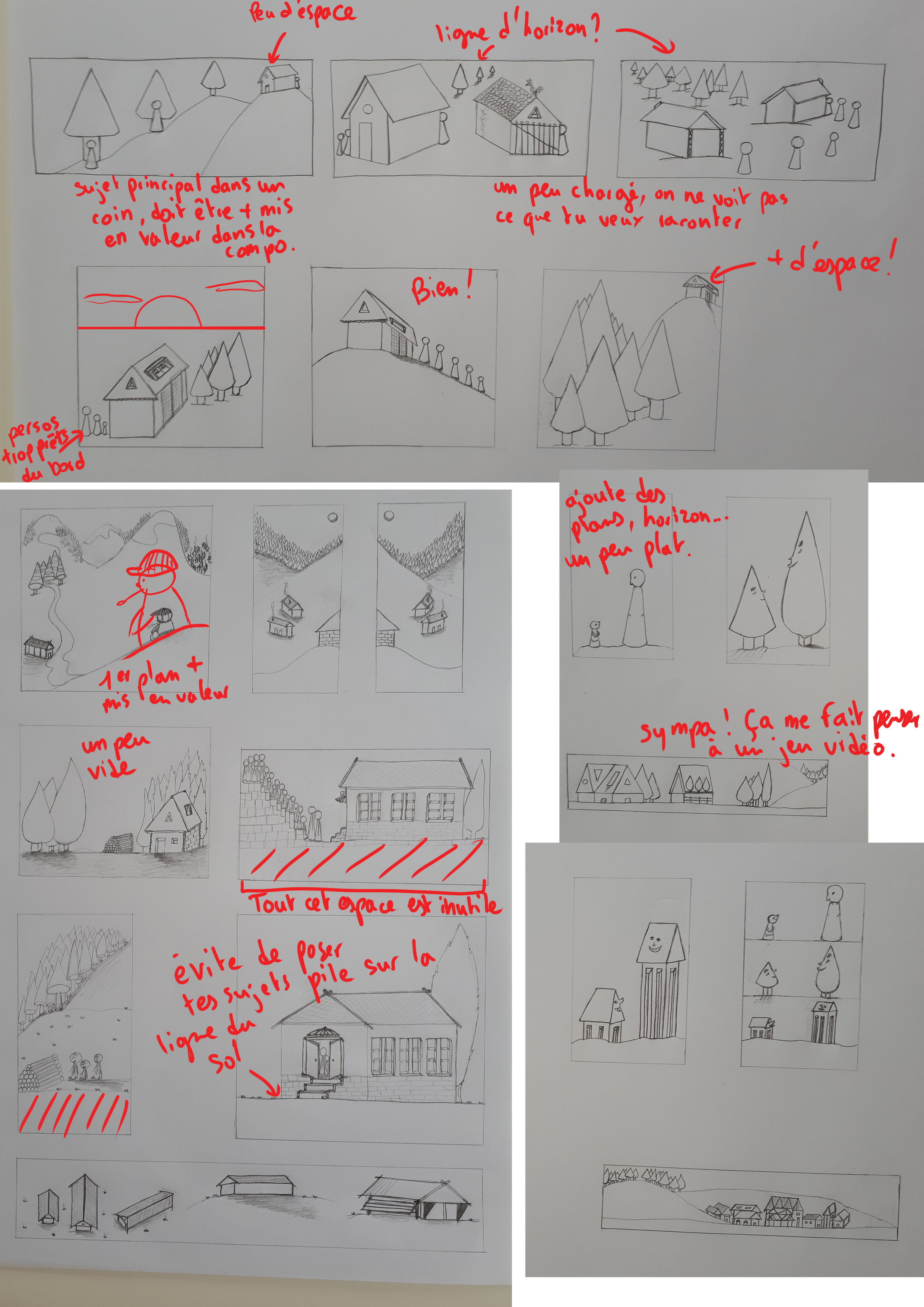 Bonjour Danteck, Tu as eu plein de bonnes idées, c'est cool ! Attention à bien placer ta ligne d'horizon, c'est elle qui va déterminer le sens de ton image et vers quoi vont aller tes éléments, elle va t'aider à construire ton image. Tu as pas mal de vides dans tes dessins, c'est dommage! Pose-toi la question de qu'est-ce que tu veux raconter. La composition et le placement des éléments dans ton image doivent servir ton propos :) Voici ma correction dessinée, j'espère que ça t'aidera :)