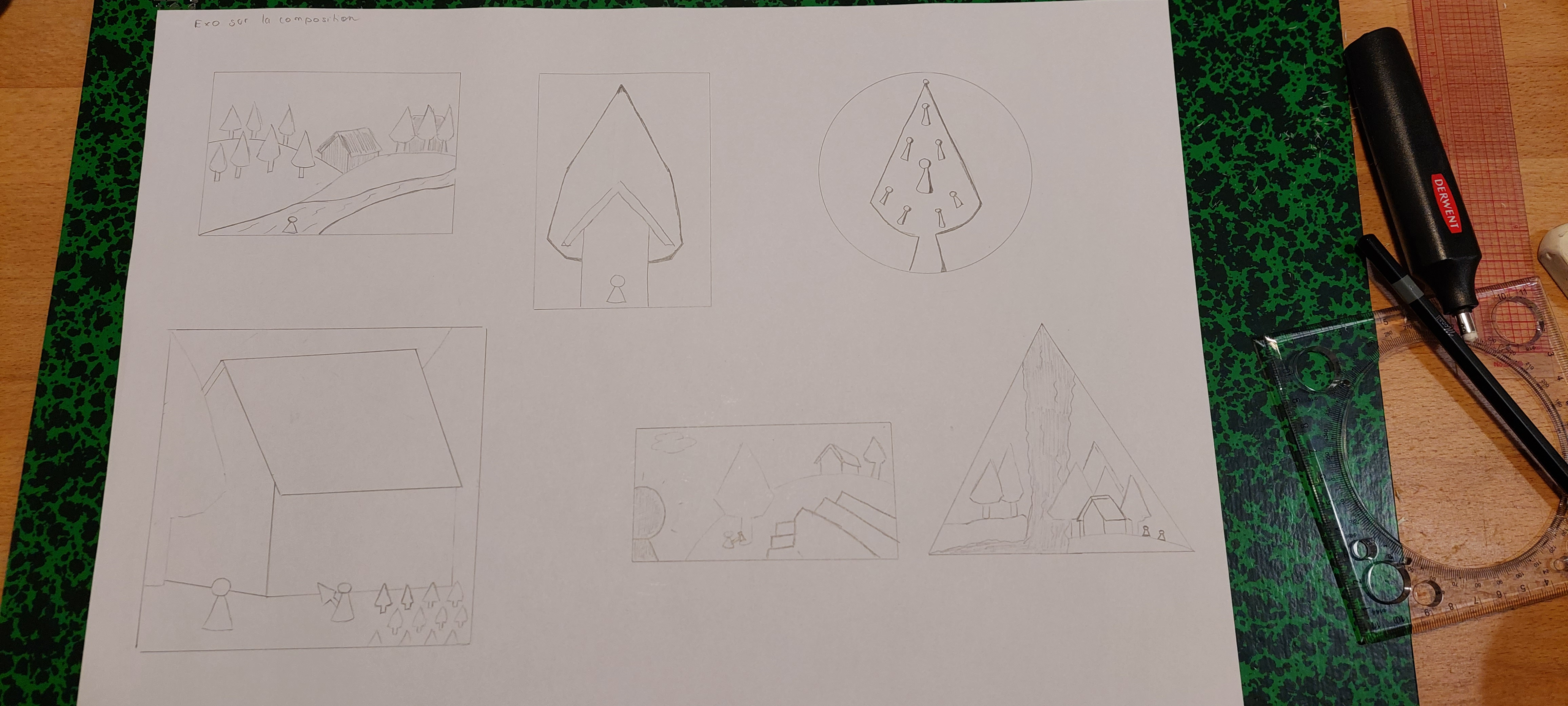 Bonjour Blueplatypus, Je pense que tu n'as pas bien compris l'objectif de cet exercice. Ici, on vous donne quelques éléments simples pour les mettre en valeur dans une image avec une composition intéressante. Pense à placer ta ligne d'horizon, un avant-plan, un arrière plan, des perspectives intéressantes ou simpleement placer l'élément principal dans un point chaud de l'image. Voici ma correction dessinée.