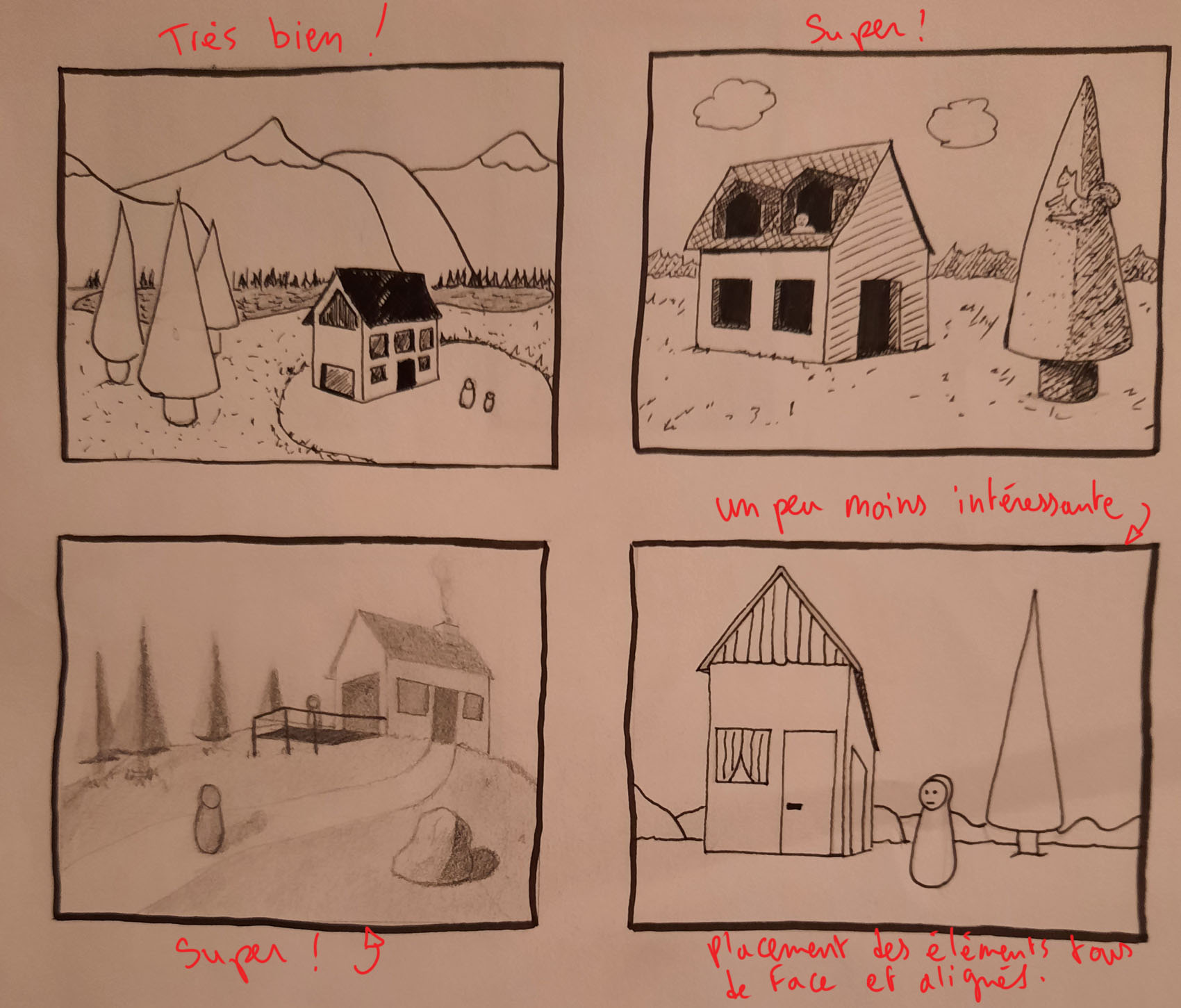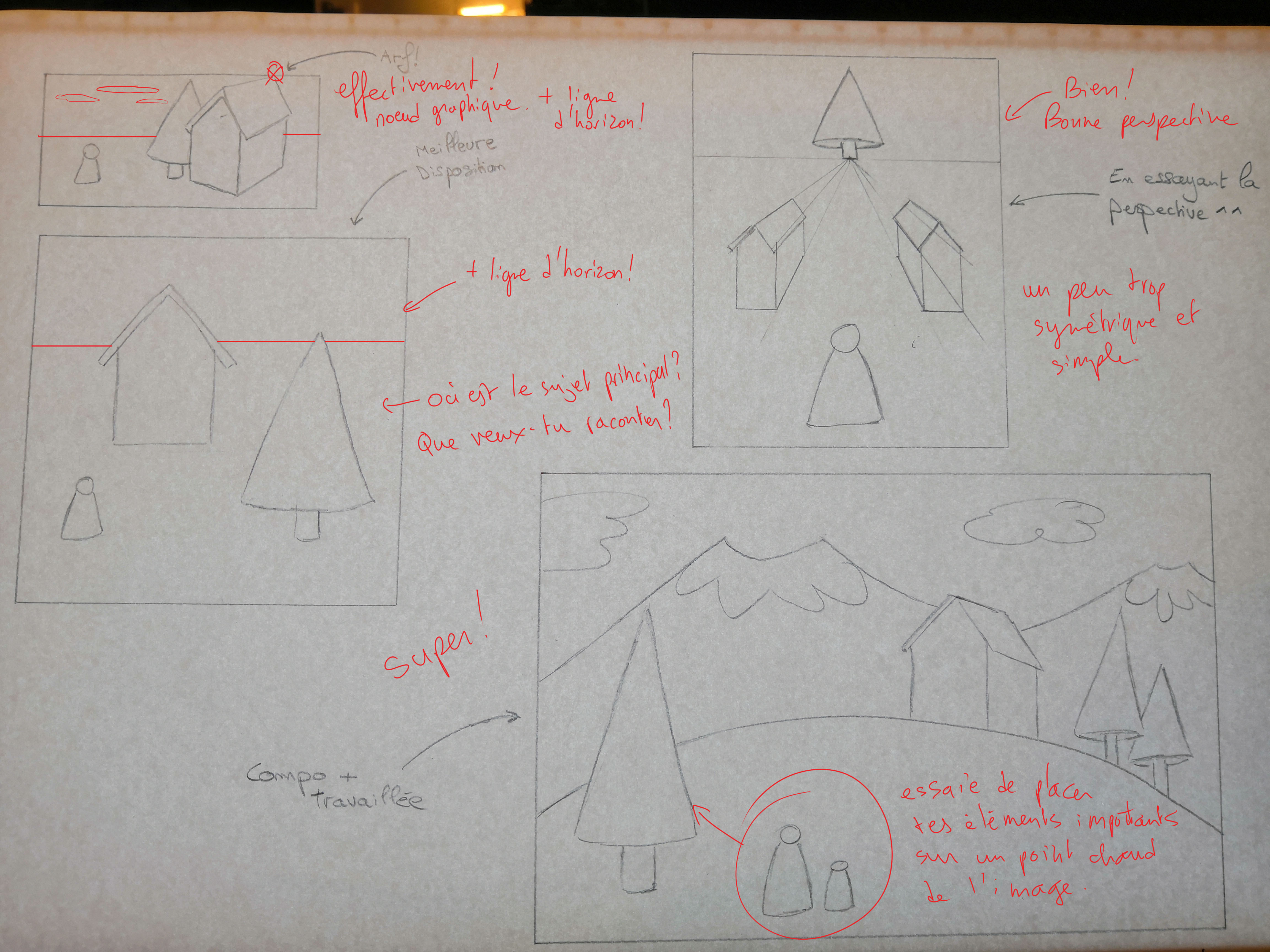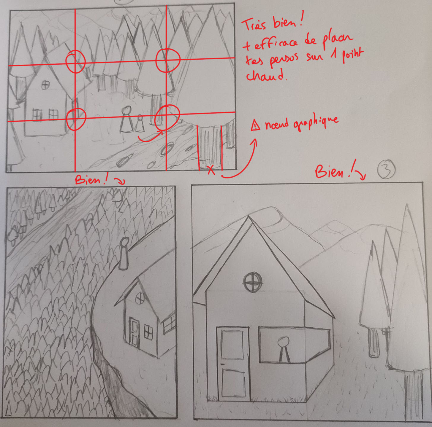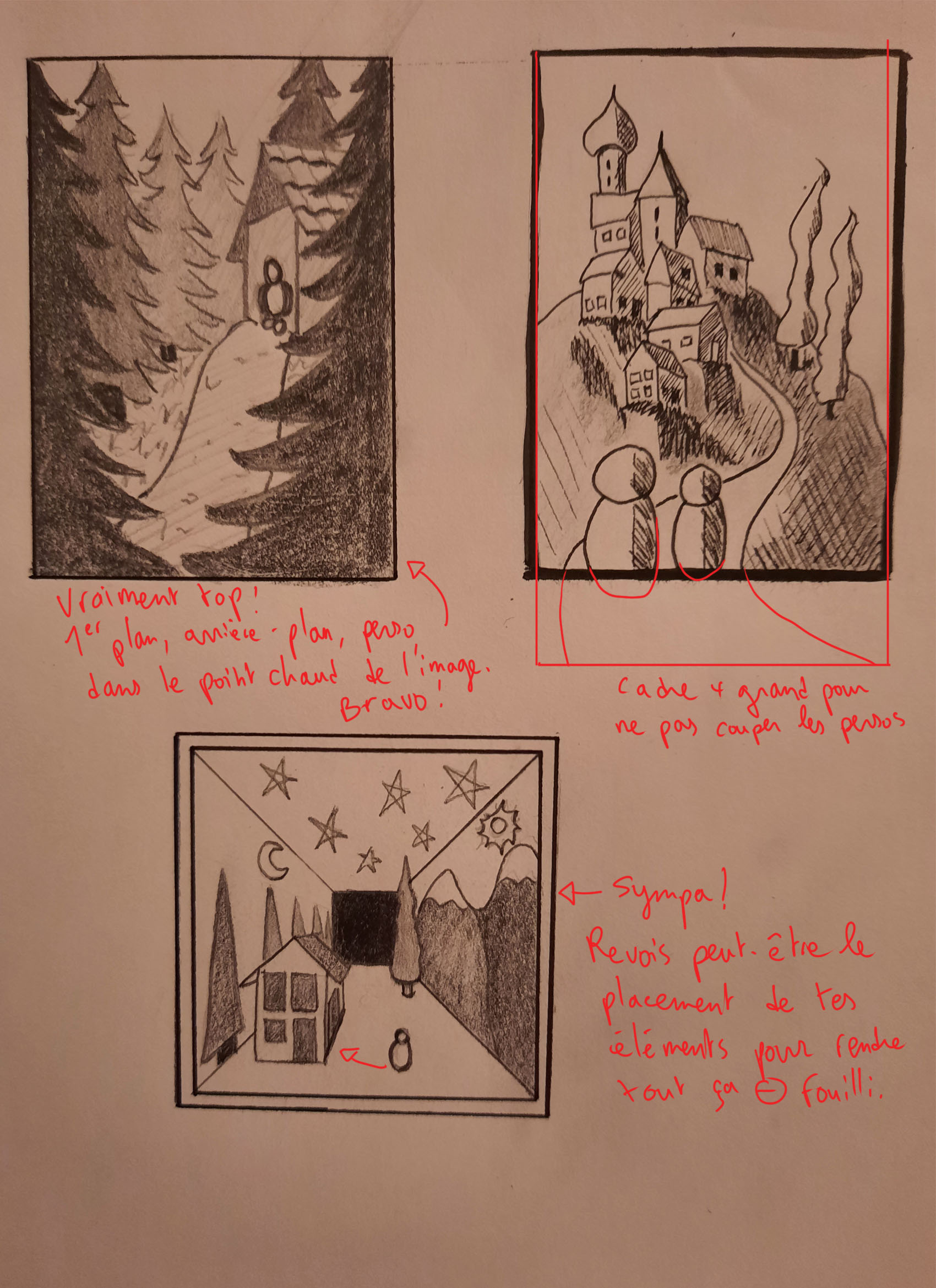 Tes mises en scènes sont vraiment poussées, j'aime beaucoup la première, avec ces arbres qui donnent de la profondeur, et le placement de la maison et d personnage qui est très lisible. Bravo, globalement c'est vraiment réussi. Voici mes observations dessinées.