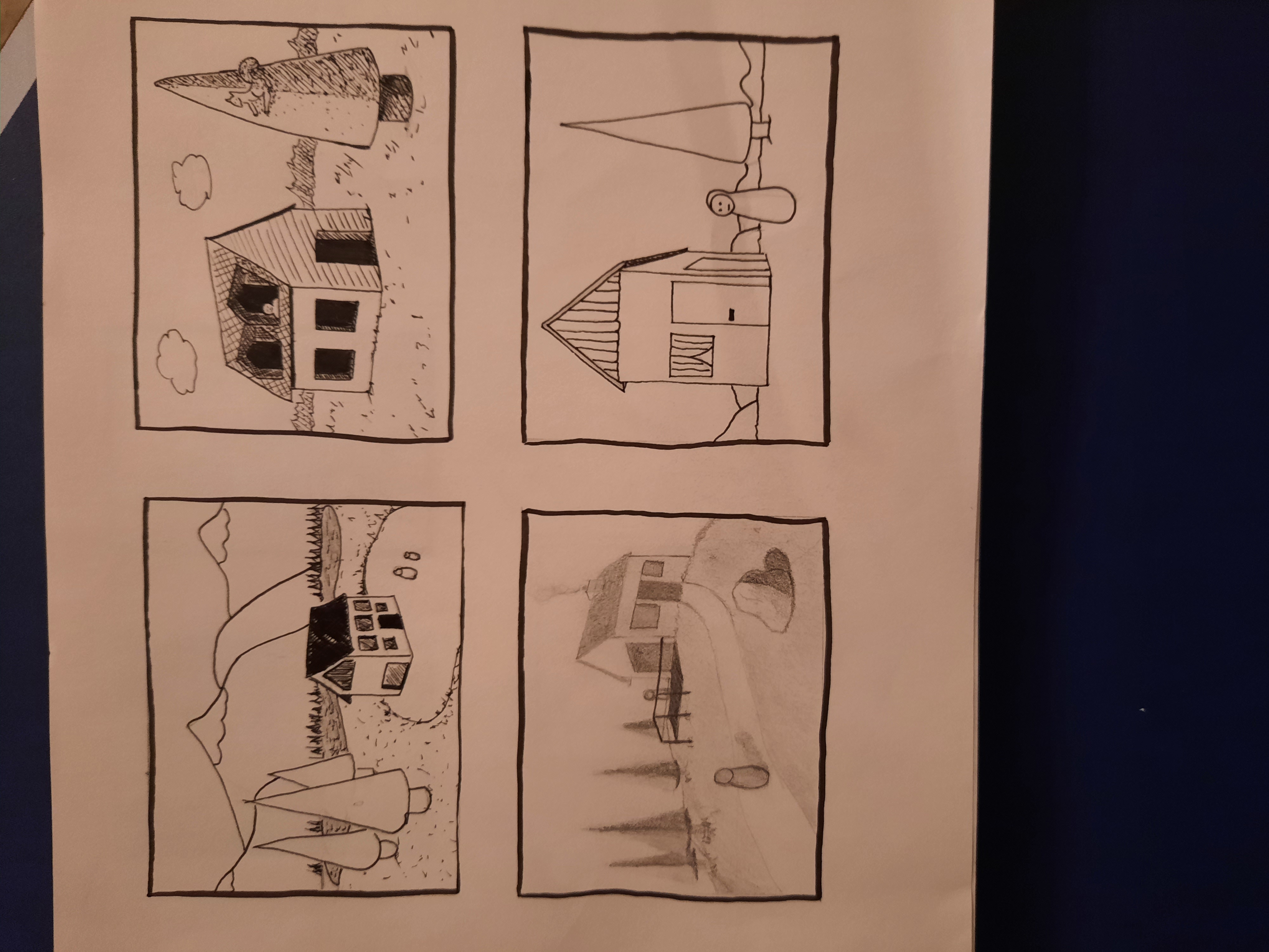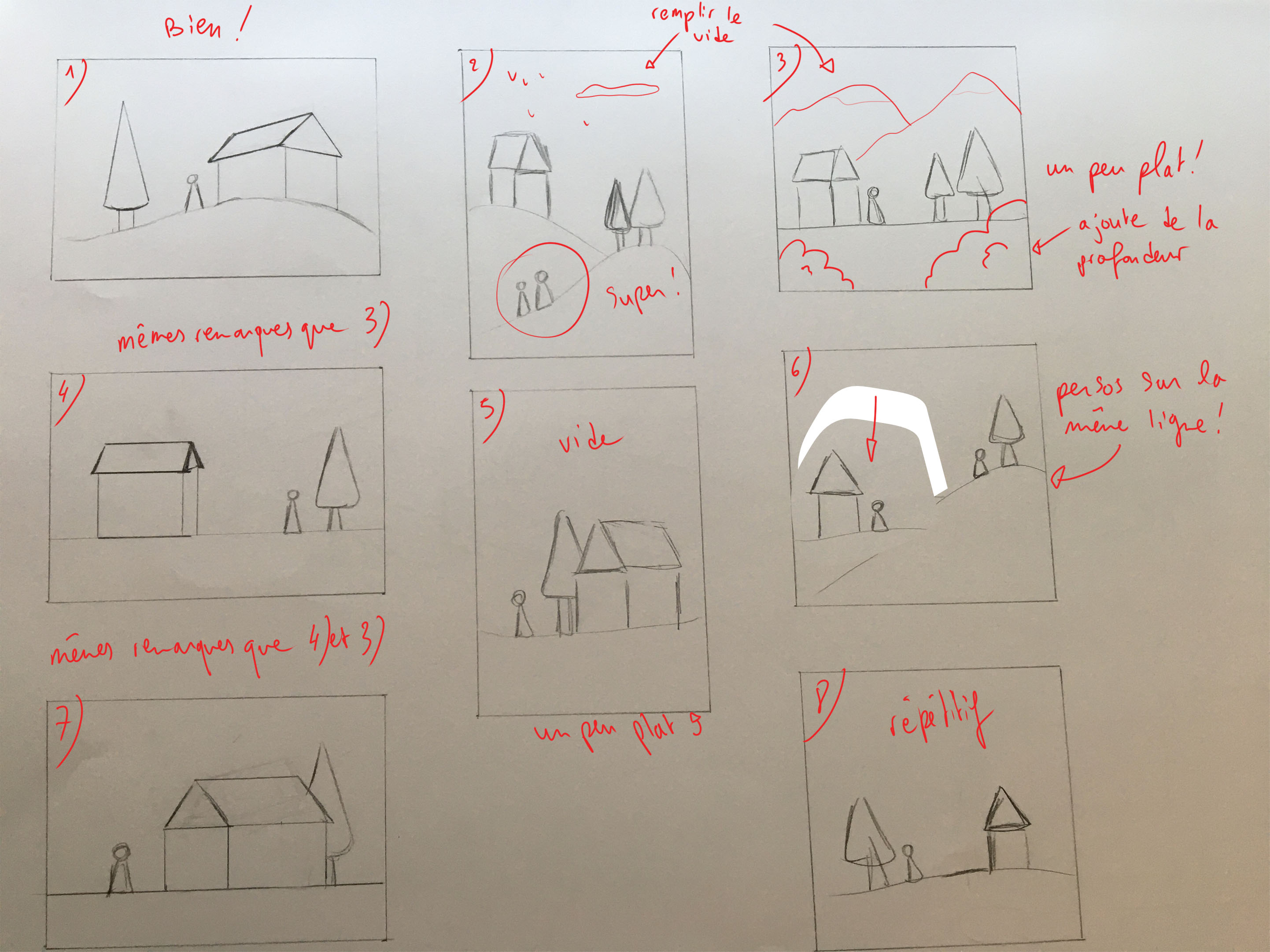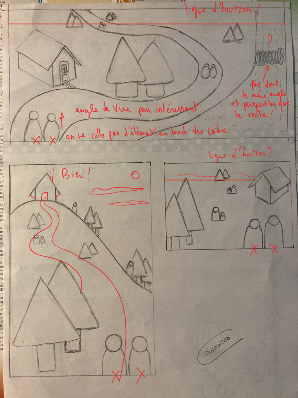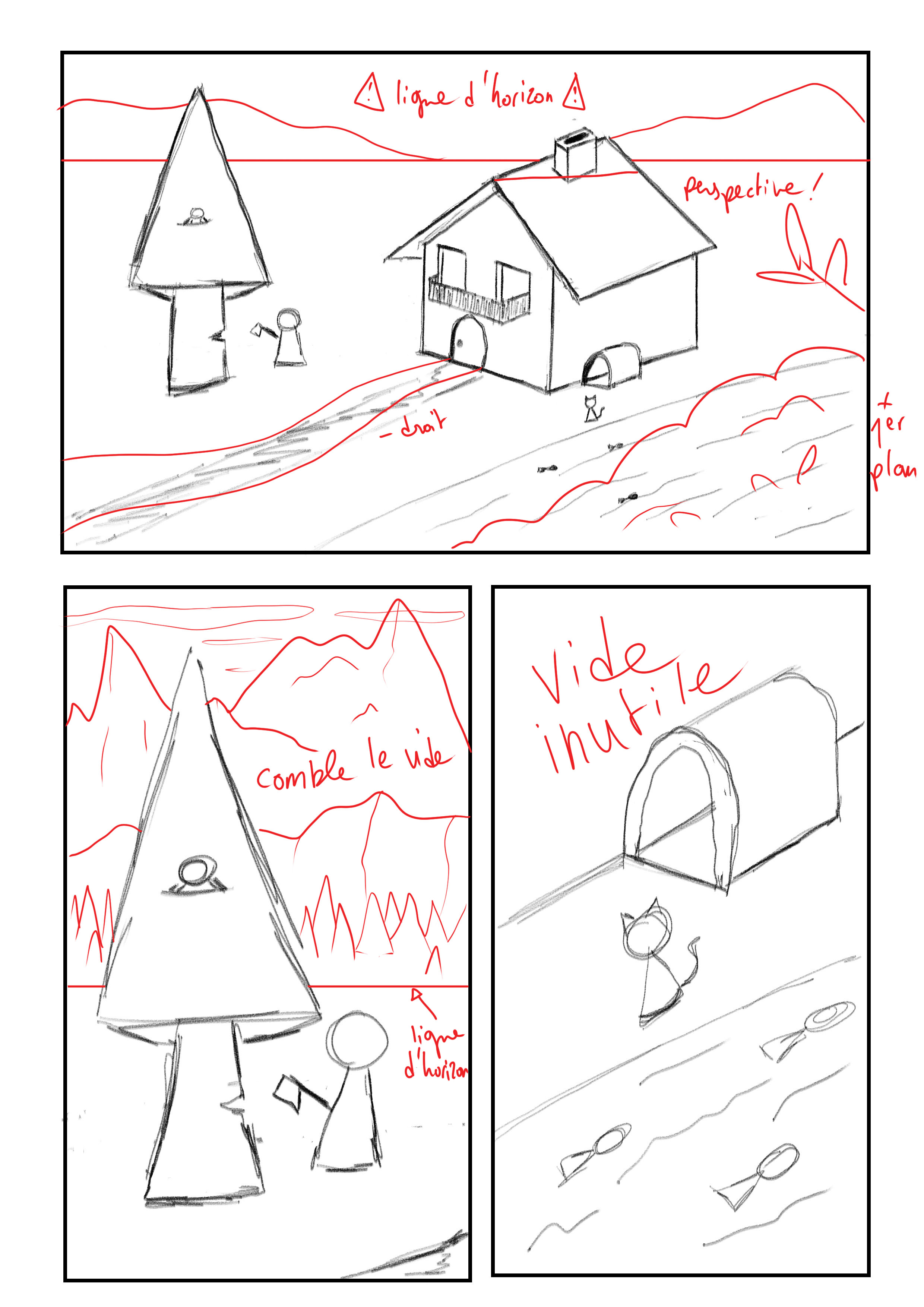 Tes mises en scènes sont vraiment poussées, j'aime beaucoup la première, avec ces arbres qui donnent de la profondeur, et le placement de la maison et d personnage qui est très lisible. Bravo, globalement c'est vraiment réussi. Voici mes observations dessinées.