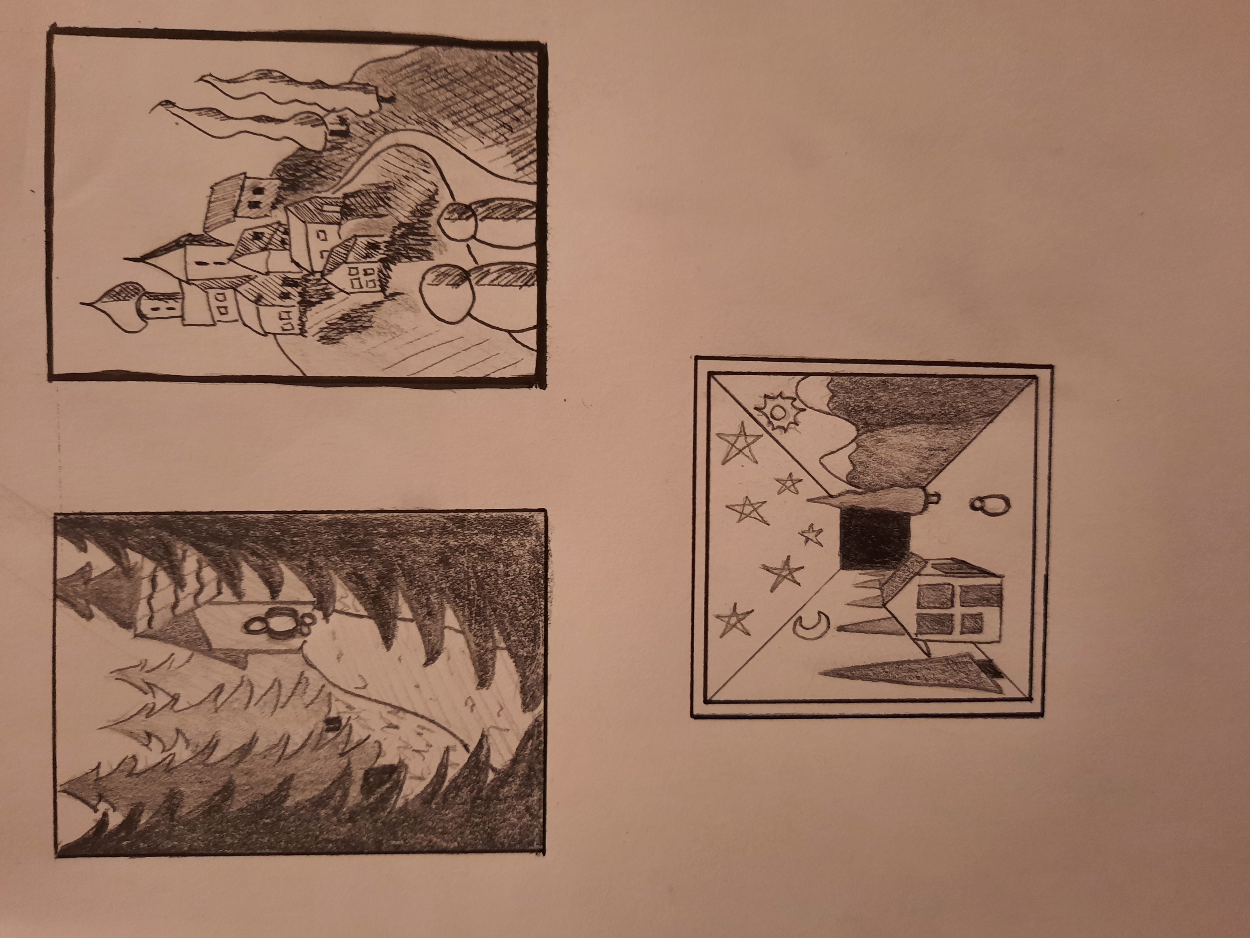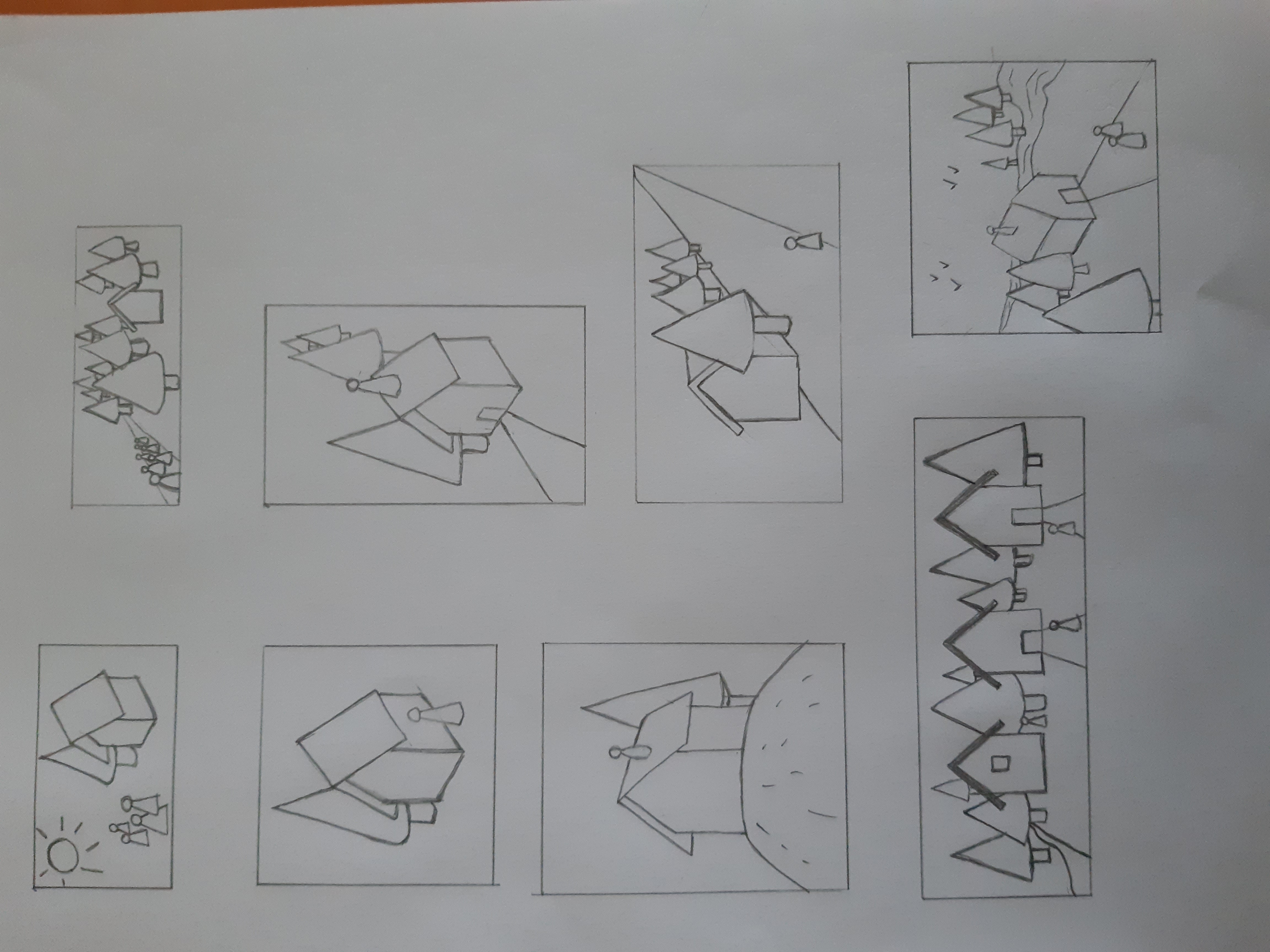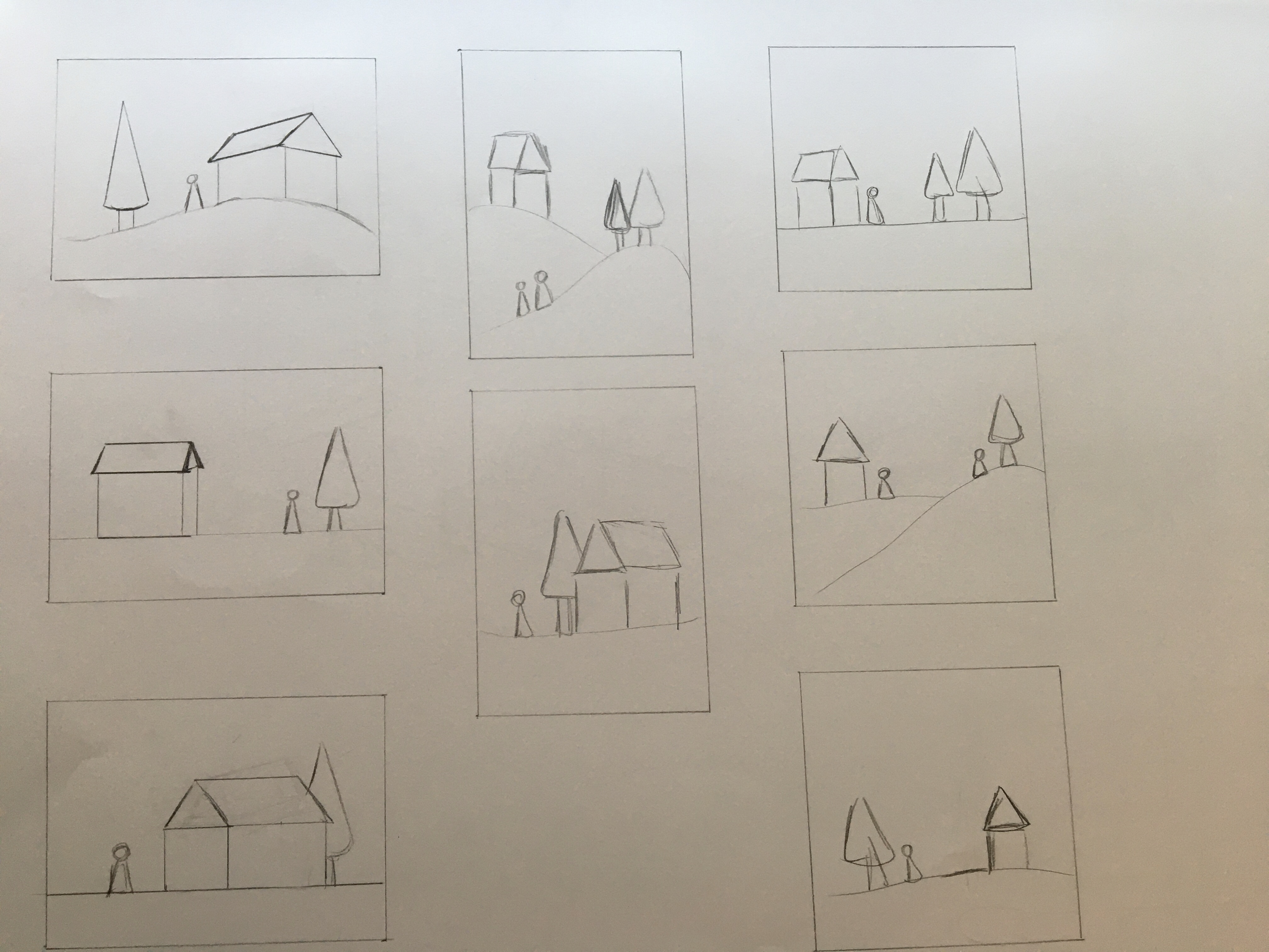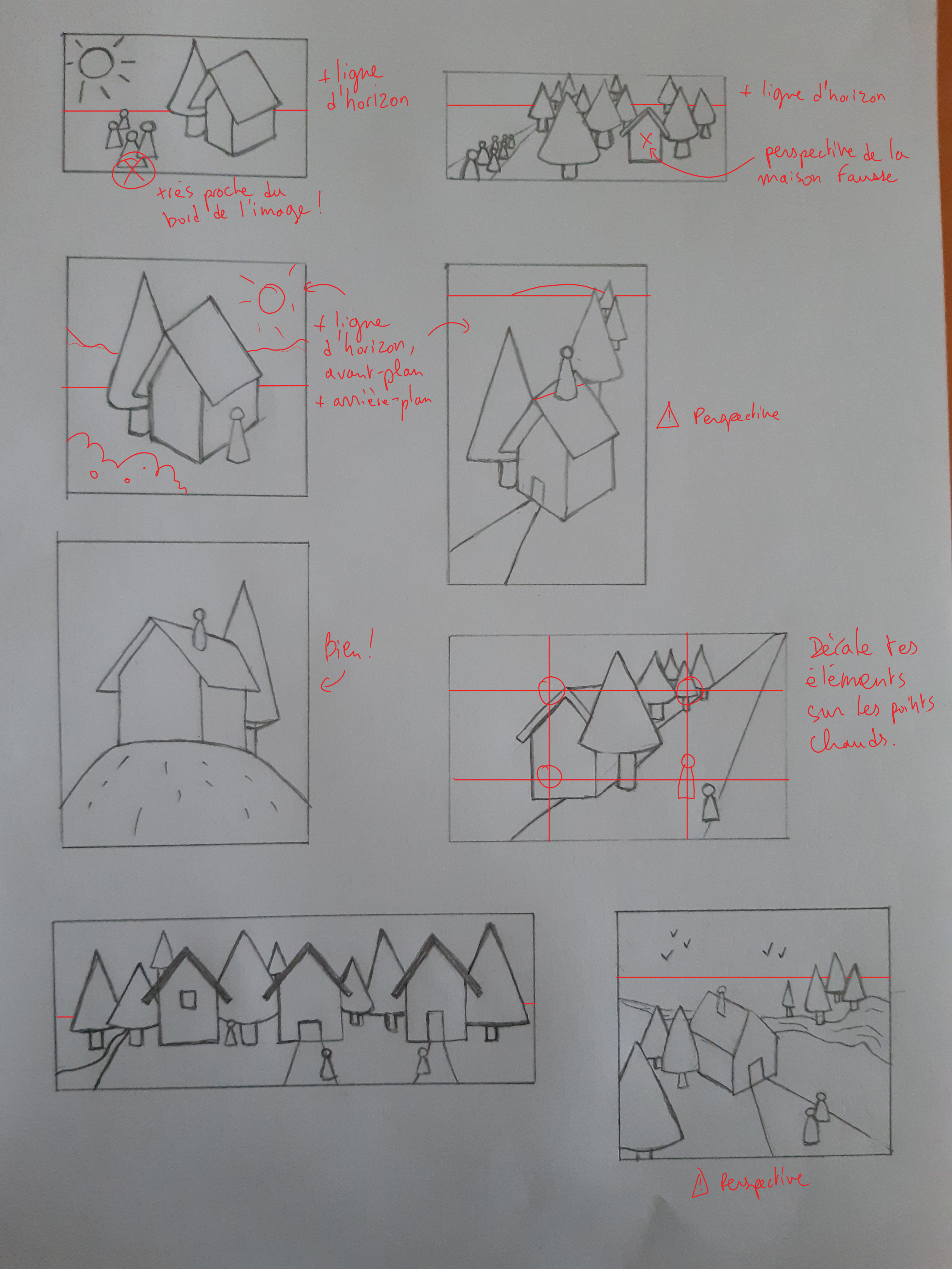 Tu as proposé de bonnes compositions, attention cependant à la perspective de tes objets (maisons et chemins) qui sont fausses pour la plupart. Dessiner la ligne d'horizon t'aidera dans ce sens.
