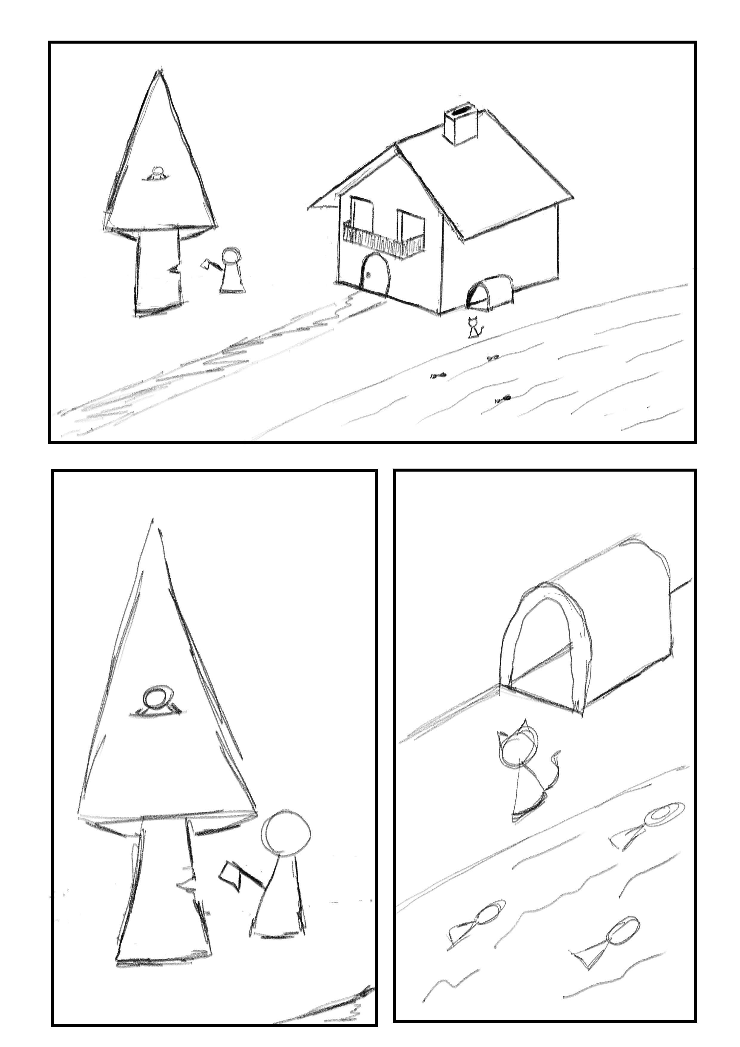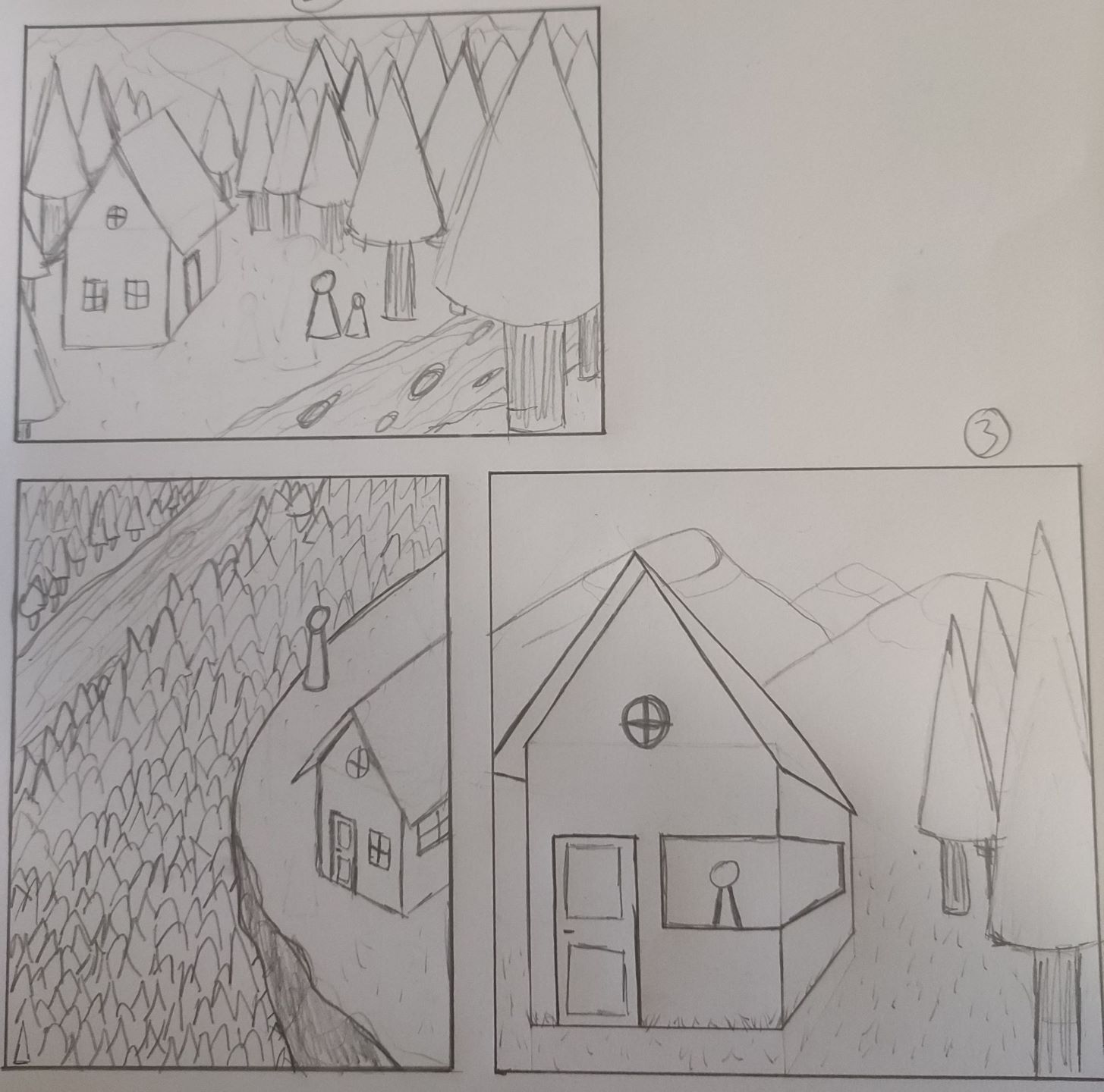 Your staging is really sophisticated. I really like the first one, with the trees that add depth, and the positioning of the house and character which is very clear. Well done, overall it's really successful. Here are my drawn observations.