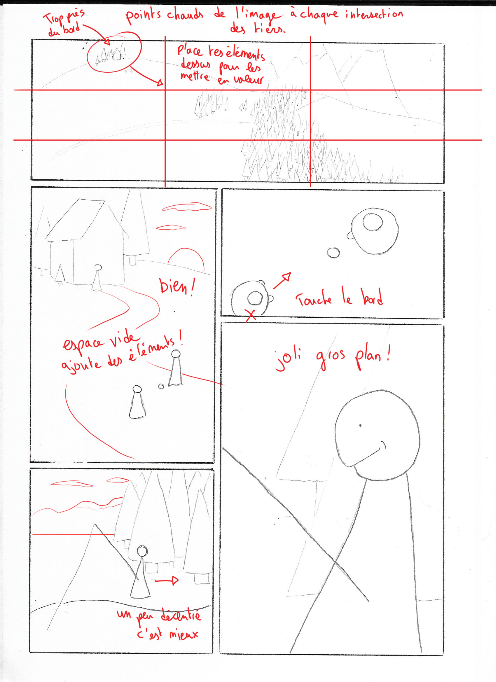 Bonjour LeyluIAA, Tes compos sont vraiment pas mal, attention à bien placer une ligne d'horizon, un premier plan, arière-plan et de placer tes éléments importants sur les points chauds de ton image. Voici ma correction dessinée.