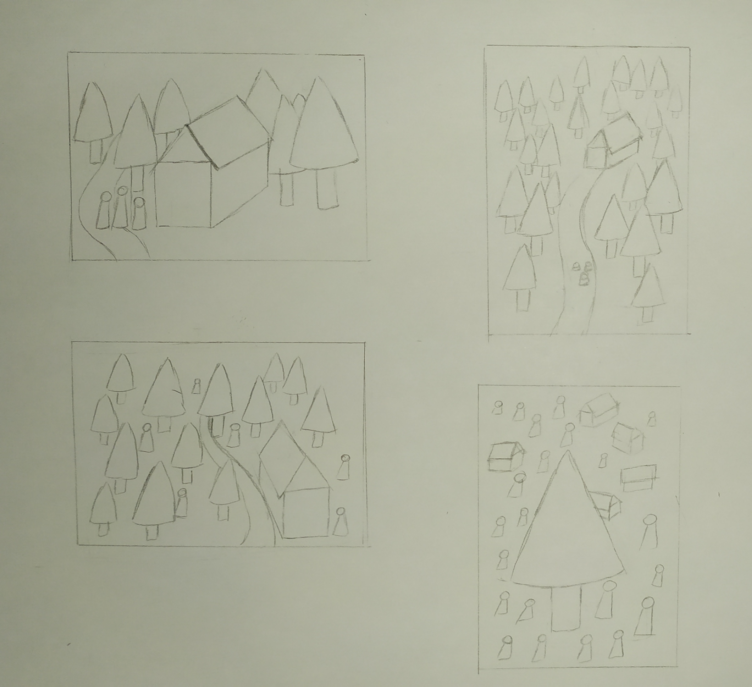Hello Laulau, Your idea of varying the number of elements and their size is really good, but it does not always serve your compositions well. The last one is particularly very intricate. In seeking a composition, we try to highlight a narrative, something that you want to convey. The placement and size of elements in the image should serve this purpose. Position your horizon line well in your drawings, it more easily grounds the objects in their setting. You can also play with depth, by placing a distant setting, clouds, and also a foreground very close to the viewer's point of view. I'll show you what this would look like on one of your comps.