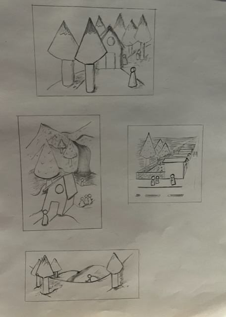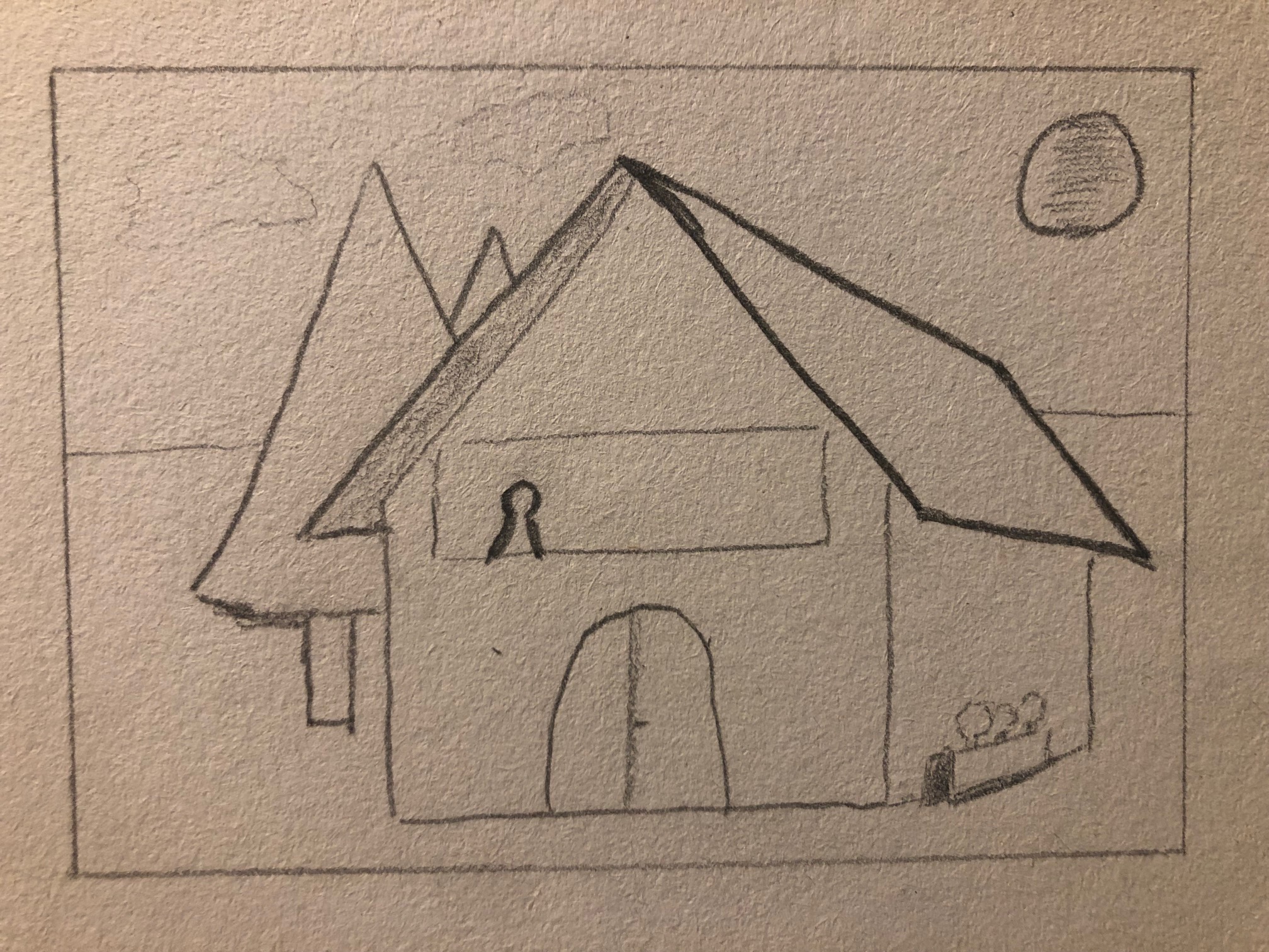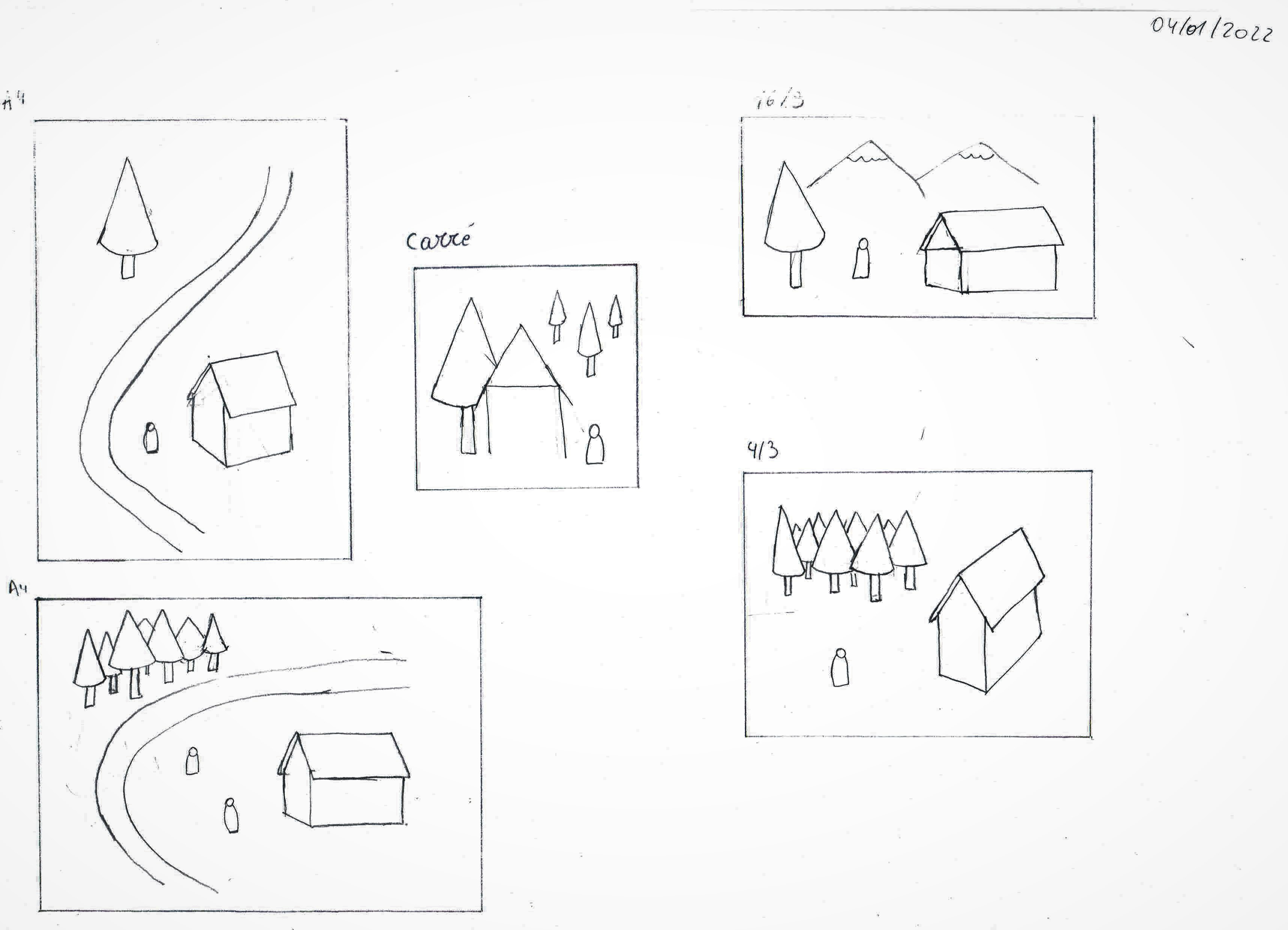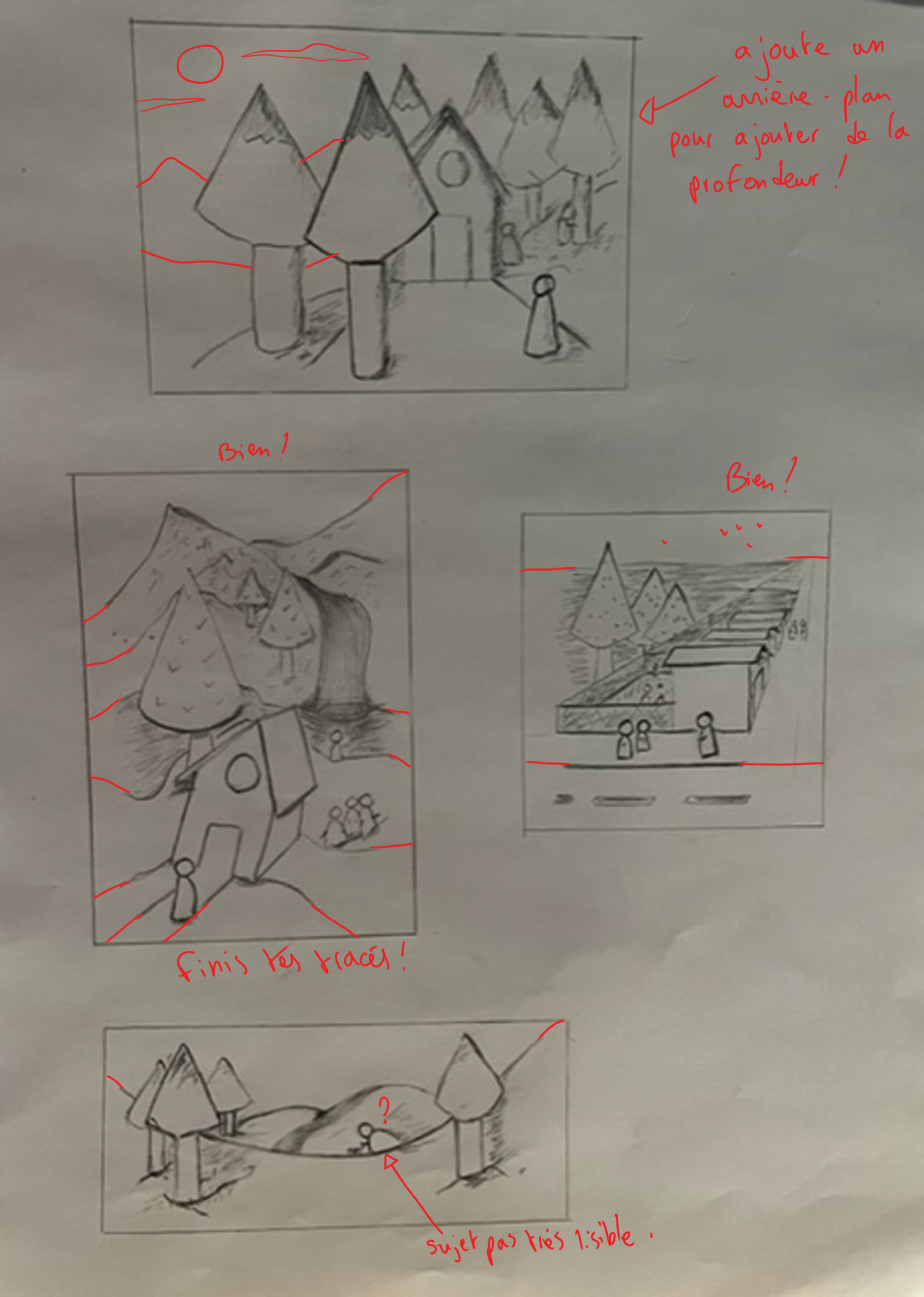 Bonjour Kinou, La prochaine fois, regroupe toutes tes pochades sur une même image, ça simplifiera la correction ;) Pour cette première image, Je trouve que ta maison est un peu trop rapprochée, elle occupe presque tout le cadre ! Tu pourrais peut-être la reculer un peu, et ajouter des éléments en premier plan pour donner plus de profondeur? :) Attention, le tronc de ton arbre n'est pas en son centre, le feuillage est décalé ^^