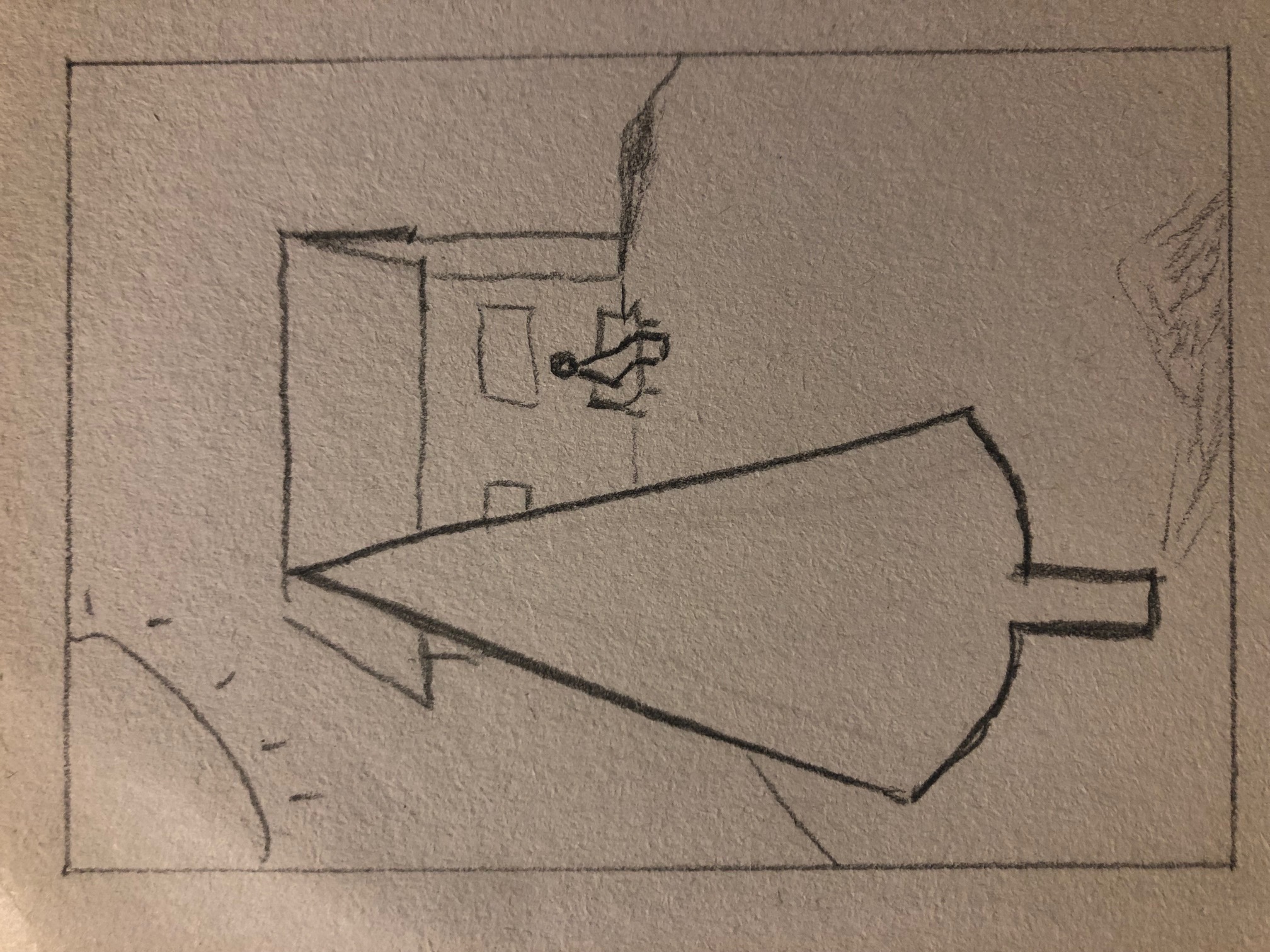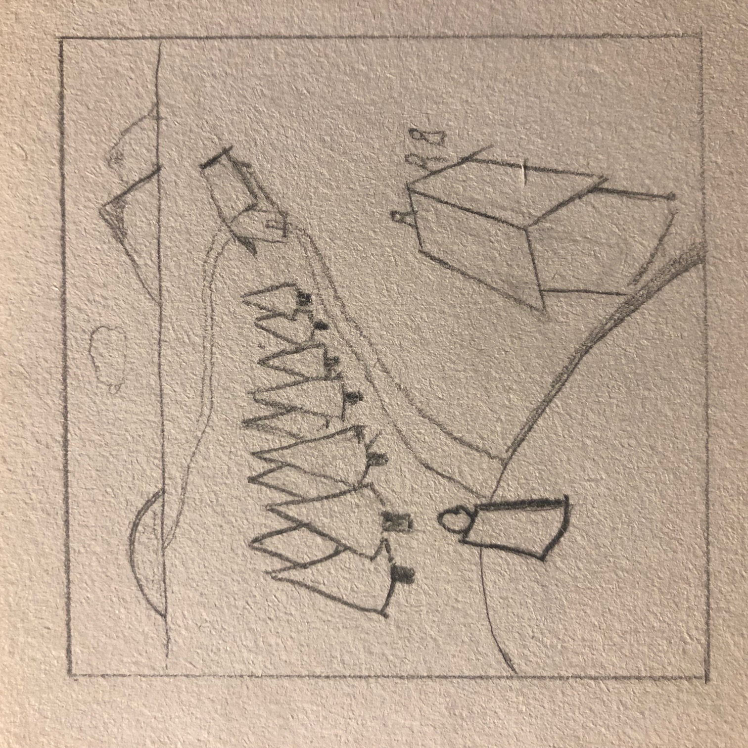 Bonjour Laulau, Ton idée de varier le nombre d'éléments et leur taille est vraiment bonne, mais ne servent pas toujours tes compositions. La dernière est notemment très fouillie. Dans une recherche de composition, on essaie de mettre en valeur un récit, quelque chose que l'on veut raconter. La place et la taille des éléments dans l'image doivent servir ce propos. Place bien ta ligne d'horizon dans tes dessins, ça encre plus facilement les objets dans leur décor. Tu peux aussi jouer avec la profondeur, en plaçant un décor lointain, des nuages, et aussi un premier plan très proche du point de vue du spectateur. Je te montre ce que ça donnerait sur une de tes compos.