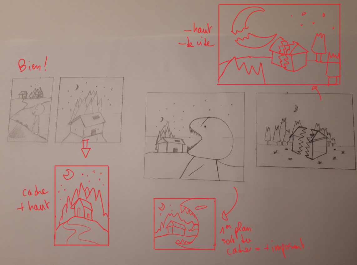 Bonjour Nanoue, Voici ma correction, globalement, il faut que tu penses à la lisibilité de ton image par rapport aux éléments que tu choisis. Si tu fais des éléments hauts, choisis un cadre plus haut, pour que ça respire plus. Joue aussi avec les premiers plans, ça donnera de la profondeur à ton dessin.