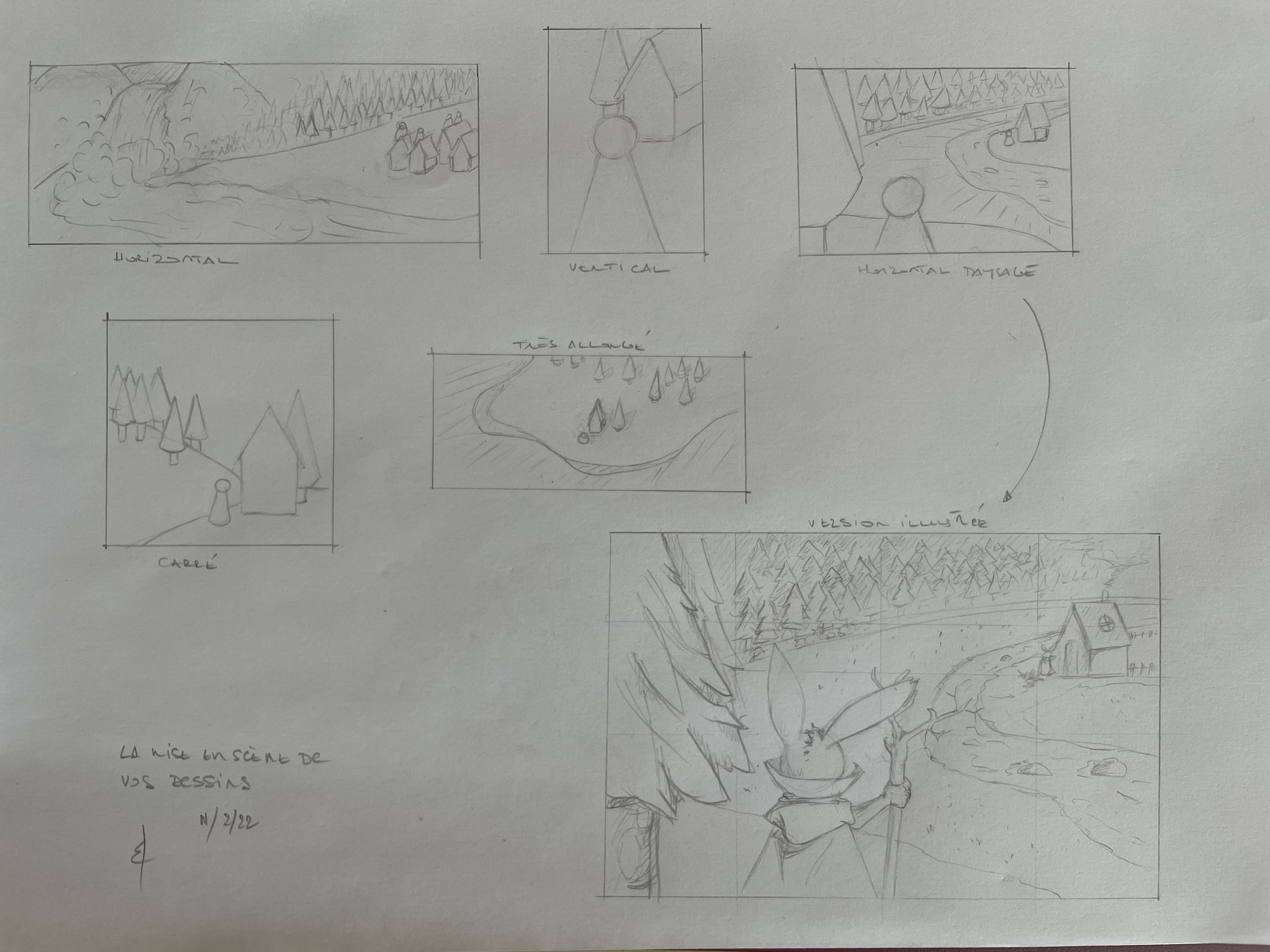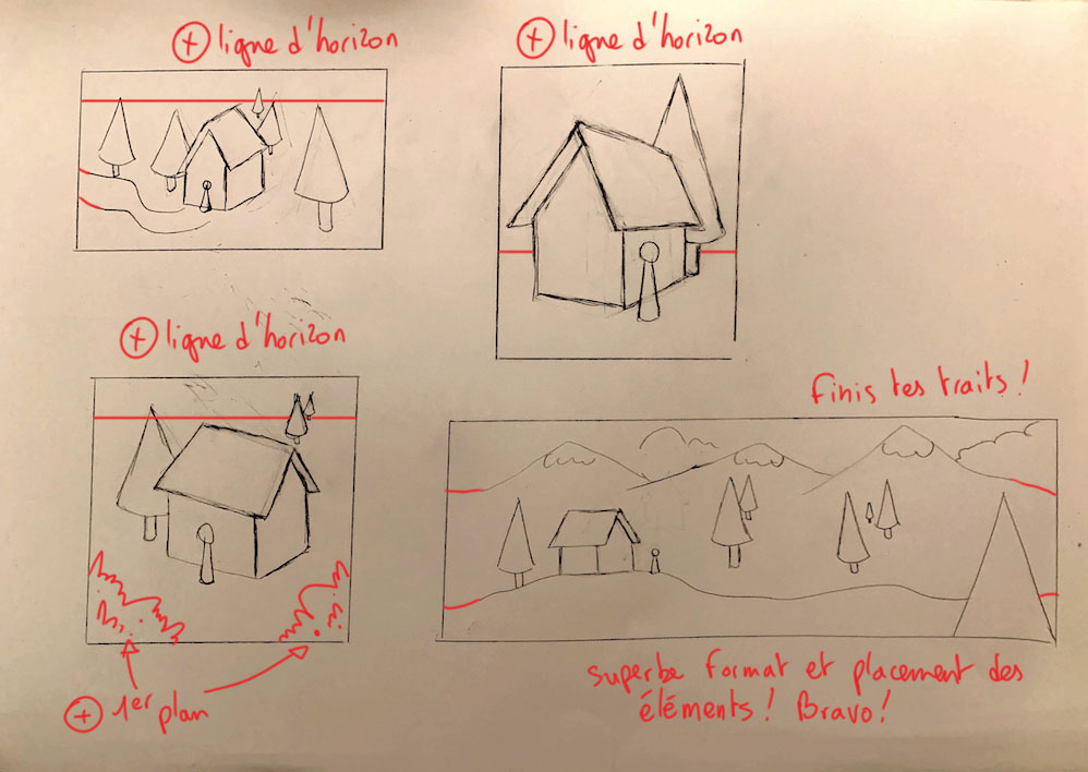 Bonjour Mysto, Tes propositions sont très sympa ! Pour les améliorer, je te conseillerai de bien tracer ta ligne d'horizon à chaque fois, ou du moins un décor au fond qui donnera de la profondeur à ta composition. Su ta premère proposition, tu pourrais décentrer la maison sur la gauche pour une meilleure lecture de l'image. Attention également à ta perspective (dernier dessin) et à placer tes éléments importants sur les points chauds de ton image. Sinon, c'est vraiment pas mal bravo !