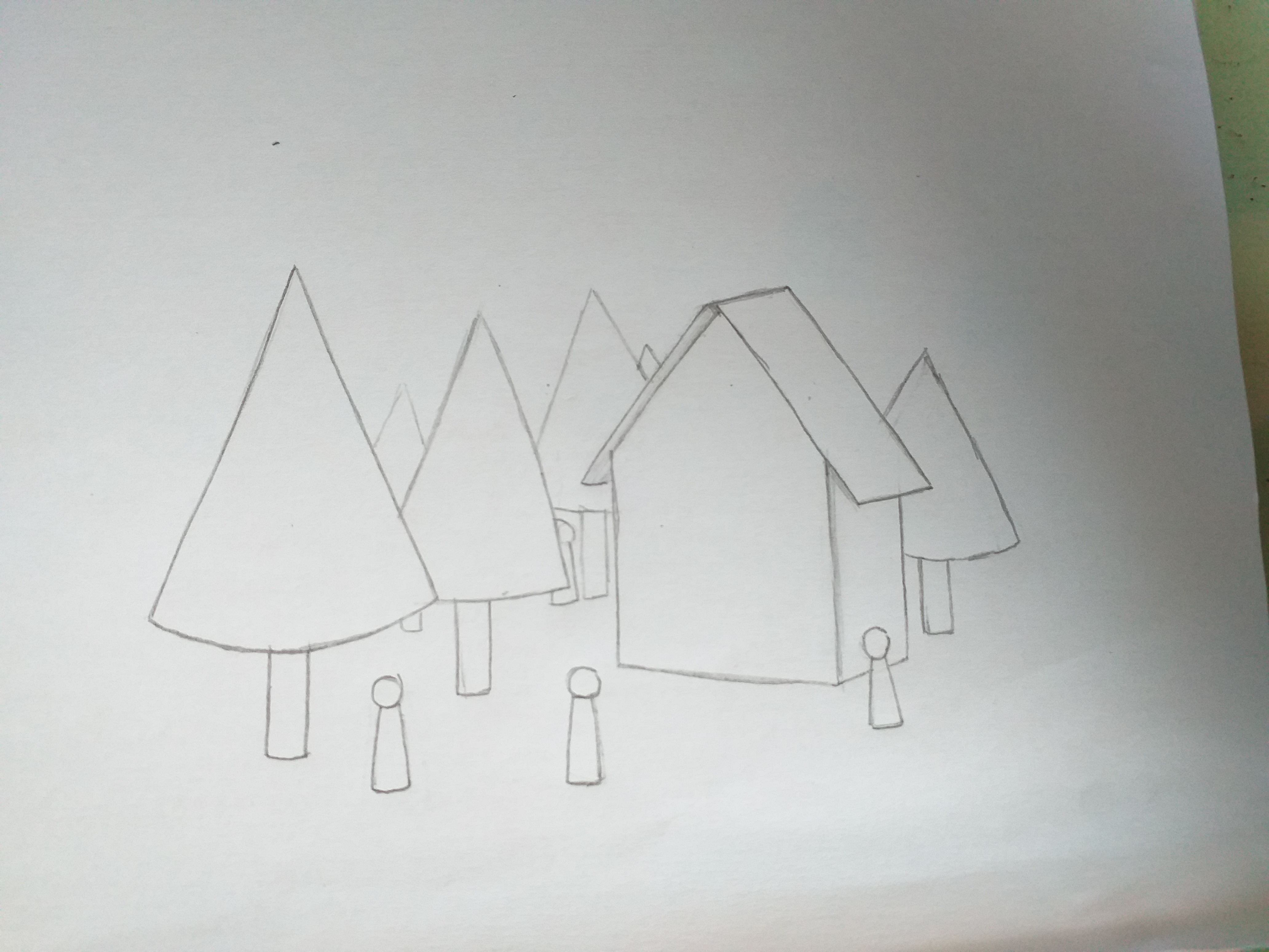 J'aurais juste peut-être placé différemment le petit village au pieds des sapins (deuxième dessin en partant de la gauche) car il est un peu "coincé" dans le coin de ton image.
