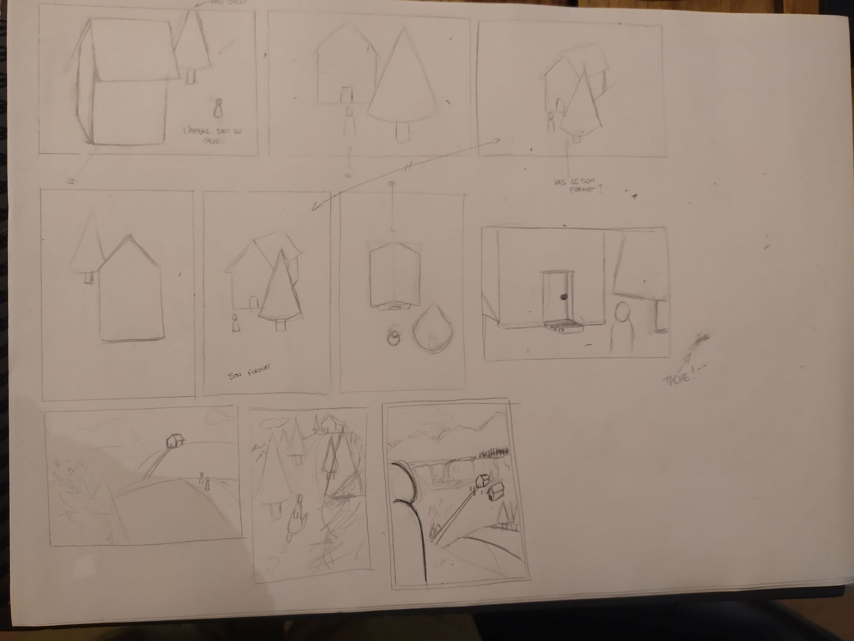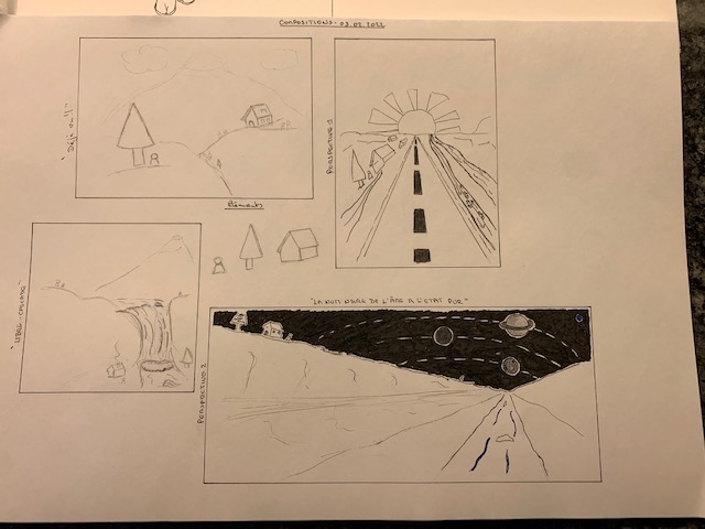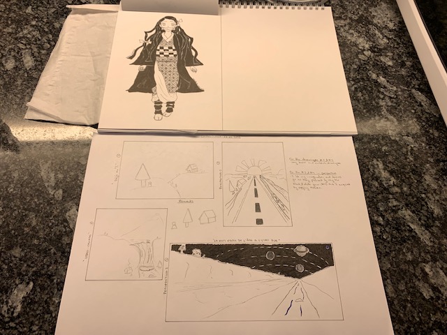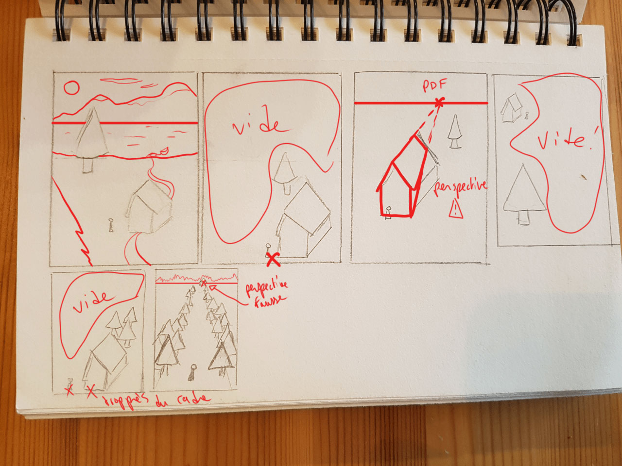 Sur la 1ère photo j'ai fait un plan du comment je voyais mes futures illustrations en m'obligeant à aussi jouer sur des perspectives. J'ai fait exprès de tracer les cadres au feutre afin de pouvoir effacer mes dessins au crayon sans à devoir refaire le pourtour de mes bordures.