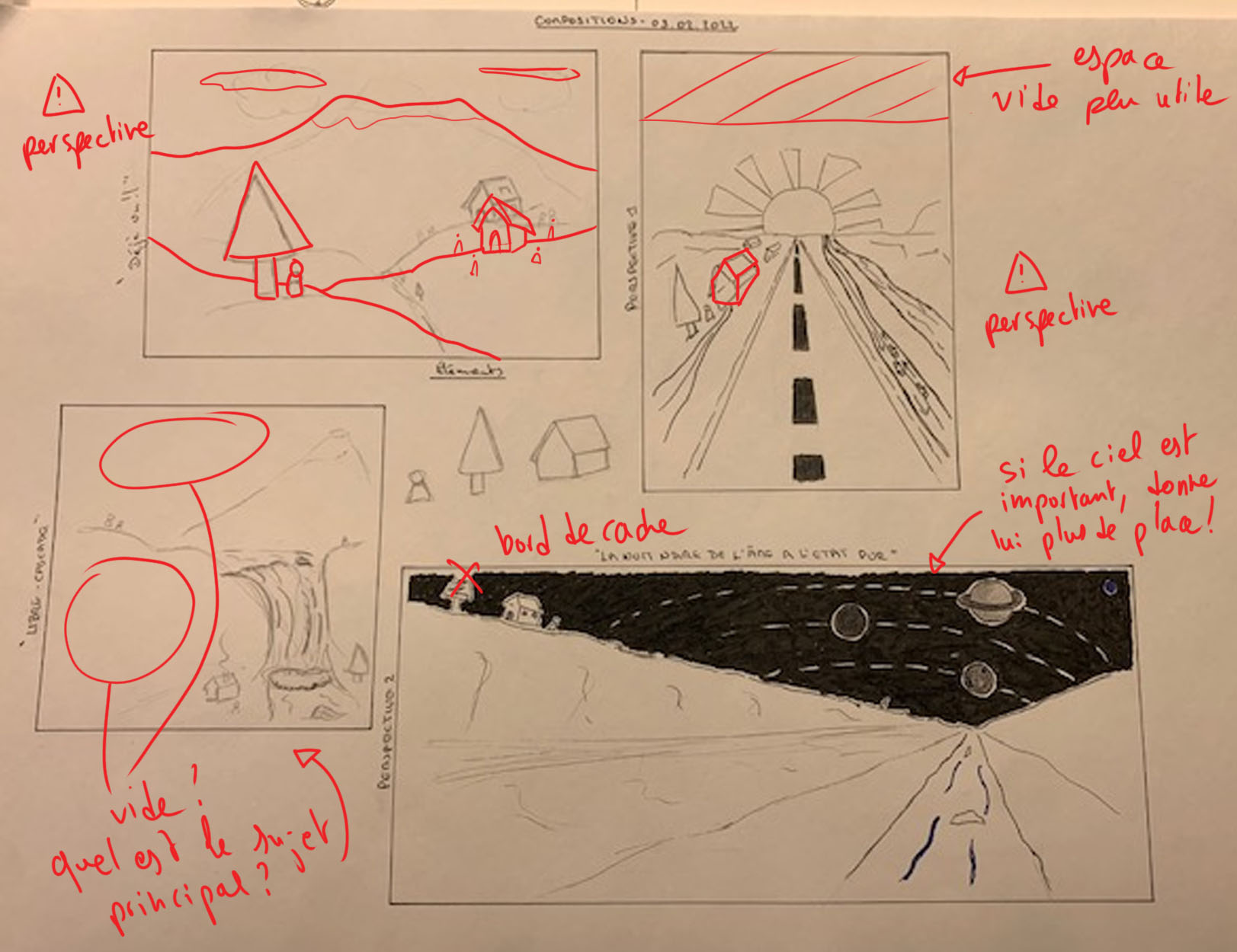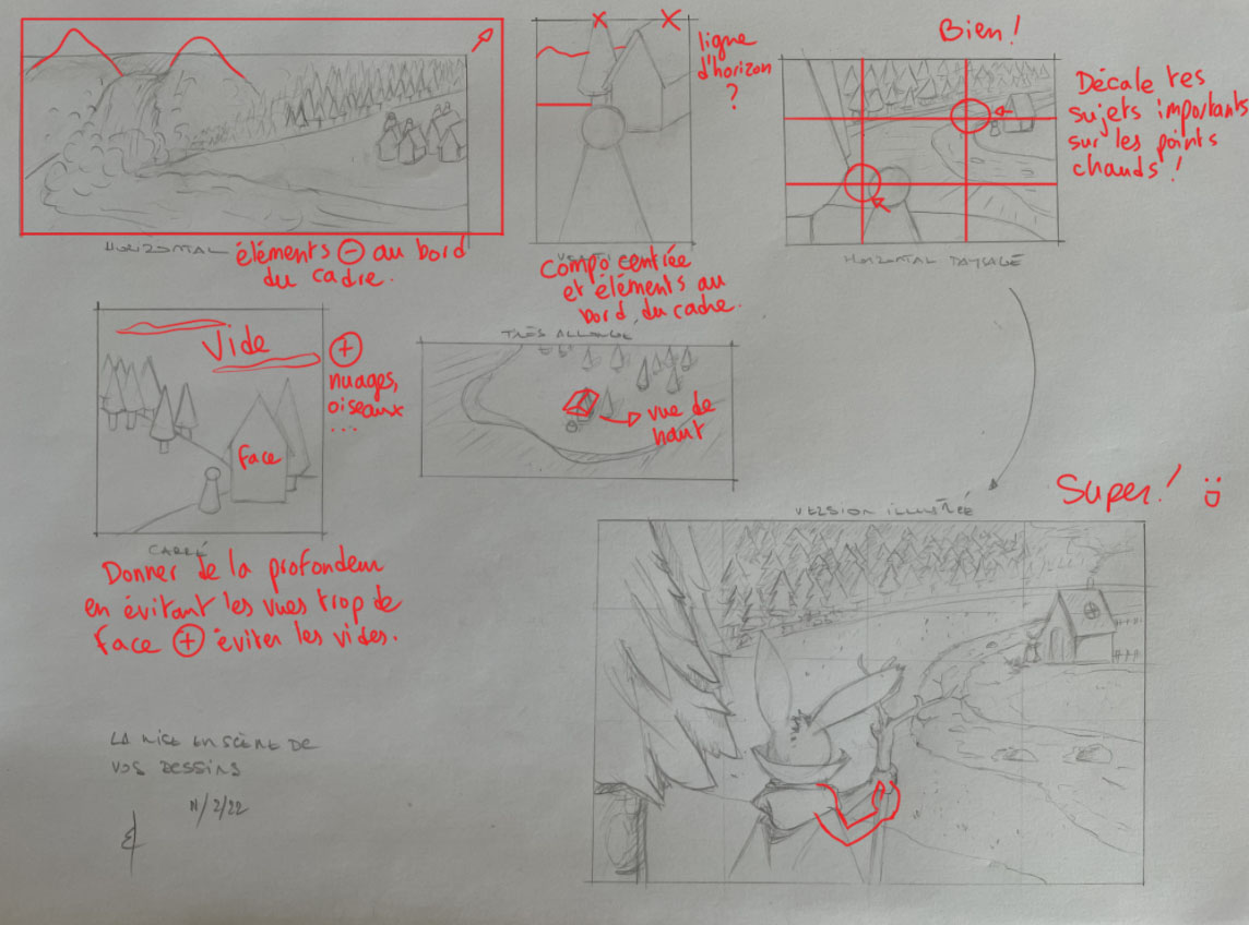 Hello Braineau, Some of your compositions are interesting, you have understood the purpose of the exercise well, well done! Here is my drawn correction for more precision. I hope it will help you improve ^^