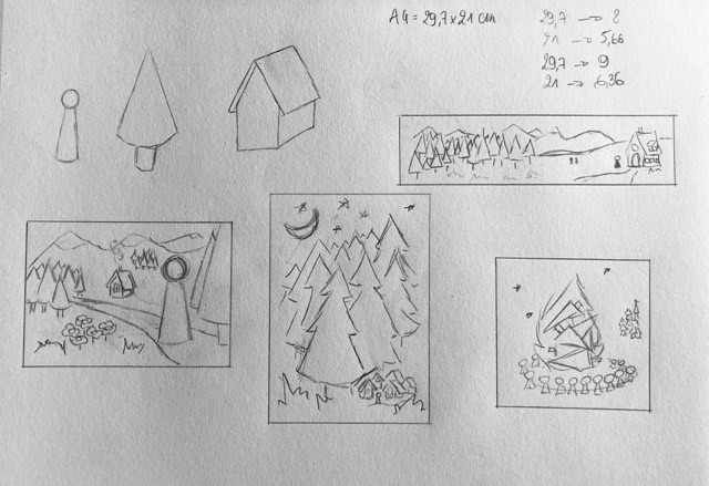 Bonjour Casha ! Joli travail de composition, elles sont toutes vraiment réussies! J'aurais juste peut-être placé différemment le petit village au pieds des sapins (deuxième dessin en partant de la gauche) car il est un peu "coincé" dans le coin de ton image. Si c'est le sujet principal de ton dessin, place le sur un point chaud de l'image.