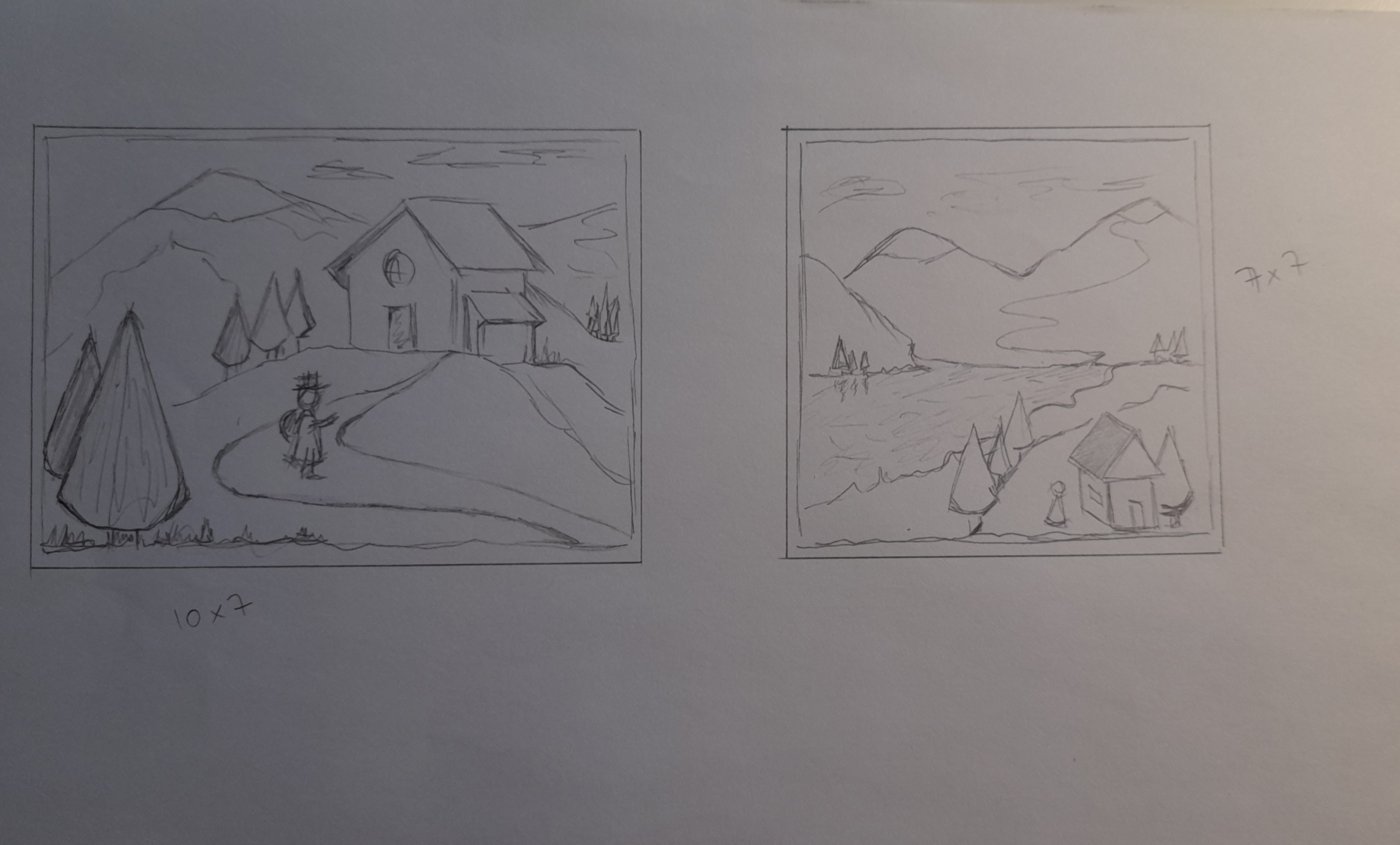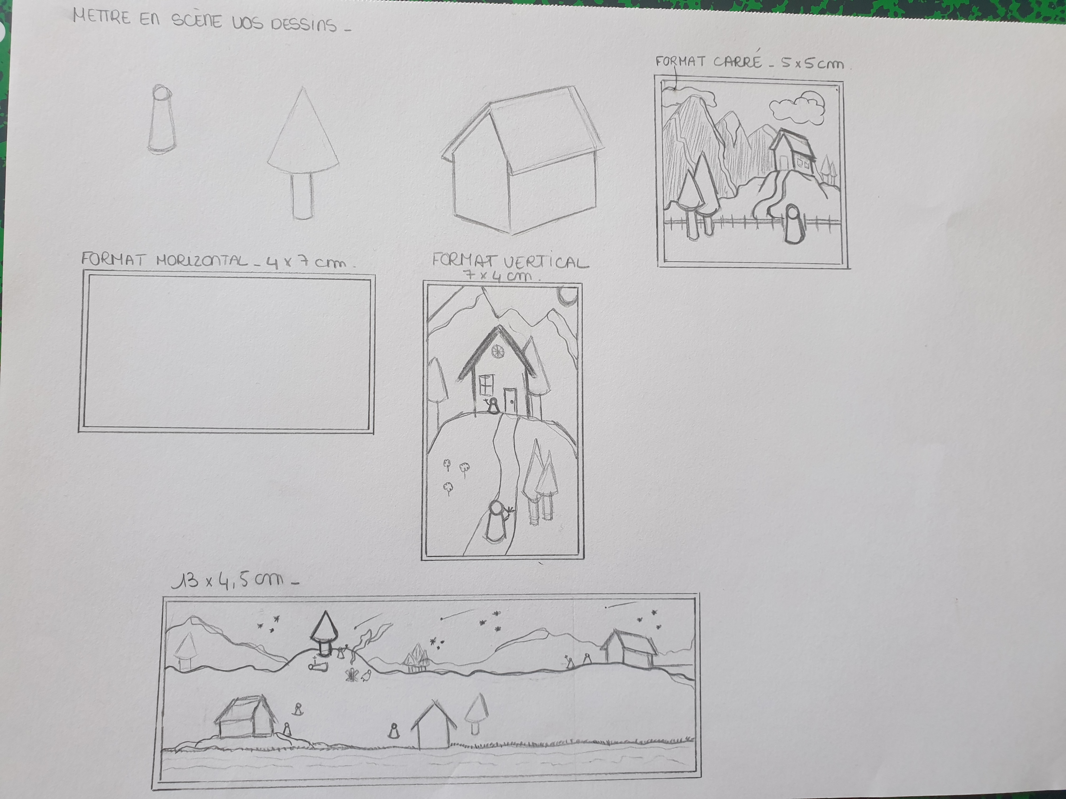 Bonjour YAKAENRIRE, Tes propositions sont sper sympas ! Attention à ne pas trop coller tes éléments au bords de ton cadre cependant. Tu as aussi oublié de mettre la maison de droite en perspective dans ton premier dessin, et le placement de l'arbre pile sur le point de fuite n'est pas très judicieux je pense, ça marche mieux sur le dessin du bas. Ta compo verticale est très cool aussi, attention aux proportions entre les éléments (personnage>maison). Continue comme ça !