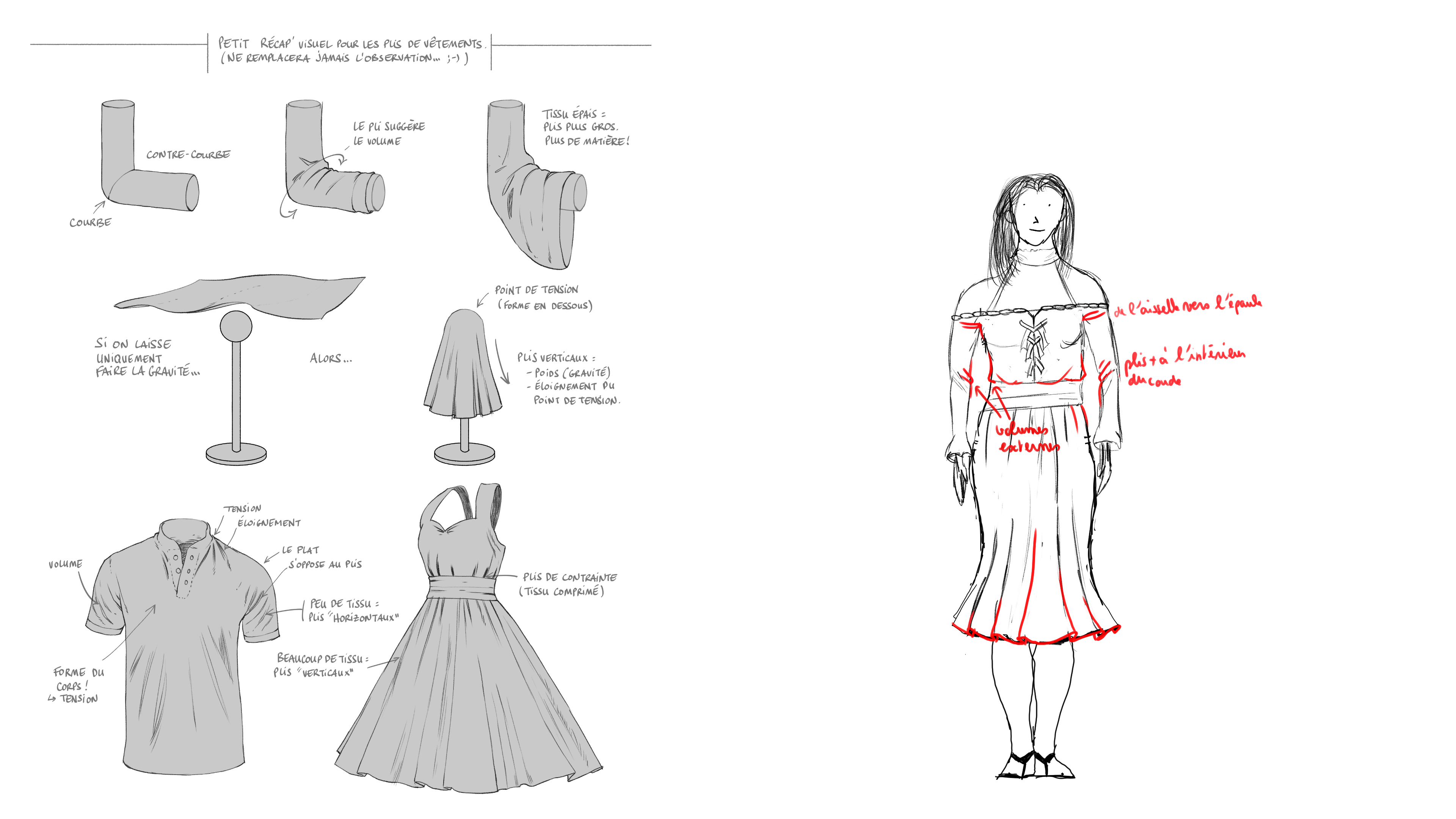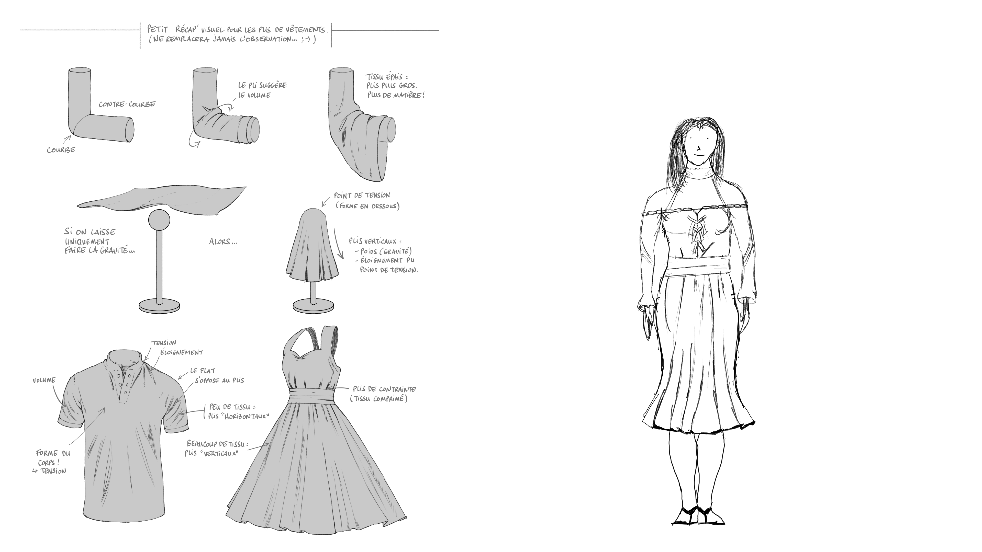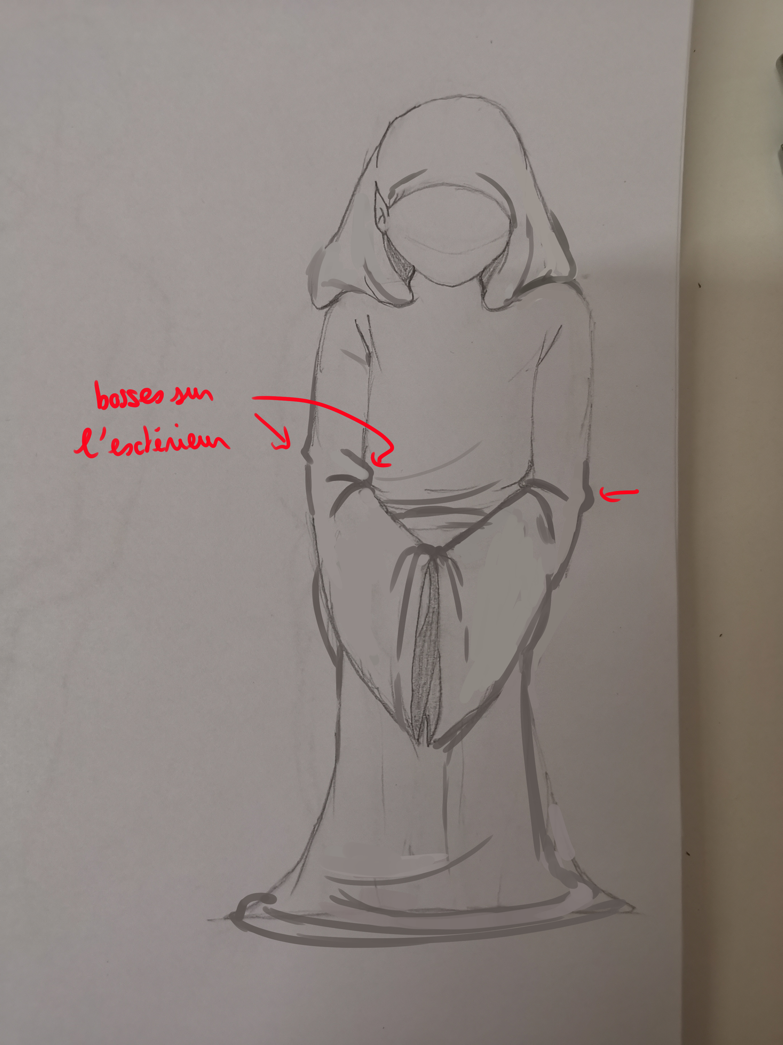 C'est plutôt compris :) J'ai amélioré quelques détails. J'ai enlevé certains plis inutiles sur les bras, les plis se concentrant aux points d'inflexion, ou quand le tissu se "cogne" et se compresse (poignets). Vu que la robe est longue il peut y avoir des plis d'écrasement au sol. Aussi, c'est bien de penser à faire des bosses sur l'extérieur des formes, pas juste des traits de plis à l'intérieur. C'était un peu fait mais j'ai amélioré. En tous cas le placement des plis est globalement bien réalisé !