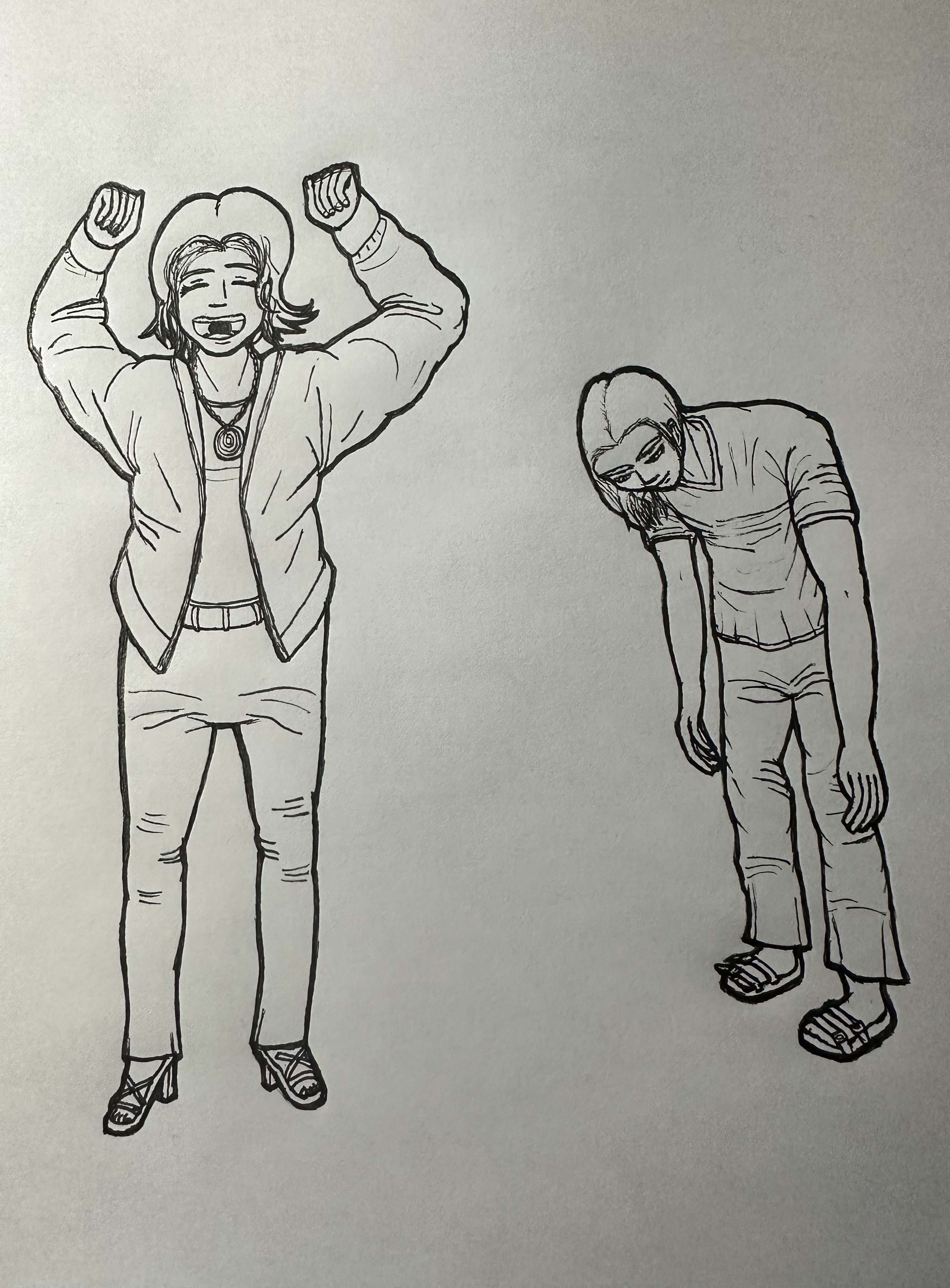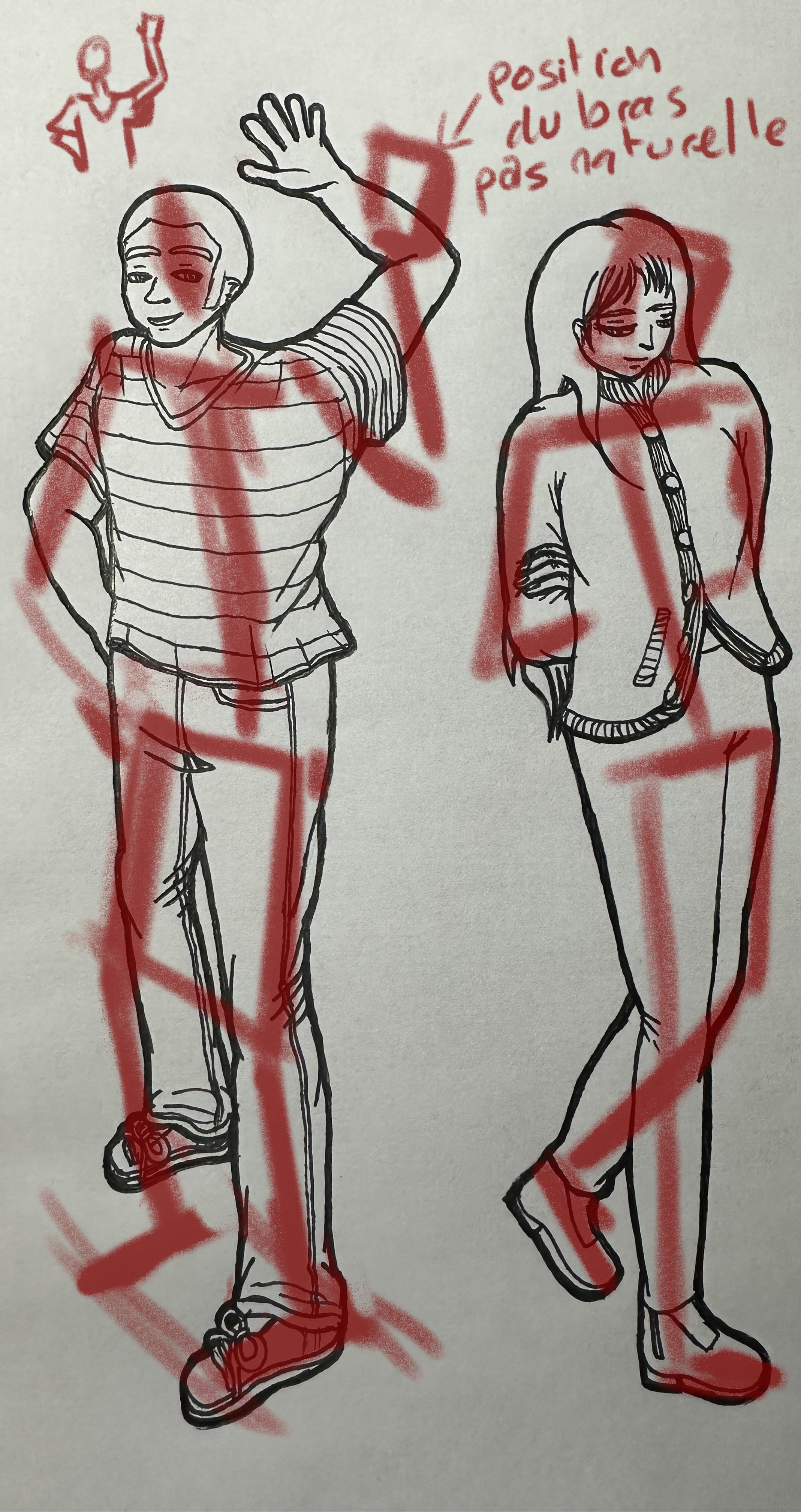 Il y a aussi un petit souci de proportion sur la jeune fille à lunettes, le bas de son corps (ses jambes) paraissent trop longue par rapport au dessus du corps. Ça peut être un effet de style, mais fais-y attention malgré tout. Garde comme repère que la partie surpérieur du corps - de la tête au pubis - doit être à peu près égale à la partie inférieur - du pubis aux pieds.