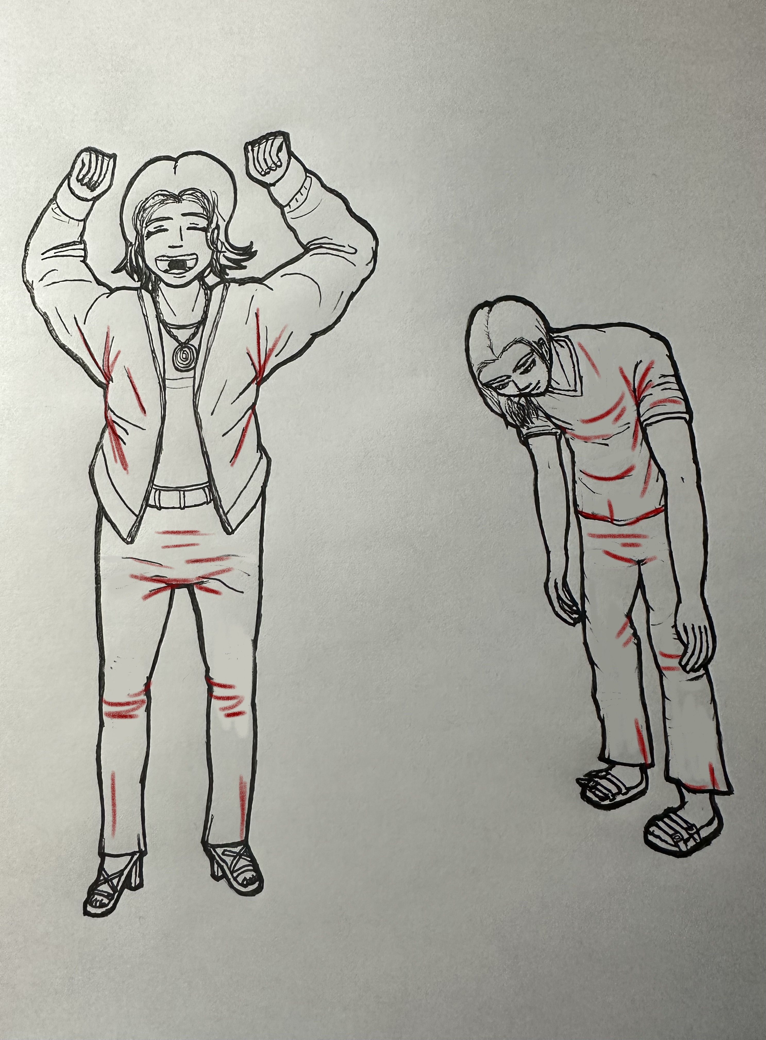 Joli travail ! C'est bien compris, mais il y a un peu trop de plis à des endroits où les points d'inflexions n'infligent pas tant de tension. C'est bien aussi de penser à la fermeté de la manière, un costard ne va pas se plier autant qu'un tshirt de soie par exemple, en raison de son épaisseur, son poind, qui lisse un peu les choses. J'ai repeins par dessus les dessins. ça pourrait également être intéressant de voir tes références si tu en as. Le petit exercice en coin est compris sinon :)