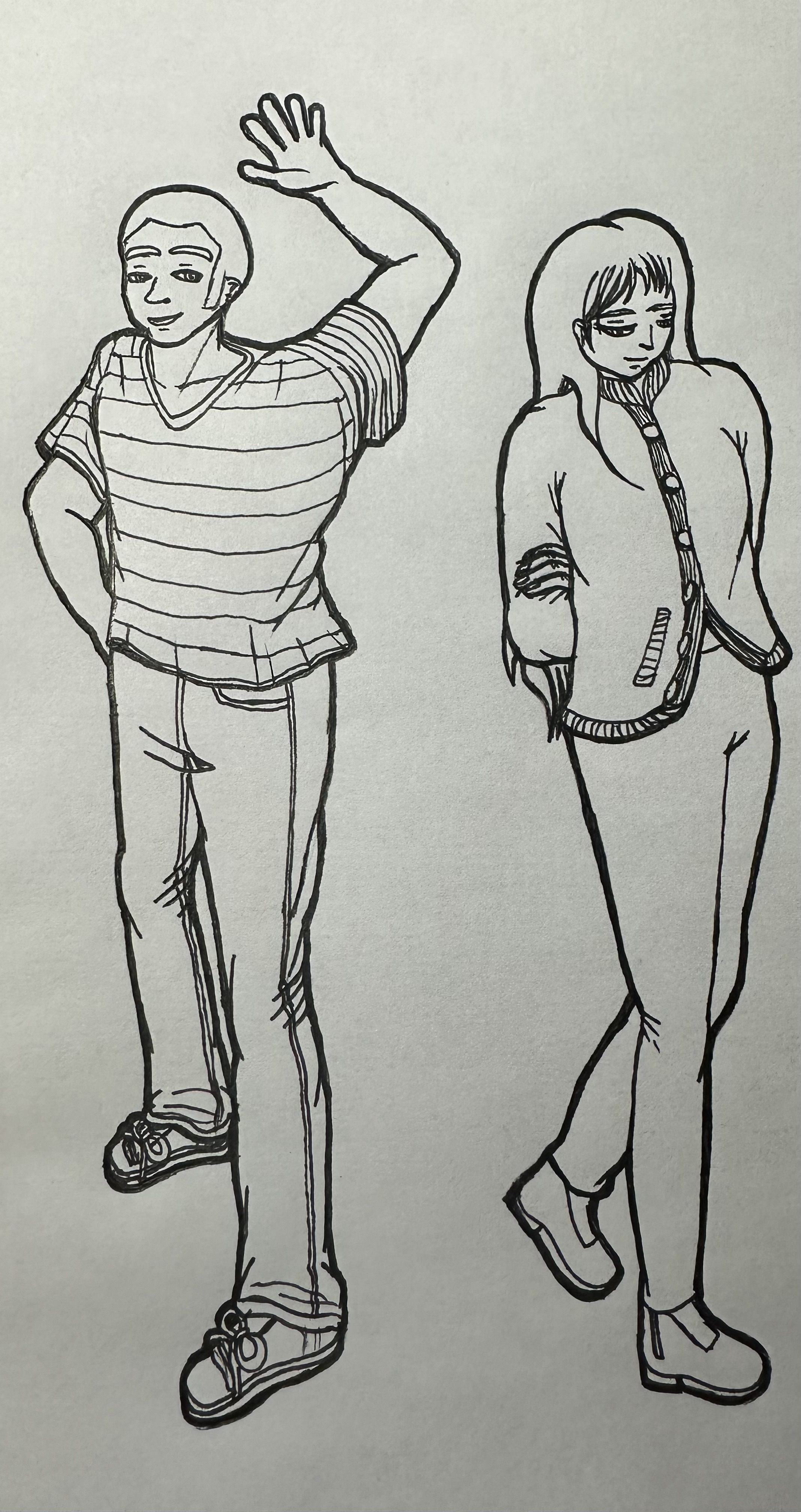 Hello Le PigeonVoyageur19. J'aime beaucoup le style de tes personnages, et tu les as bien habillés, les plis sont bien traités... Par contre, attention à l'anatomie et aux proportions de tes personnages.