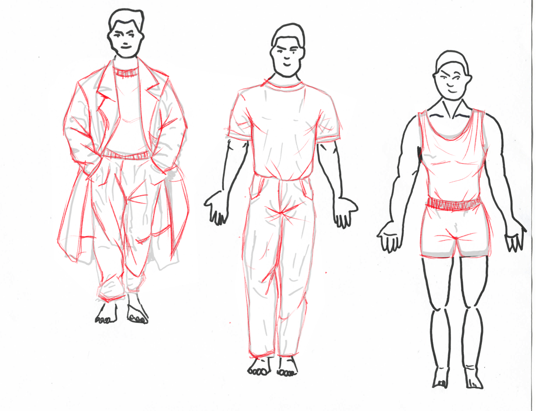 For the character on the right I tried to simplify the shapes of the body and then dress him, but I couldn't come up with a coherent movement. So I started from the skeleton and was able to manage the proportions more easily.