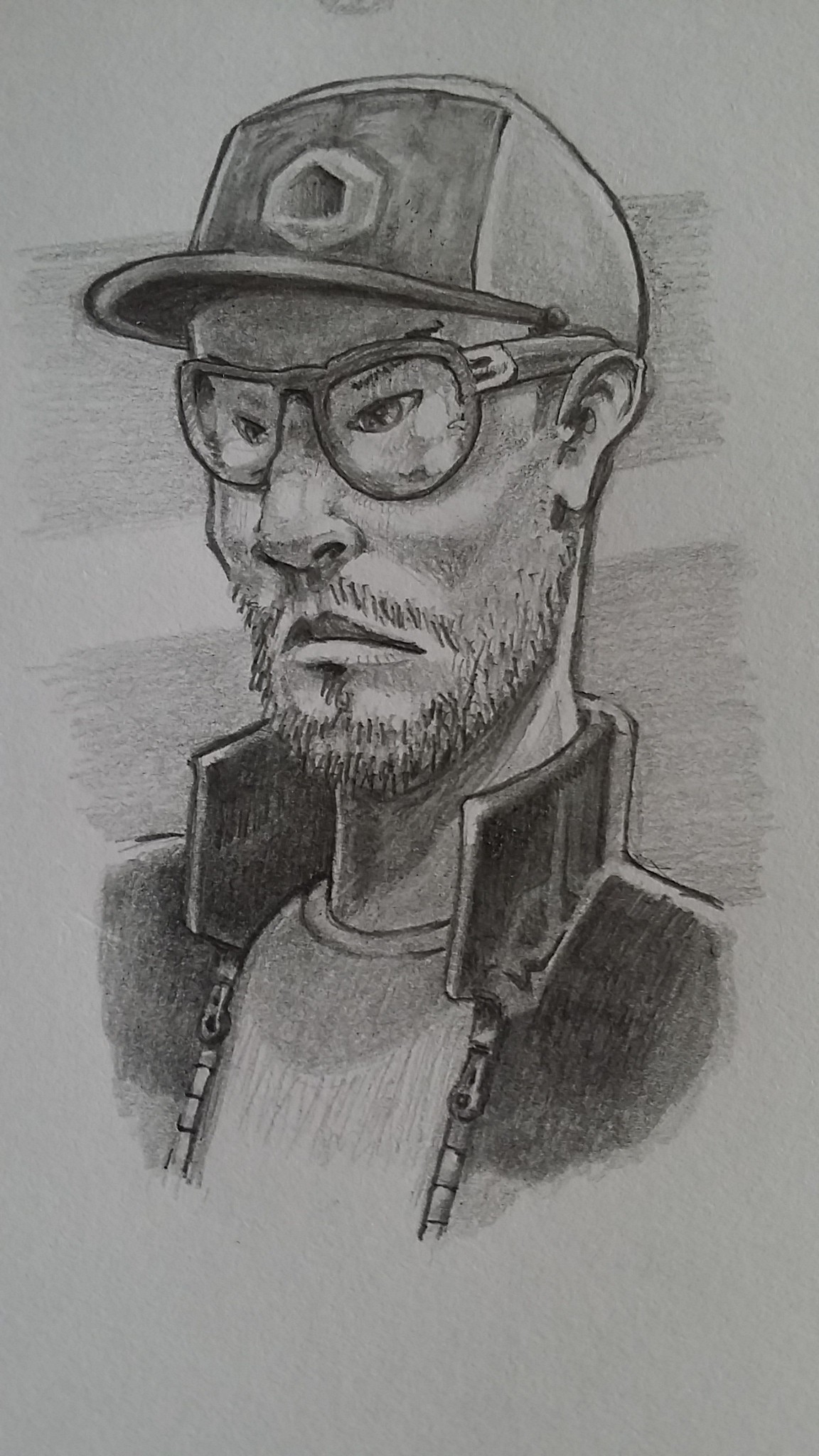Great job on this one too :) I really like the work with the values ^^ The eye on the left side of the image might be very slightly small but it could be a stylistic effect. The shape of the two glasses lenses seems different from one another, the lens on the left side of the image doesn't go down as low as the other on the cheek, the lens appears a bit shorter than the other. One could argue that with perspective it would be normal for it to be slightly smaller, but not by that much. But honestly, these are minor details, but you asked for ruthless feedback haha ^^