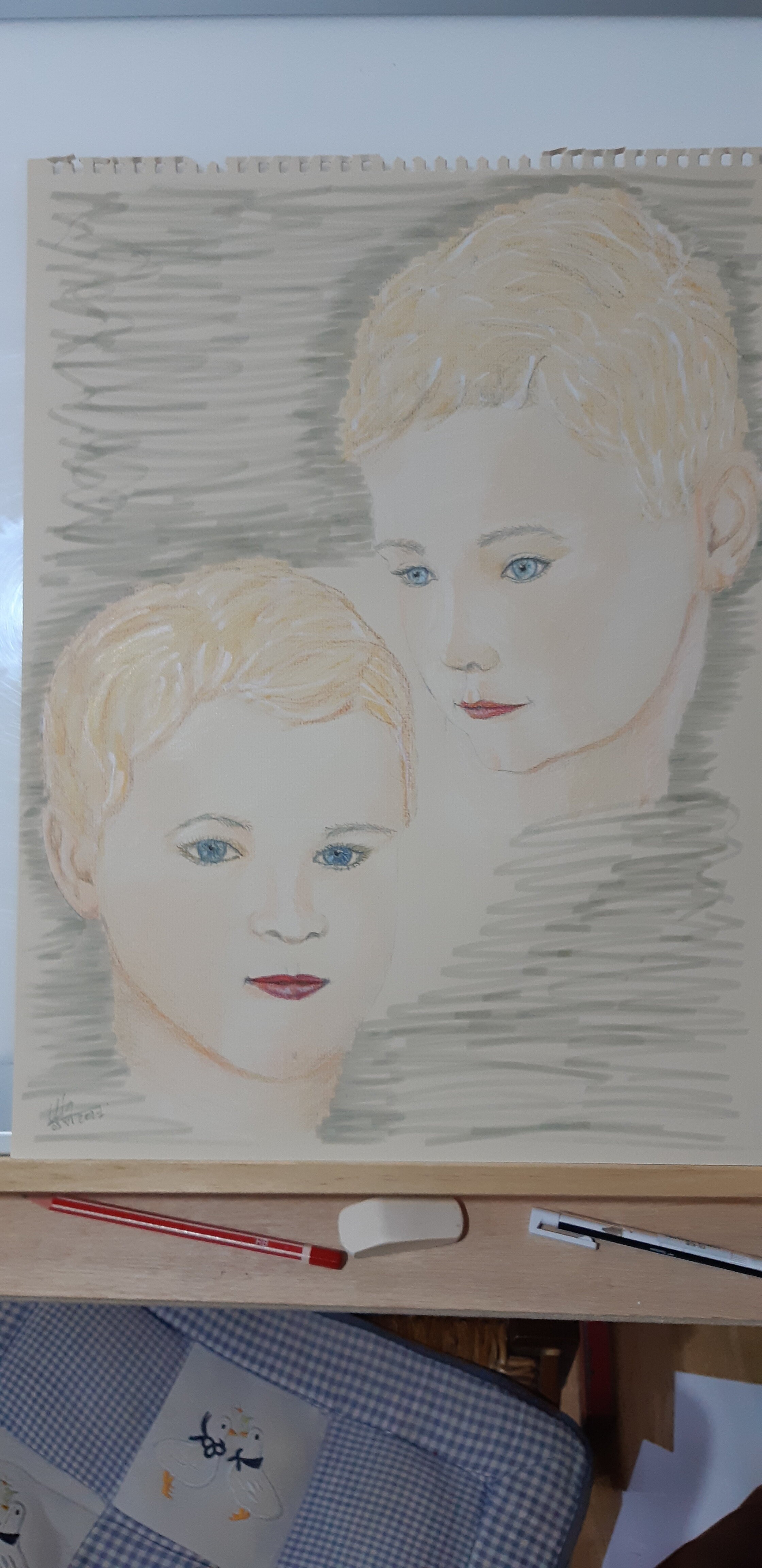 La maman adore ce croquis, elle reconnait parfaitement ses enfants. Ses mots " super, très très bien, magnifique travail" Moi je suis plus mitigée car peux mieux faire.