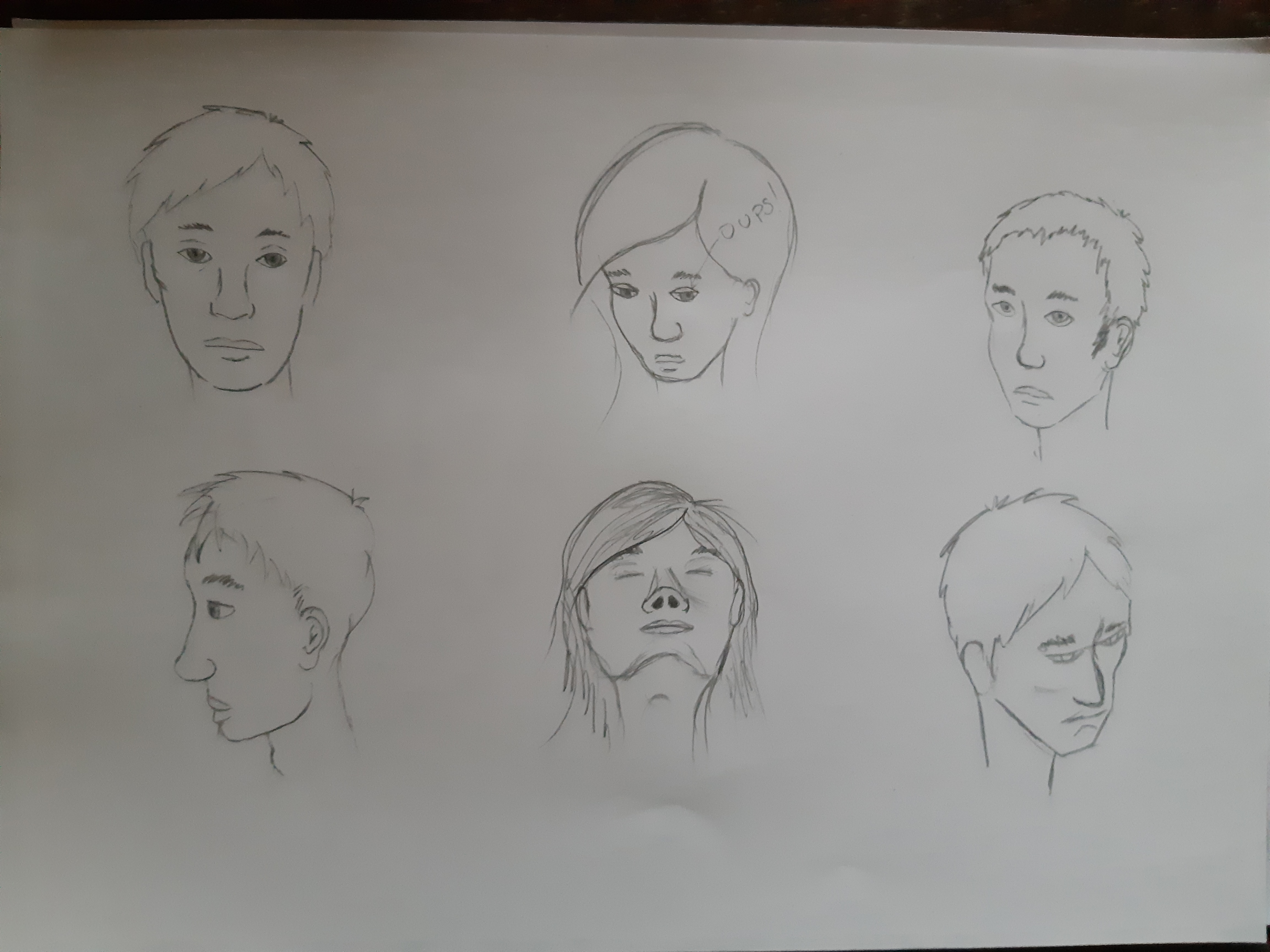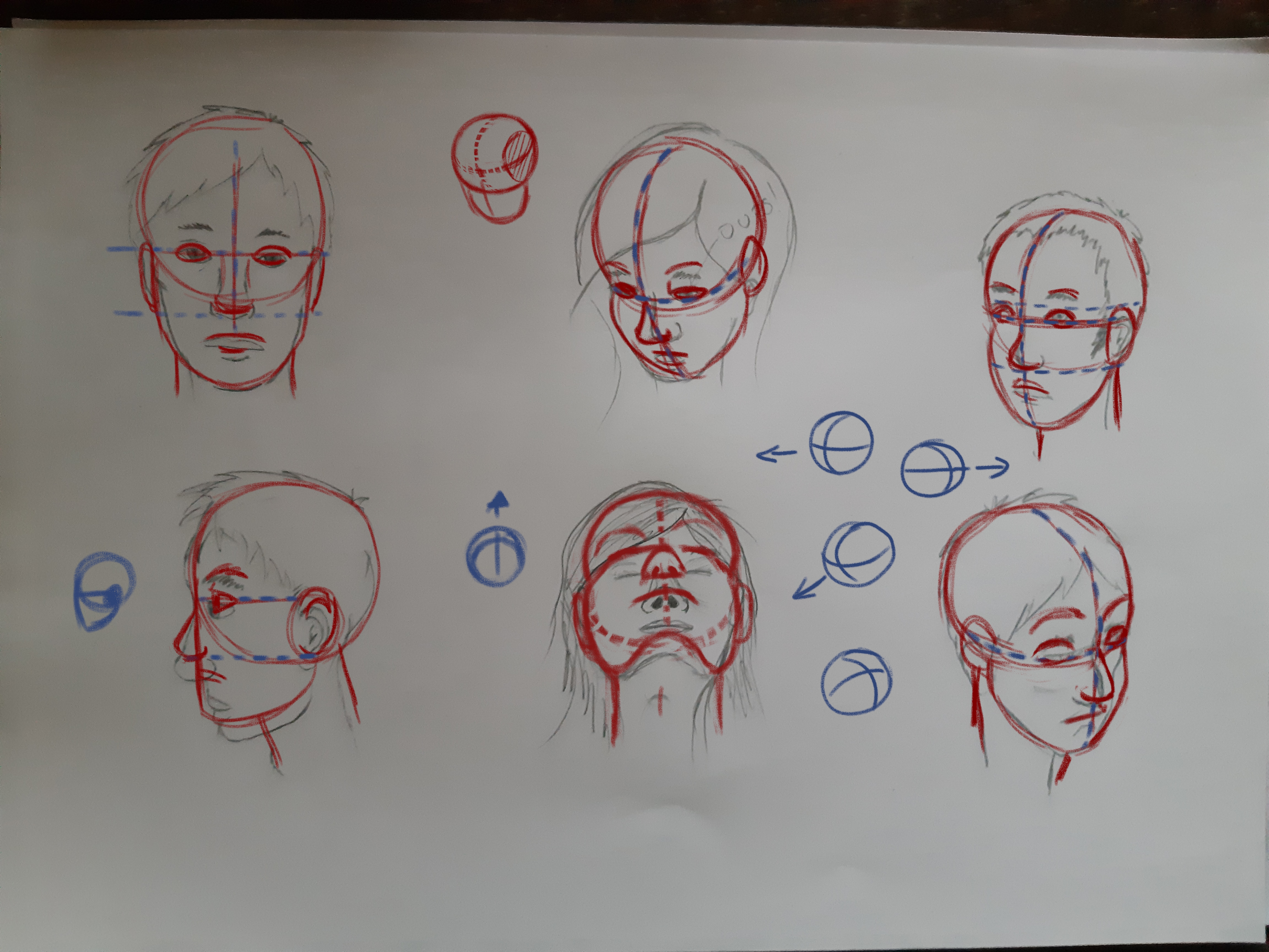 Re! Si tes visage te semblent biscornus, c'est parce que leur construction n'est pas équilibrée, ça créé des problèmes de proportions. Visualise la tête en deux parties: une boule pour le crâne, et une partie inférieure pour la mâchoire. Pose tes lignes de repère en prenant en compte l'angle de vue, cela influera sur le placement du visage.