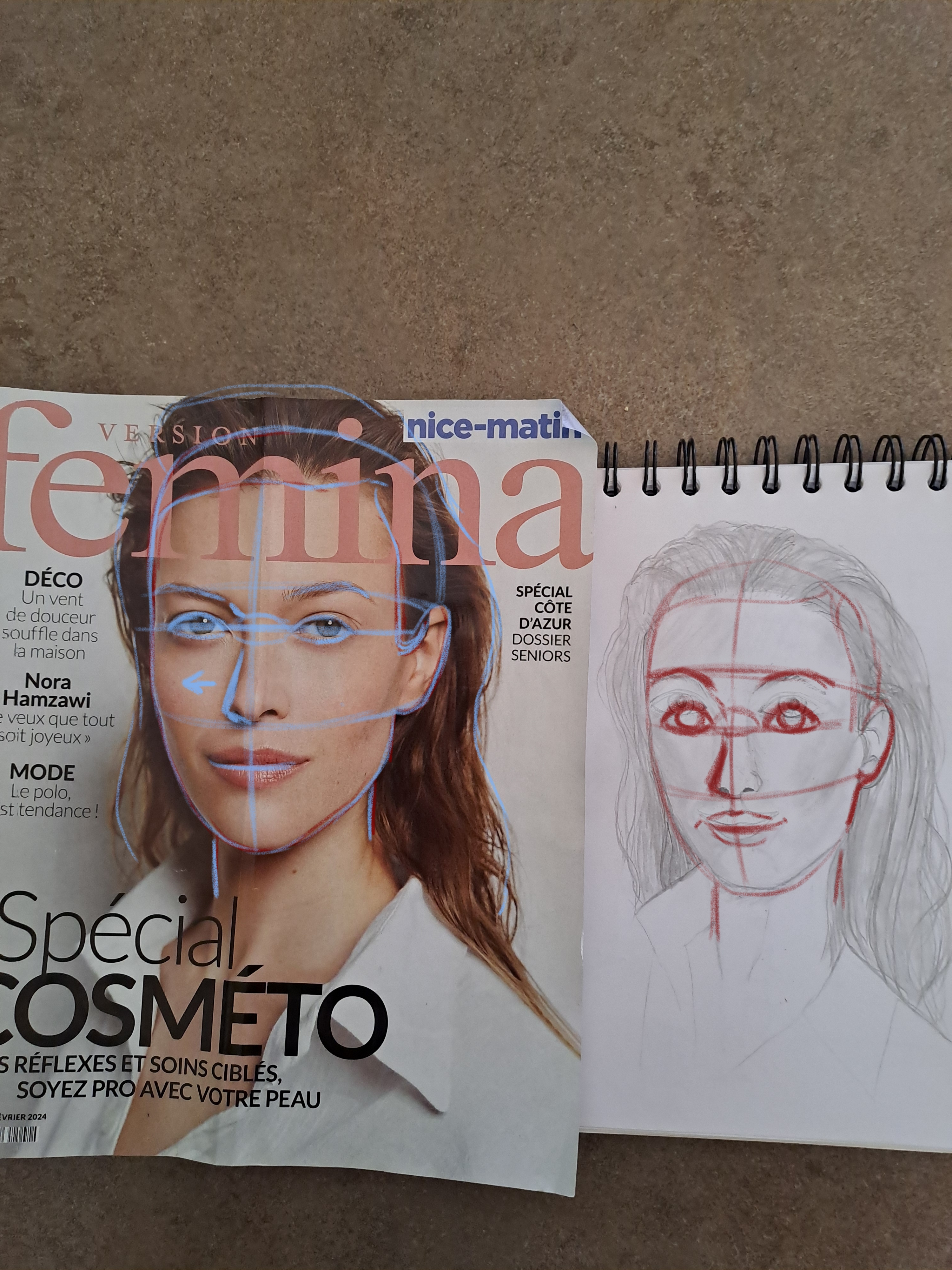 Good evening Sylyan, you shouldn't be too hard on yourself either, it's already a good start! There's mainly a problem with the construction of the face, and your eyes are a bit too big and placed too high... Before you start detailing your drawing, make sure to properly prepare the construction by visualizing the general shape of the head, the hairline, and especially the guidelines for the placement of facial features (eyes, nose, ears, mouth), as you can see in my correction! ;)