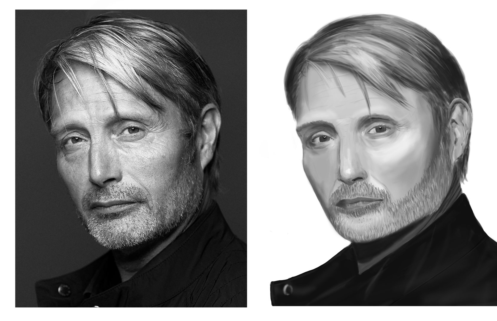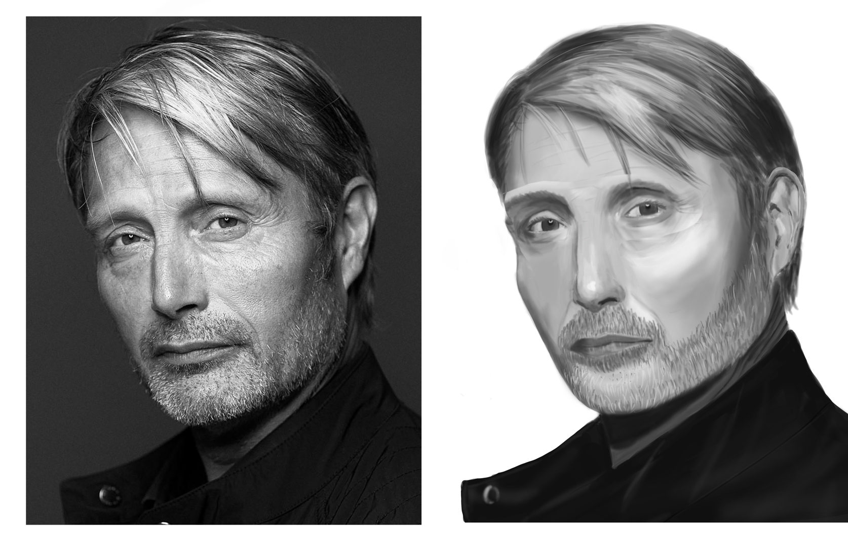 Hello, pour cet exo je me suis lancé sur une étude d'un portait de Mads Mikkelsen 🙂