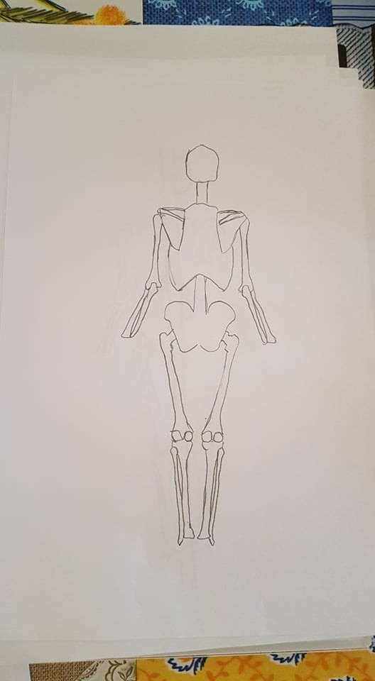 To revise: the shape of the shoulder blades is very, very, very pointed in your version, and the pelvis, which is the most complicated bone to understand (it has ridges that you can feel at your hips, for example).