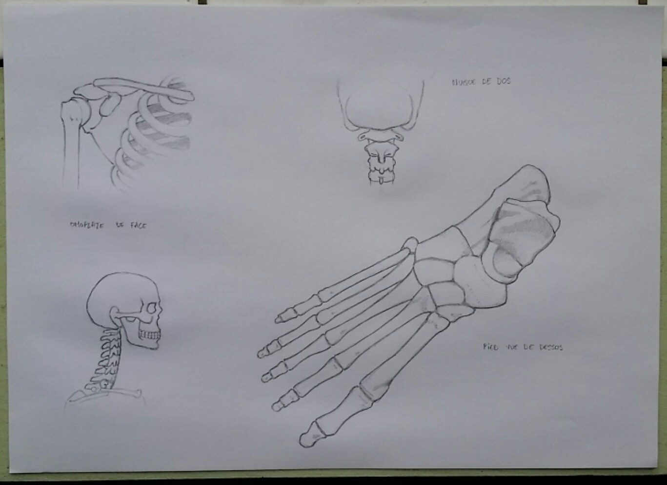 Ce sont des bonnes synthèses de squelettes, ça fonctionne bien ! Tu n'as pas mis les rotules partout, vu que ce sont les points de repère des genoux, il ne faut pas les oublier ^^ Pour les os des cuisses, il y a un petit décroché que tu as bien fait au deuxième dessin par exemple, mais qu'on ne voit sur le 4ème dessin au niveau de la jambe à droite. Je pense qu'on devrait le voir un peu ce qui marquerait mieux la hanche. ça décalerait un peu la jambe sur la droite, là du coup elle me paraît un peu trop en avant. Sinon, joli travail :)