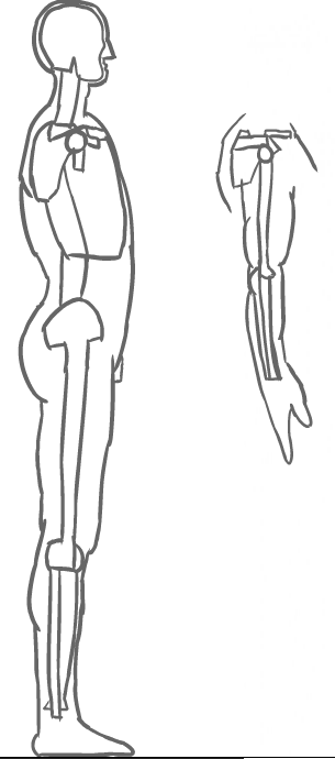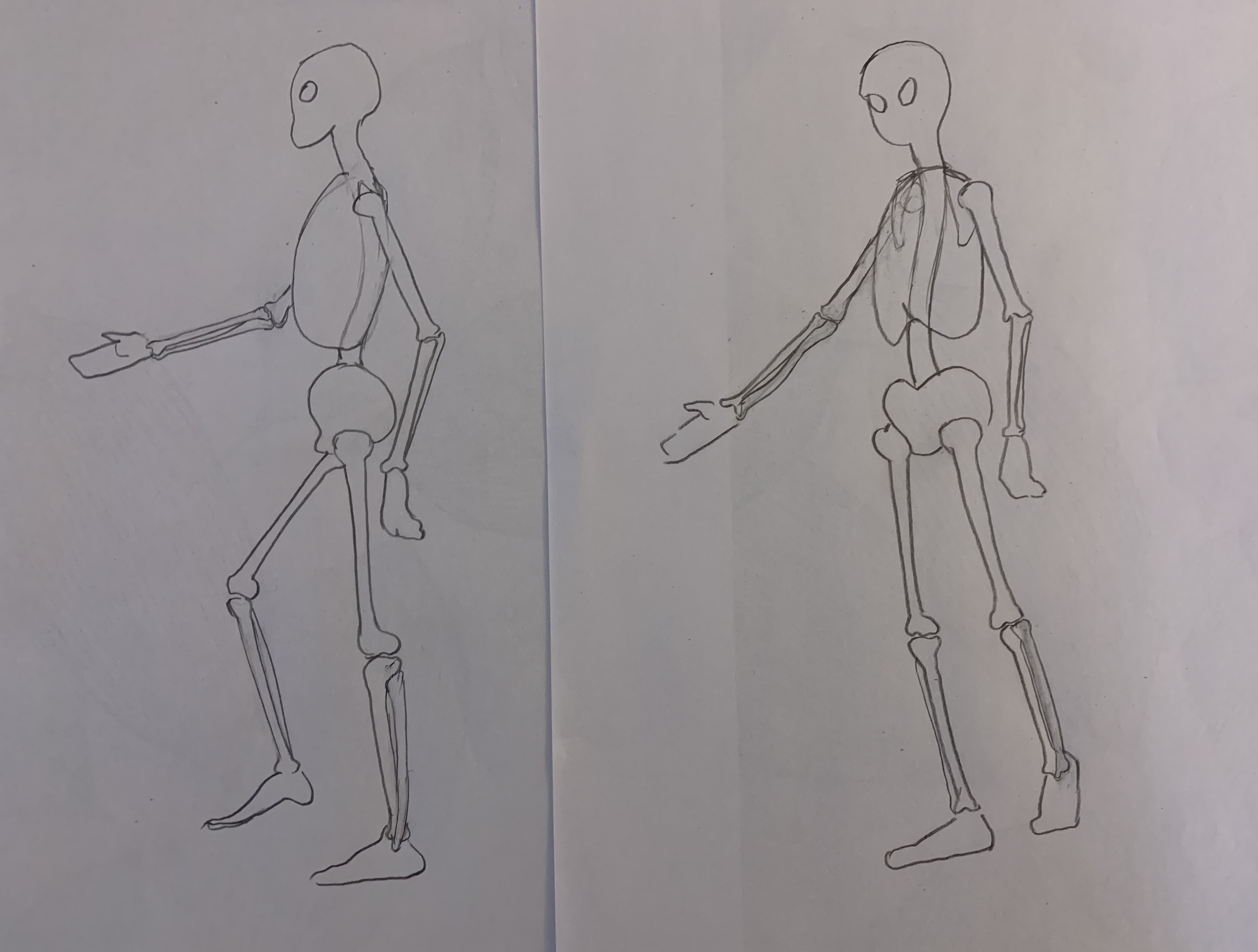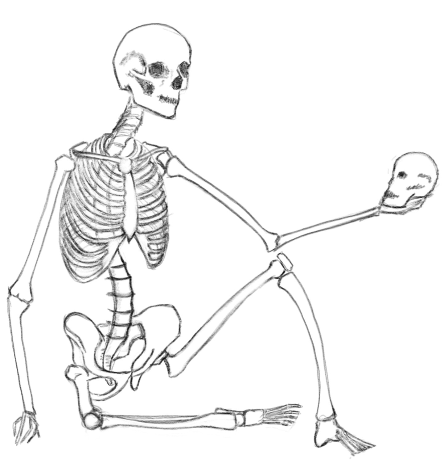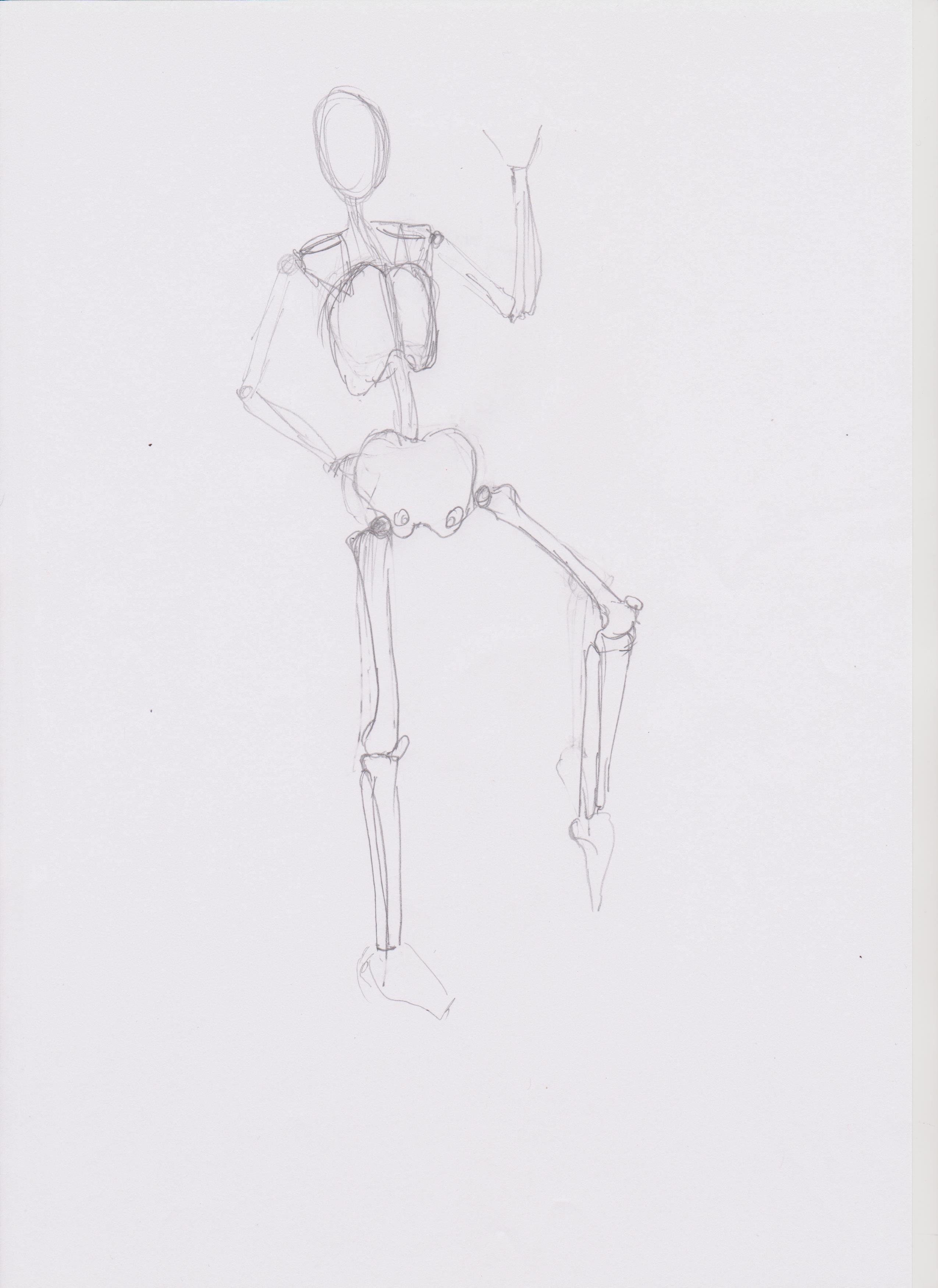 Here's my skeleton in the "phoenix posture". Since I did my drawing in two stages, I made a rather striking error in proportion. The upper body appears atrophied compared to the lower body. The rib cage is far too narrow compared to the pelvis. The rib cage is seen from a dive because the character is leaning forward.