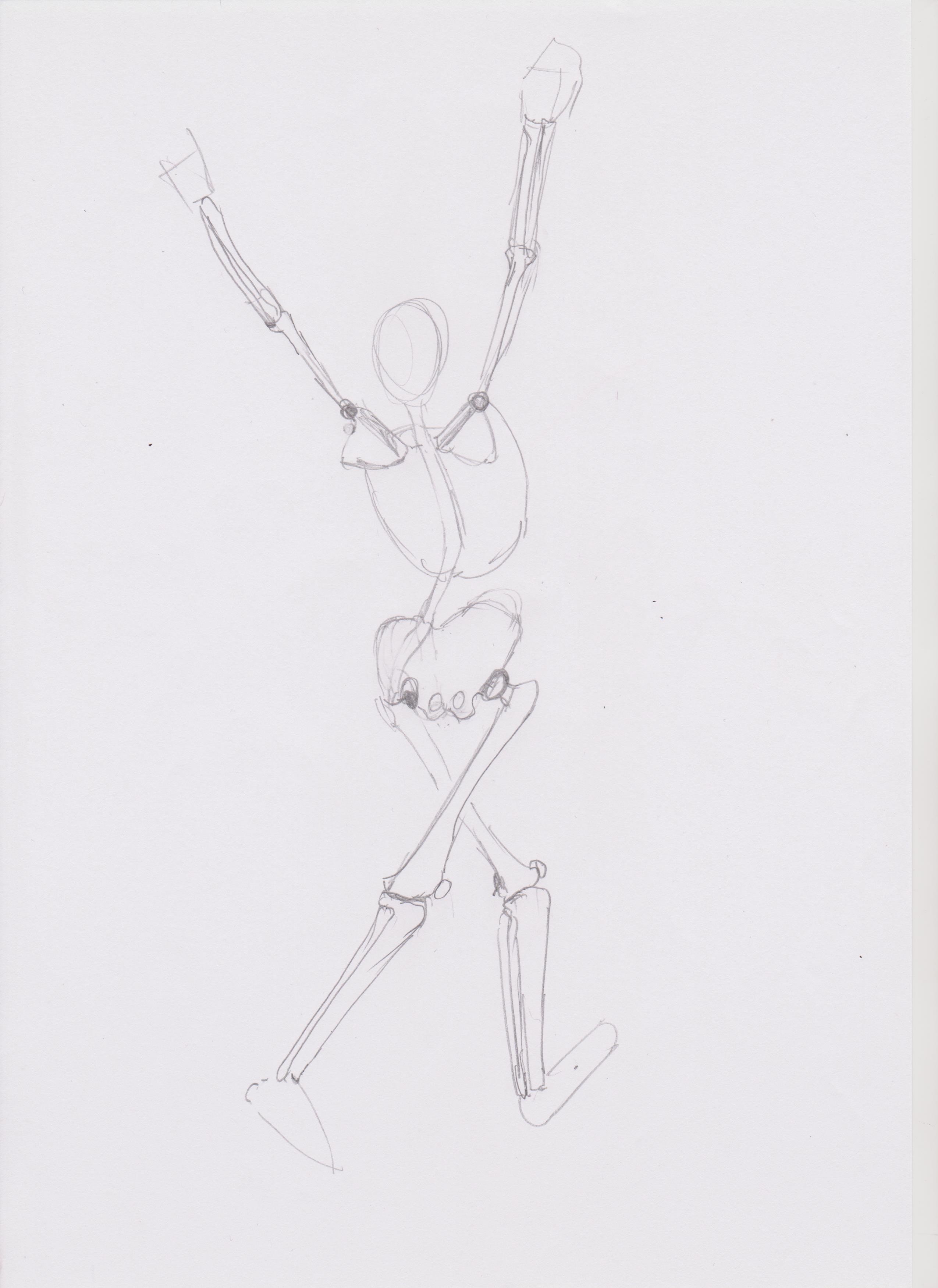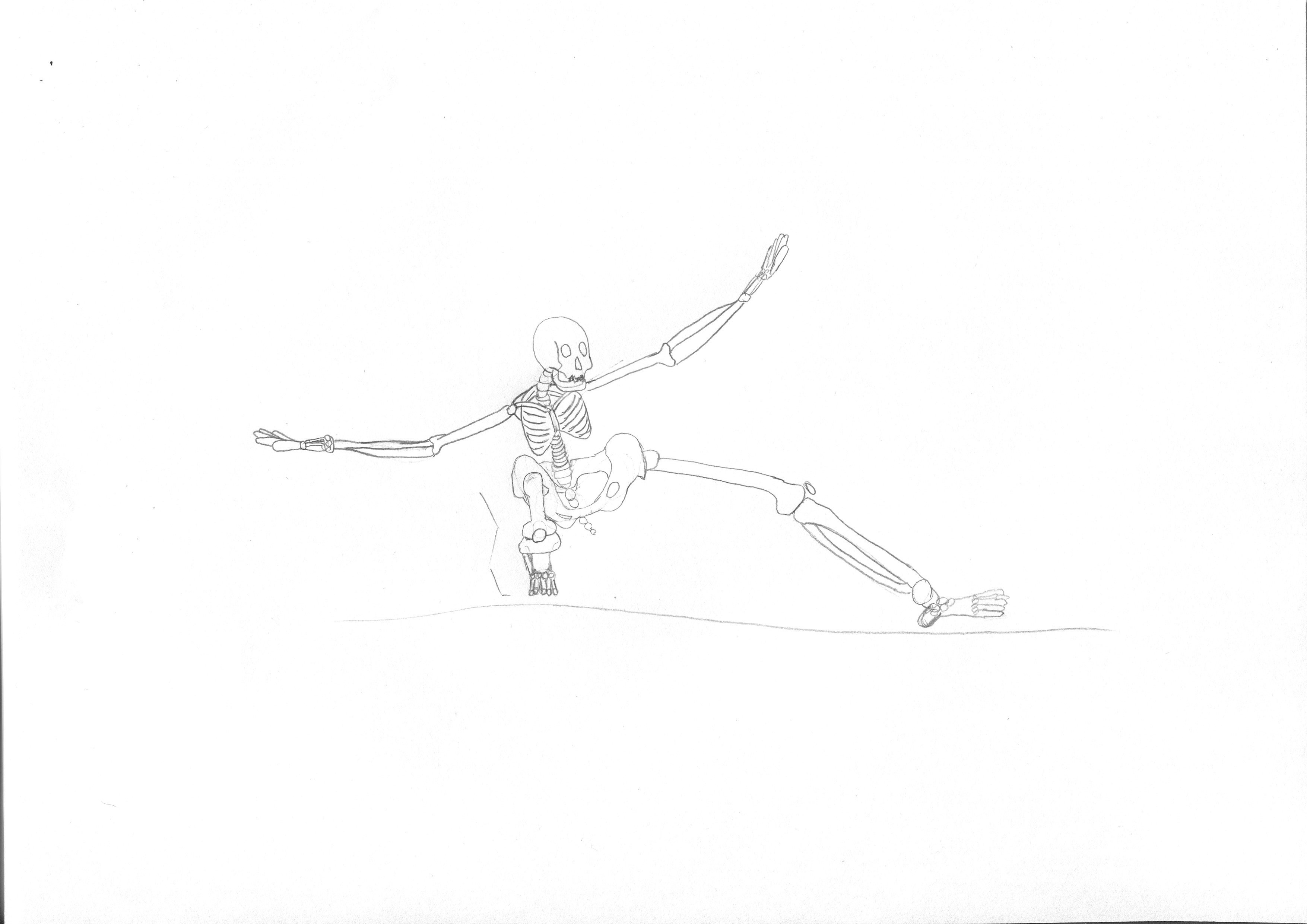 Voici mon squelette dans la "posture du phoenix". Comme j'ai fait mon dessin en deux temps, j'ai commis une erreur de proportion assez flagrante. Le haut du corps parait atrophié par rapport au bas du corps. La cage thoracique est bien trop fine par rapport au bassin. Cage thoracique qui est vue de plongée car le personnage se penche en avant.