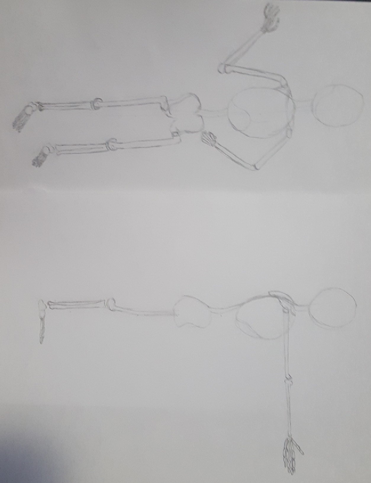 Effectivement, c'est très compliqué ce dans quoi tu t'es lancé ! Tes commentaires sont justes, c'est effectivement ce que je remarque. Le haut du corps est vraiment petit par rapport au bas. La cage thoracique est particulièrement petite. Quelque chose comme ça c'est peut être brûler des étapes quand on commence avec la structure. Si tu veux vraiment faire ce genre de pose compliquée, je te conseillerais d'abord de dessiner l'humain avec sa chair dans les bonnes proportions (avec un modèle), puis de mettre le squelette dedans.