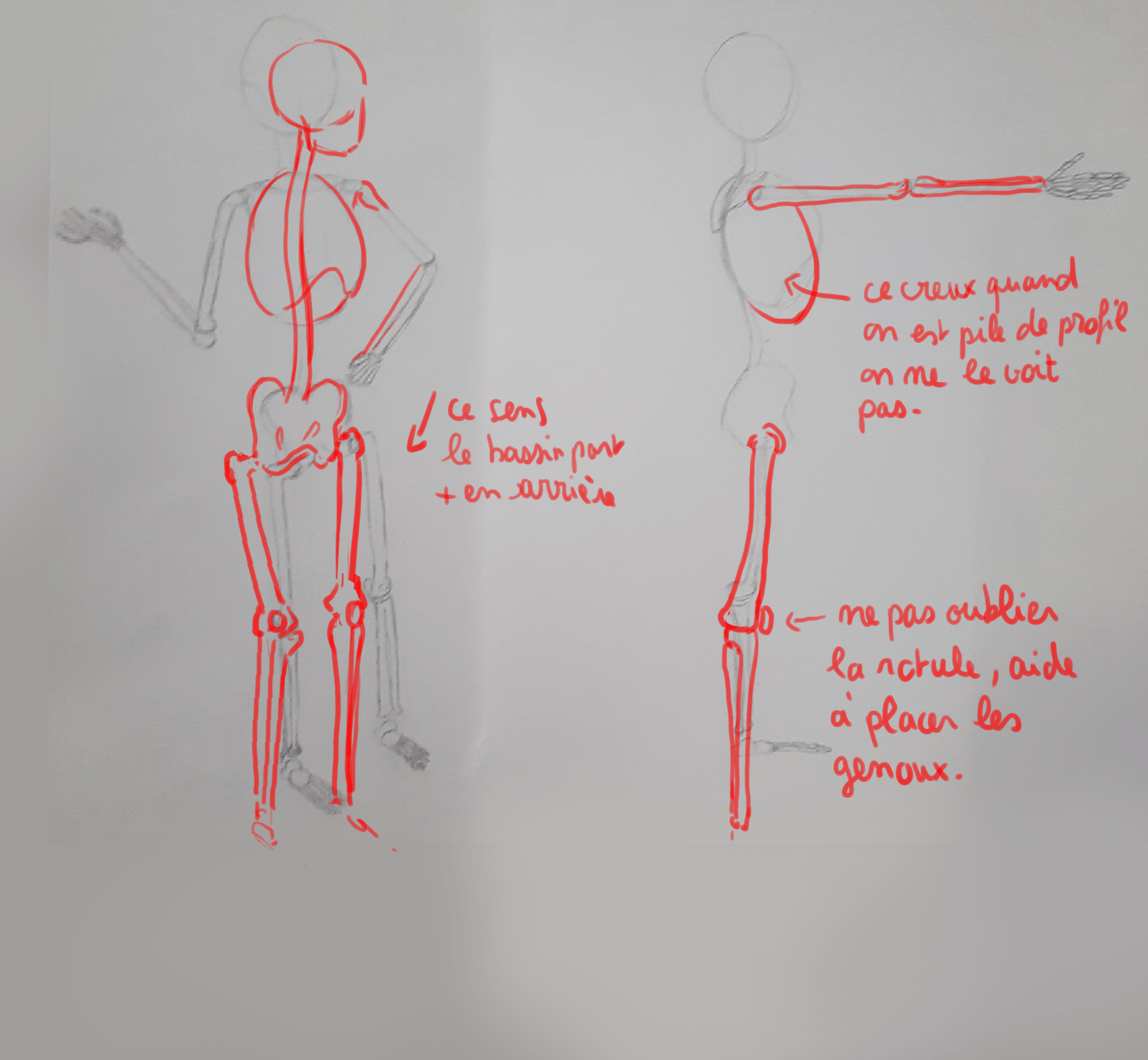Désolée pour l'attente >< La structure au niveau des os est pas mal comprise ^^ Effectivement niveau proportions les jambes sont trop courtes pour les 2. Pour l premier i y avait des petits soucis de direction, notamment la tête trop en arrière, et le bas du bassin trop tourné vers l'avant. Niveau jambes c'est pas mal, sauf qu'en observant bien le squelette on se rend compte que l'espace entre le haut des fémurs est plus grand que l'espace entre les rotules, car le haut est accroché au bassin et forme les hanches, toi tu as fait tout droit. Pour la vue de profil c'est mieux niveau placements et direction des os, les os sont parfois un peu fins, et pense à la rotule, c'est le repère des genoux donc c'est pas mal de les mettre. Bon travail en tous cas, tu n'es pas loin ^^