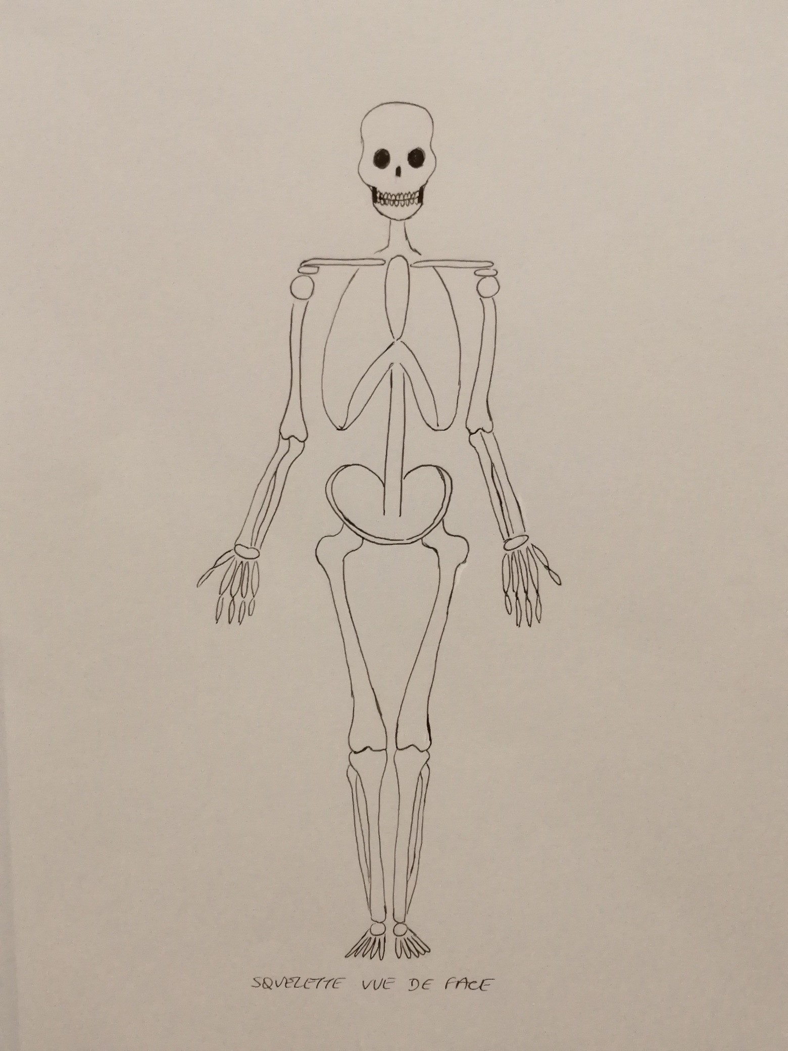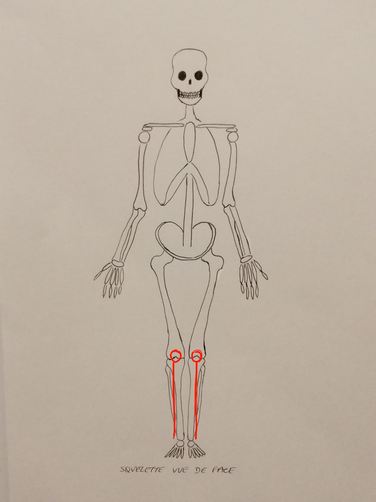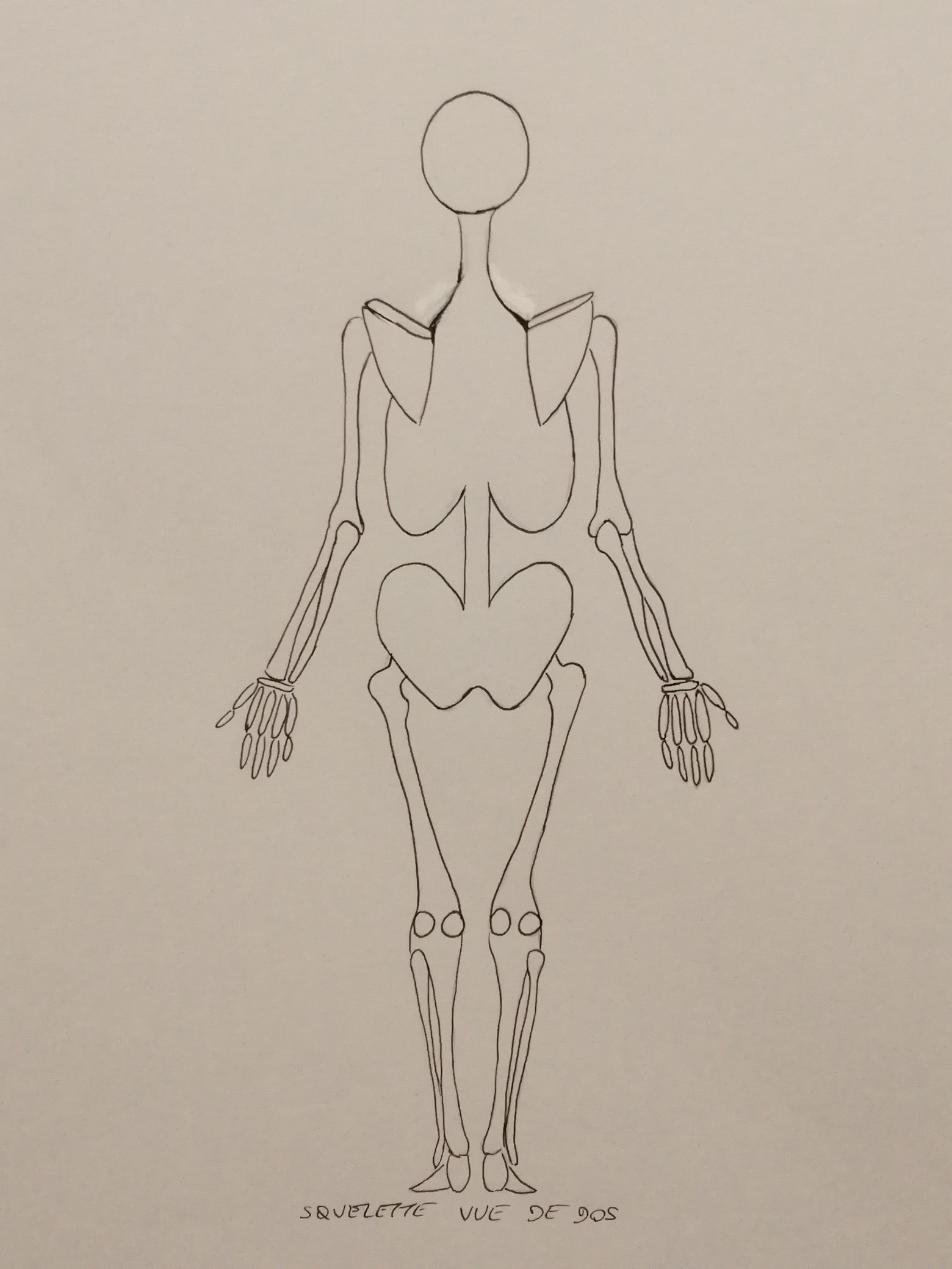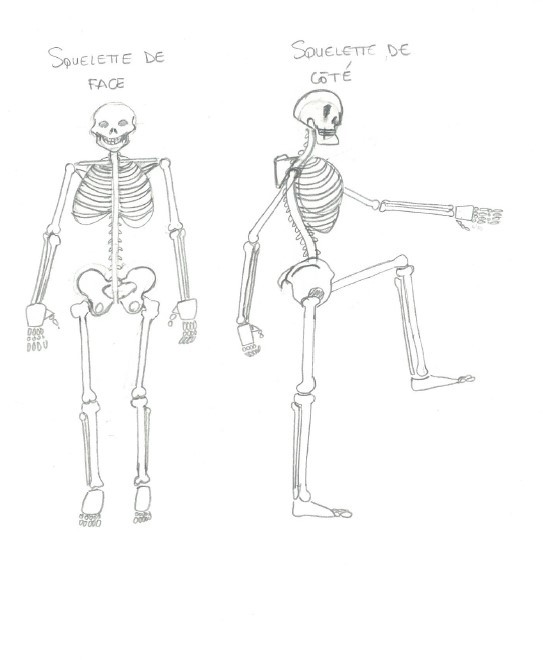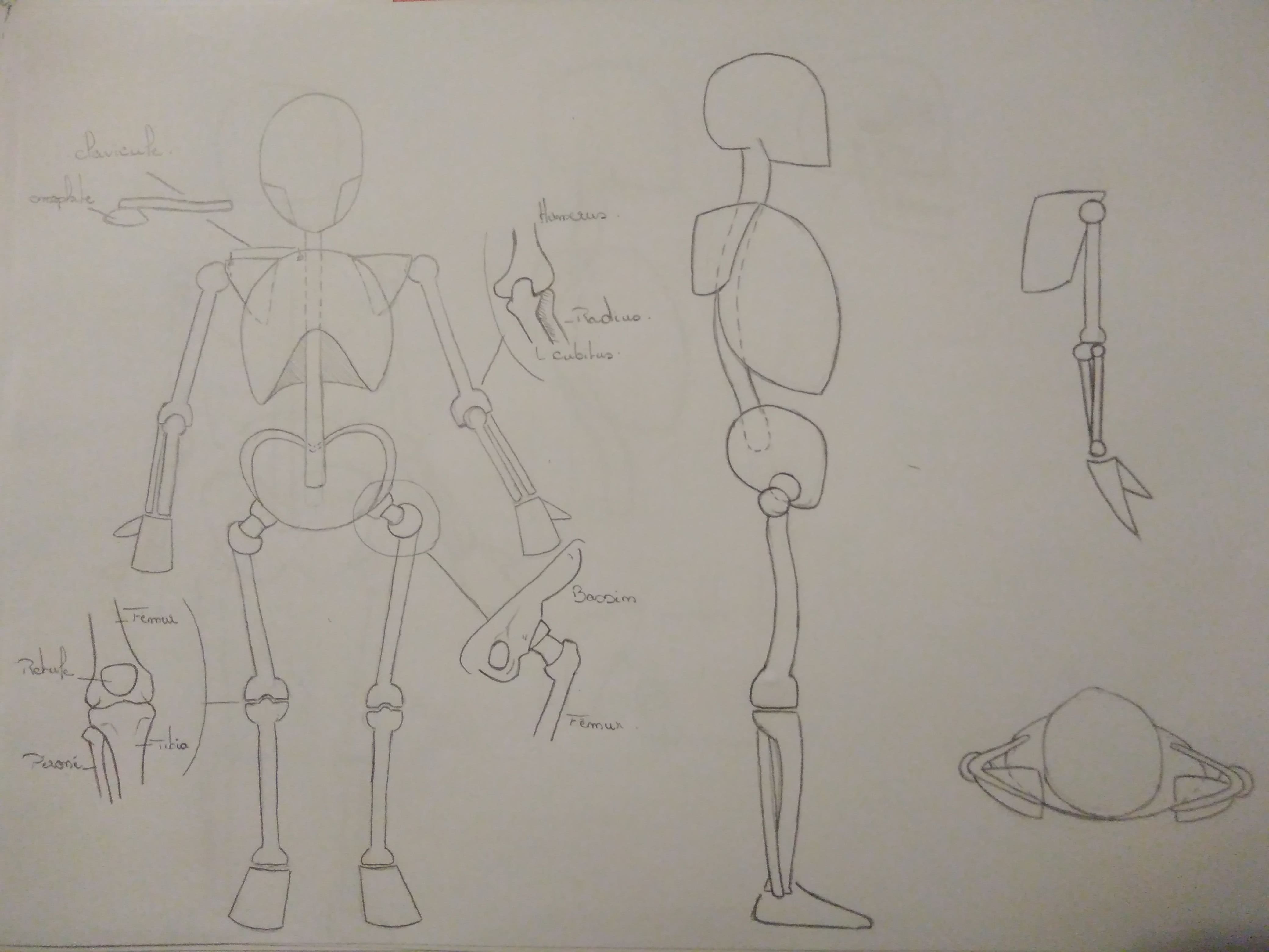 C'est du bon travail, la structure humaine est bien construite et synthétisée ! J'ai juste une remarque concernant les os du bas des jambes (ça vaut autant de face que de dos). Ils doivent être perpendiculaires au sol et non rentrés vers l'intérieur. Attention aussi pour la vu de face à ne pas oublier les rotules, je trouve que c'est bien de les mettre pour positionner correctement les genoux par la suite. Beau travail en tous cas :)