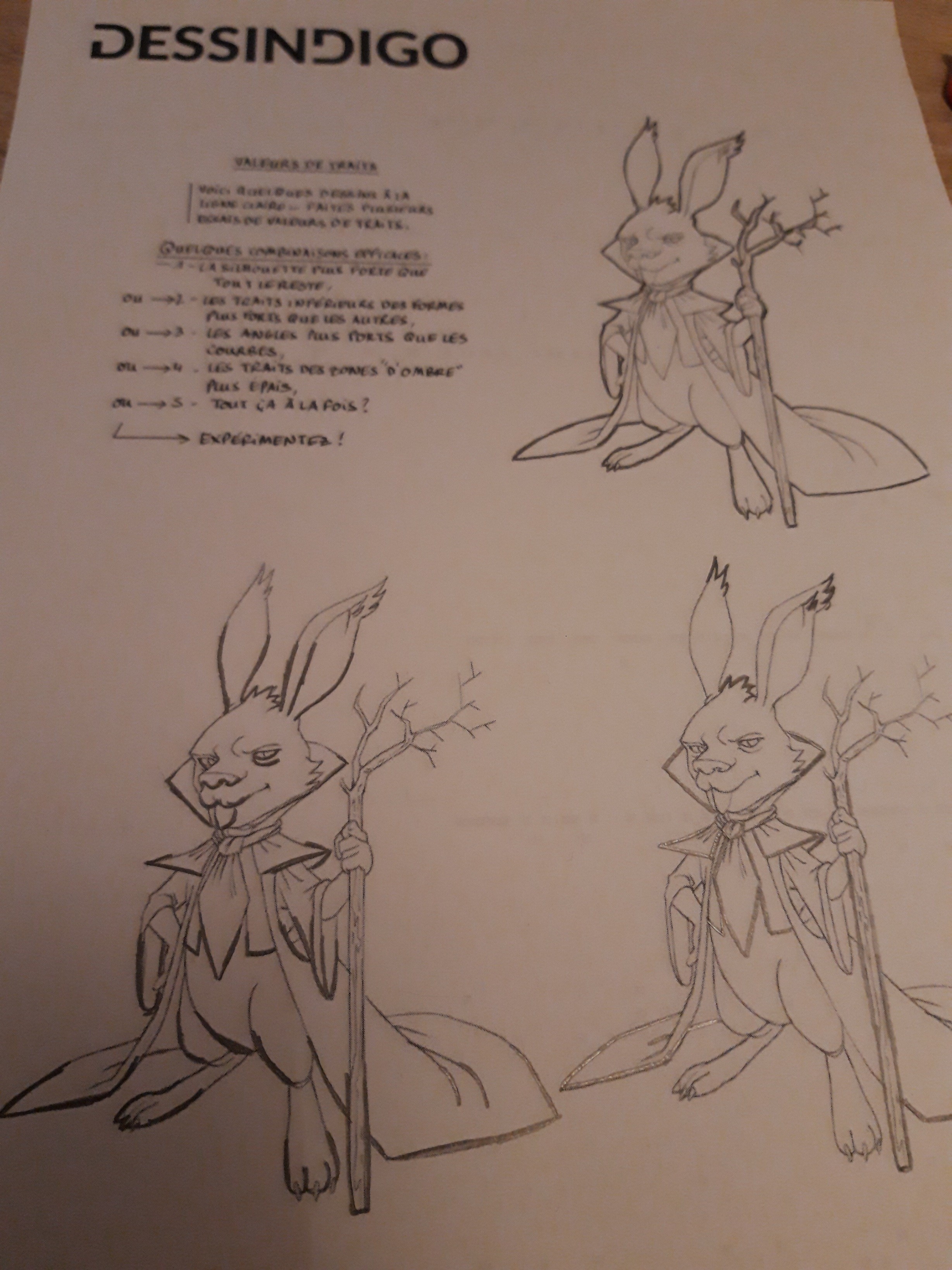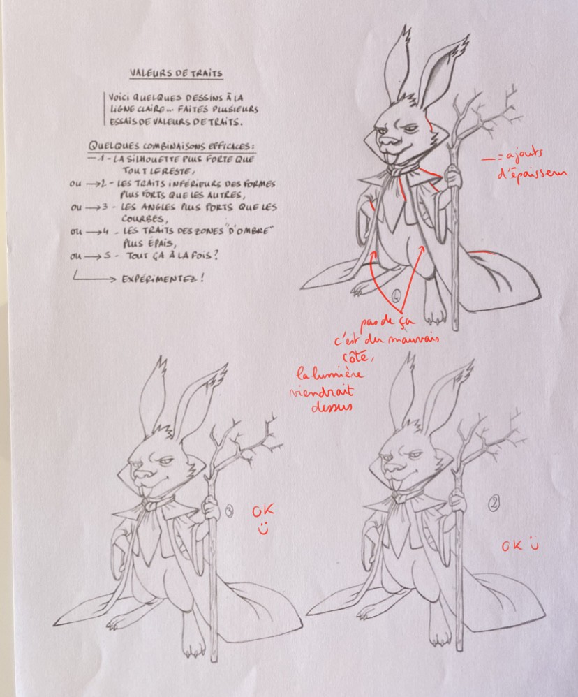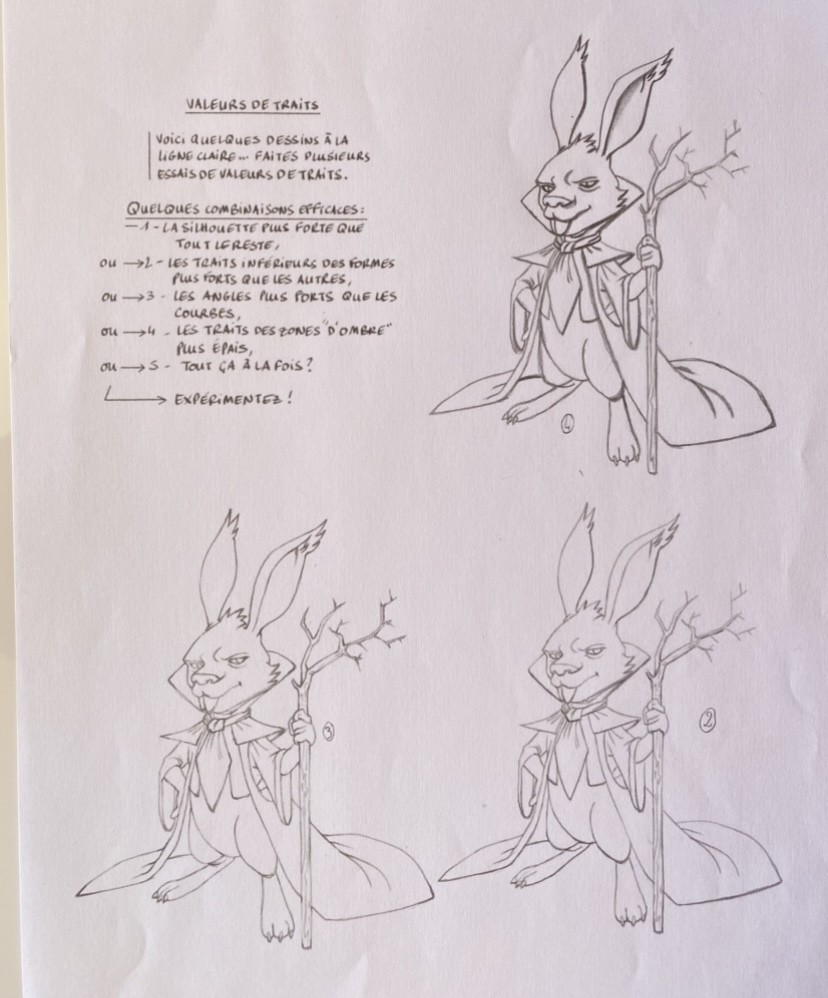 Beau travail :) C'est bien compris pour celui de la silhouette. En bas à droite attention c'est un peu trop épais, et il faut faire attention à faire une transition vers le plus fin, pas arrêter net. Même souci transitions pour celui des angles, j'ajoute aussi qu'il manque des angles, il faut une harmonie sur le lapin, et penser que tout croisement de trait fait un angle. En tous cas les principes sont bien compris ^^