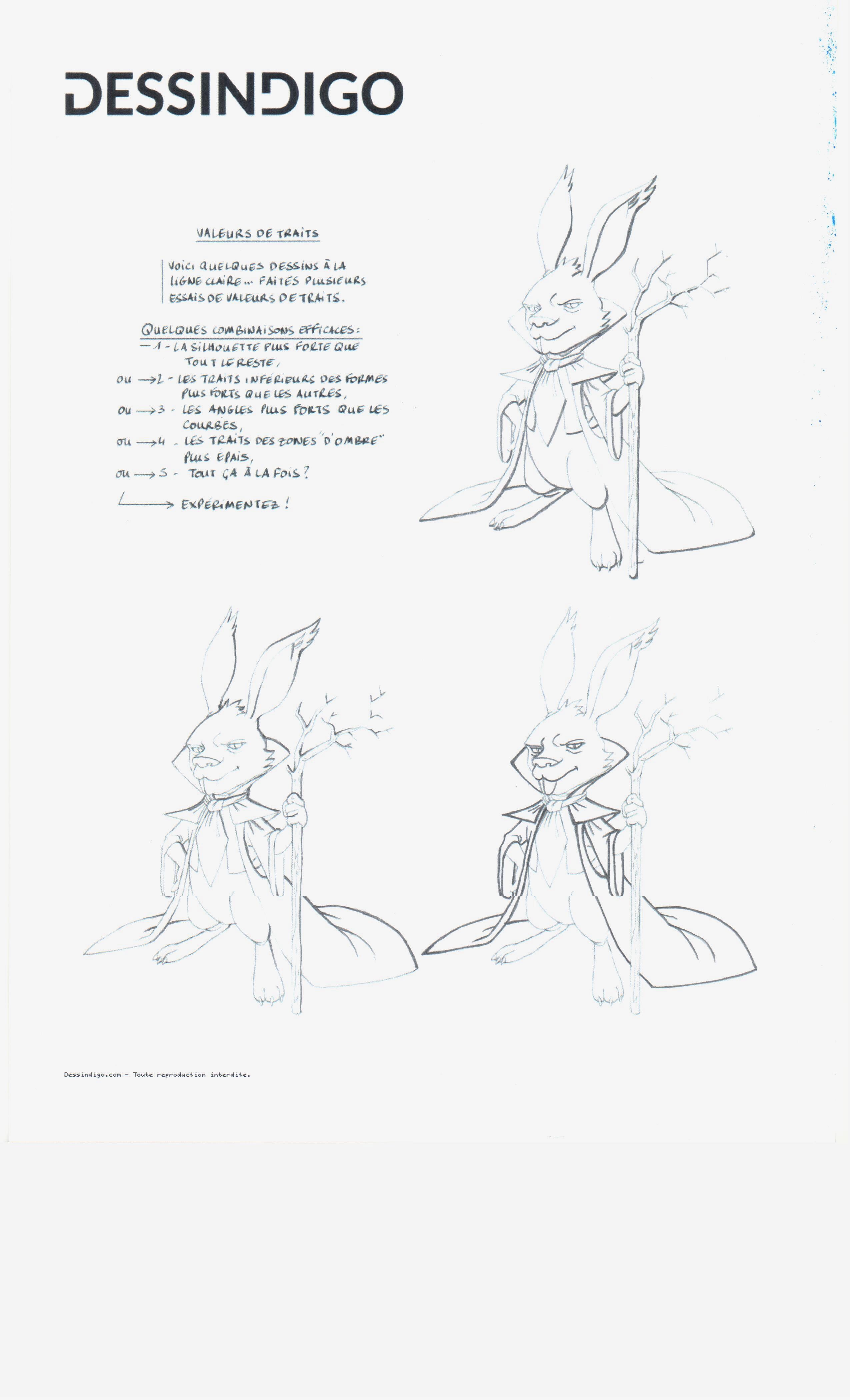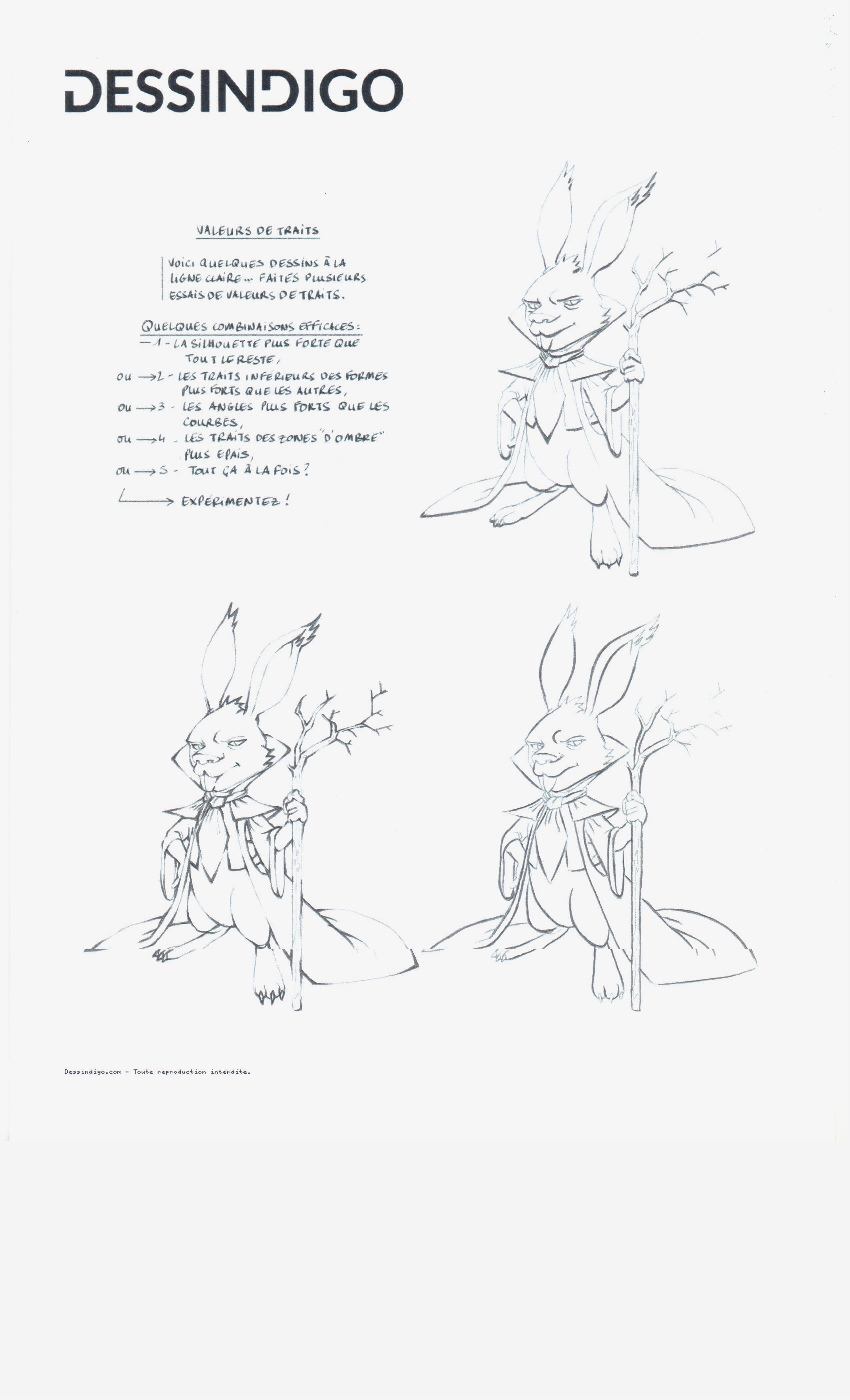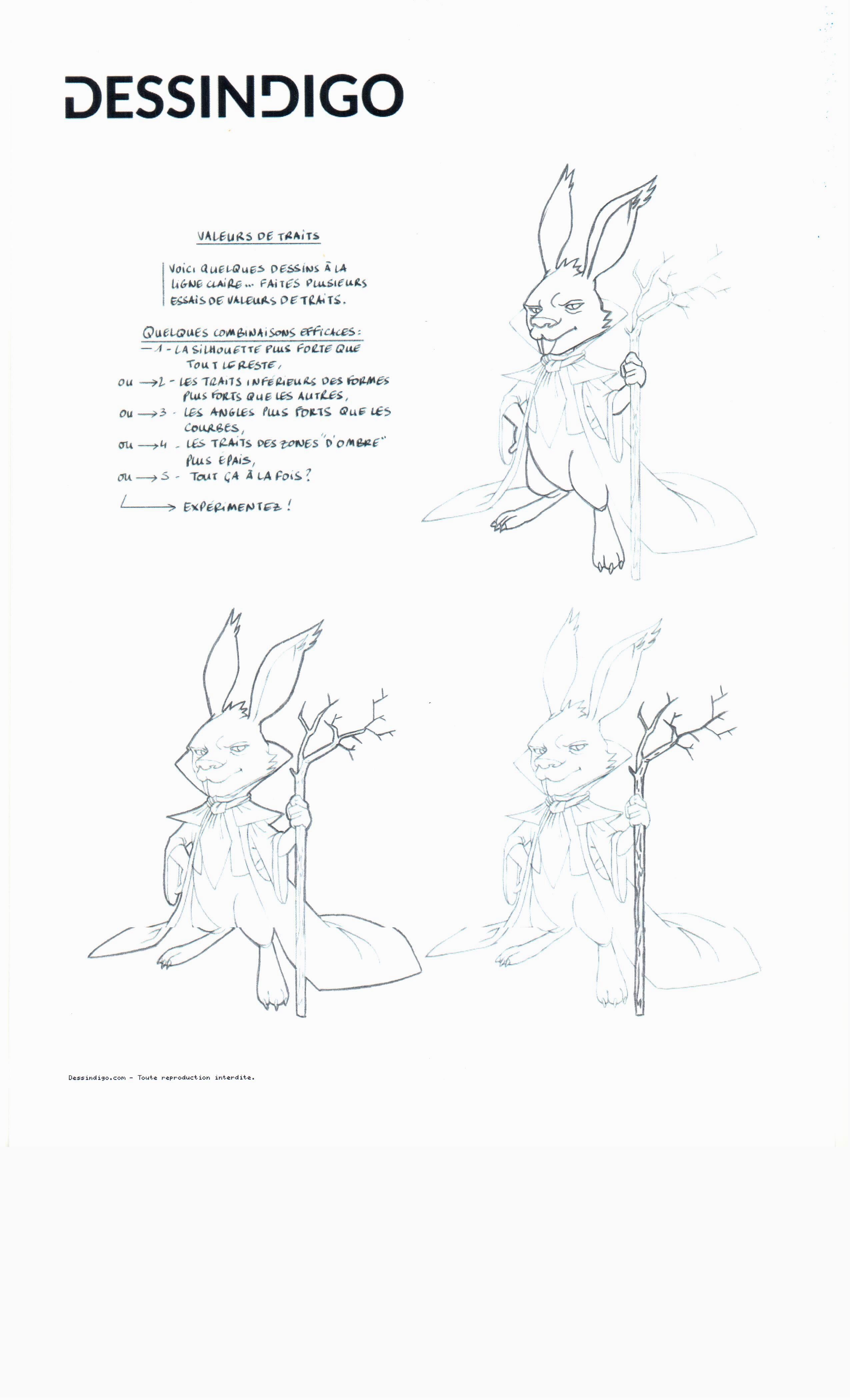 Beau travail :) C'est bien compris pour celui de la silhouette. En bas à droite attention c'est un peu trop épais, et il faut faire attention à faire une transition vers le plus fin, pas arrêter net. Même souci transitions pour celui des angles, j'ajoute aussi qu'il manque des angles, il faut une harmonie sur le lapin, et penser que tout croisement de trait fait un angle. En tous cas les principes sont bien compris ^^