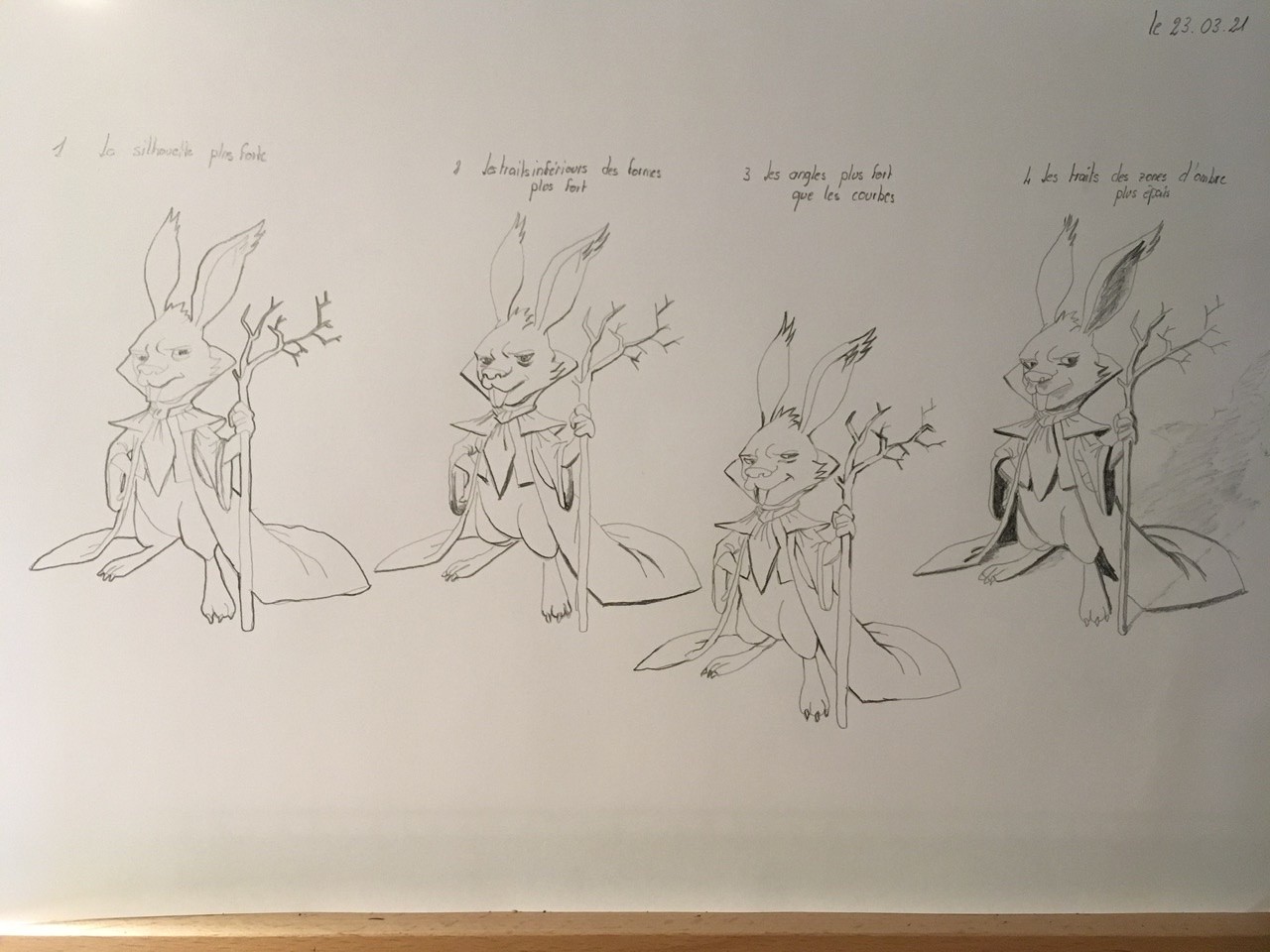 Great job :) It's good for the first 2 rabbits. For the 3rd, the principle is understood but it's better to gradually reduce the thickness so that it integrates well with the rest of the line, do not stop the thickness abruptly. For the last one, be careful of the slightly messy side, we are still on thickening lines so watch out for too thick coloring. I have trouble seeing where the light is because there are lines on the right that are thickened and others not, I will highlight those that should also be thickened. Otherwise, it's good!