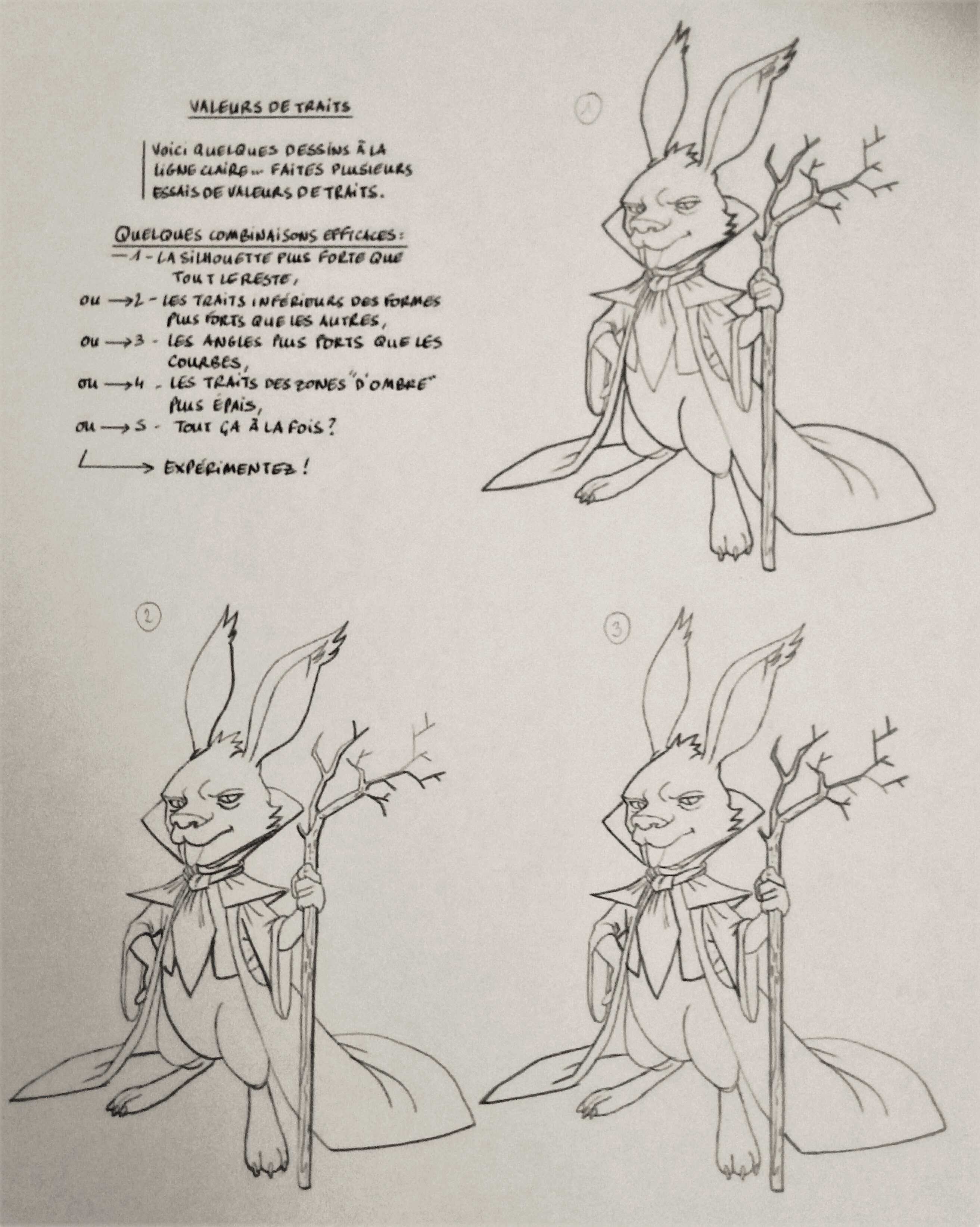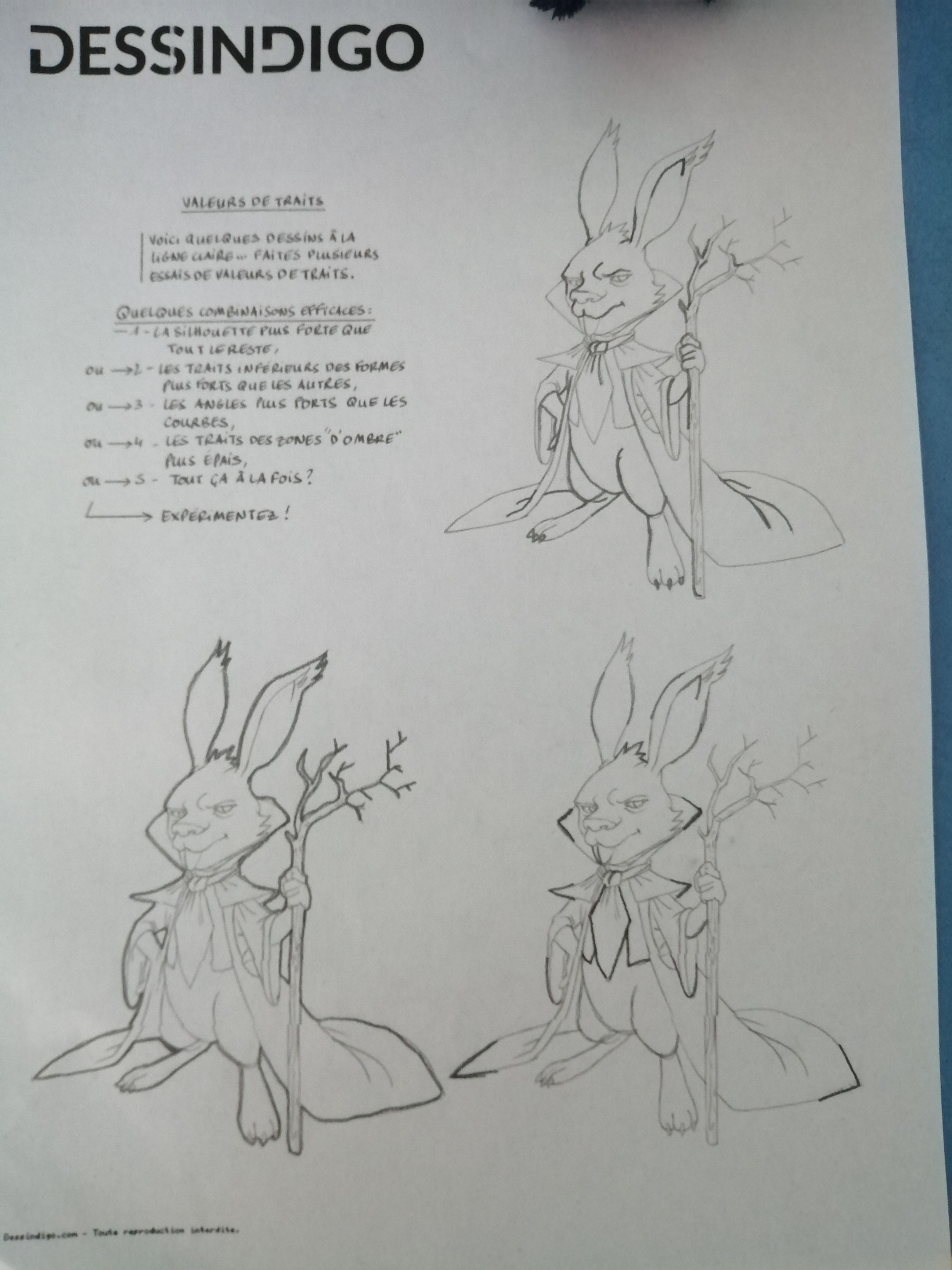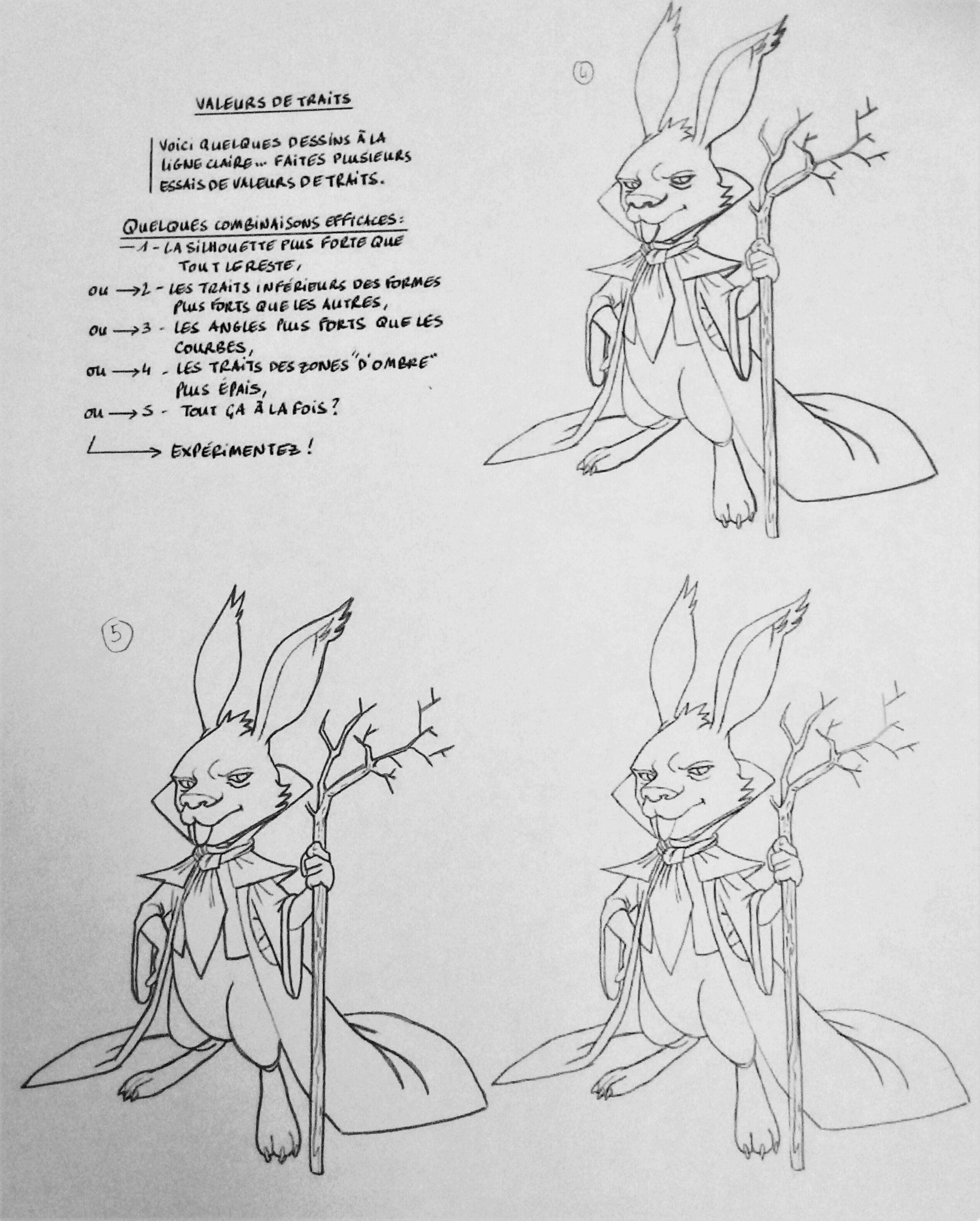 Bonjour, voici mes 5 lapins, le 1er (j'ai mis les numéros à gauche en haut des dessins !) avec la silhouette + forte, la 2ème avec les traits inférieurs des formes + forts, la 3ème avec les angles + forts que les courbes, la 4ème avec les "ombres" et la 5ème avec tout rassemblée (la silhouette, les traits inférieurs, les angles et les "ombres") !!! 😁
