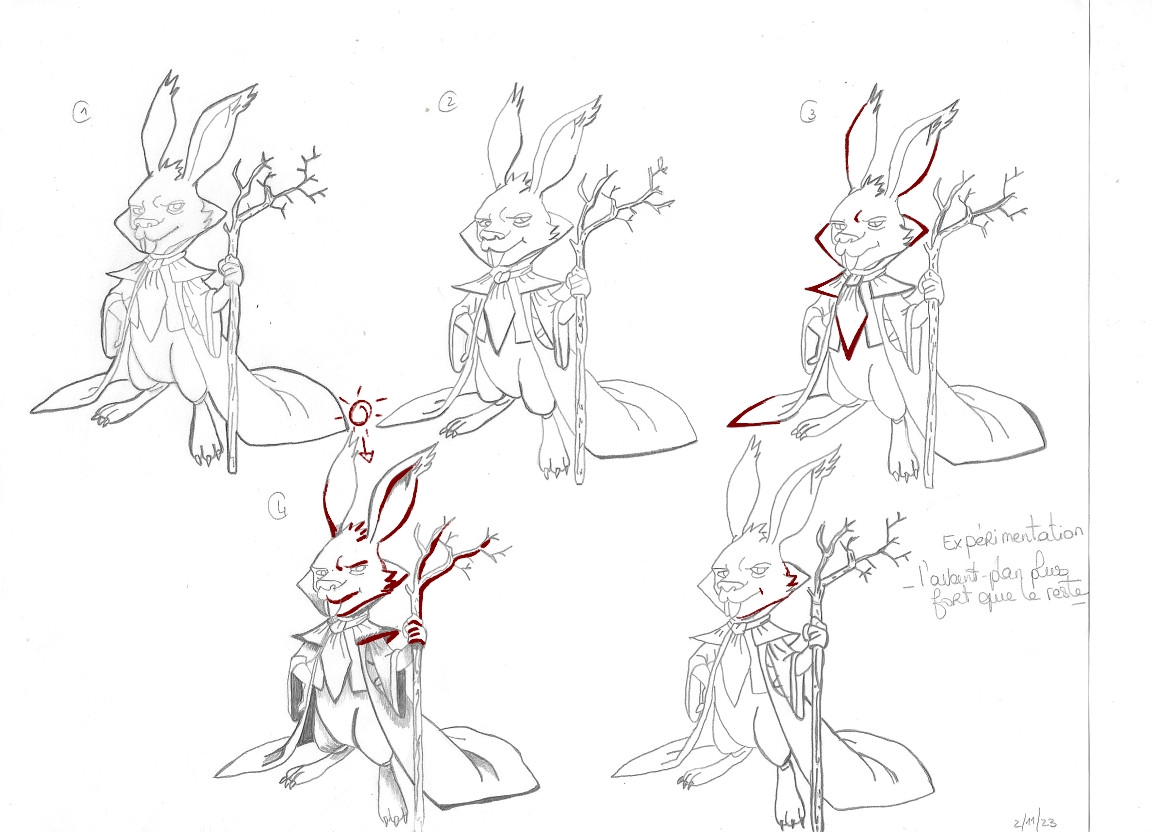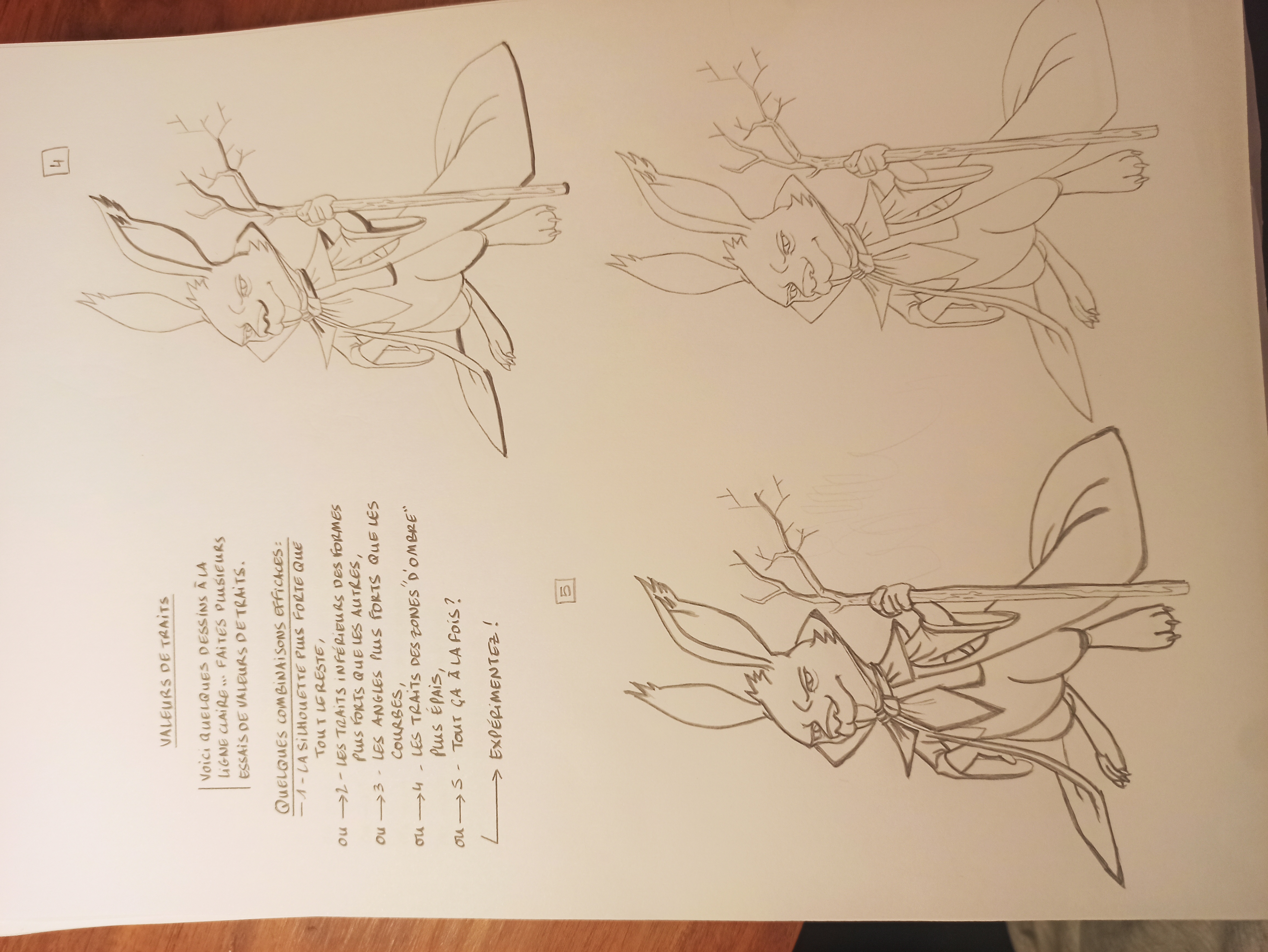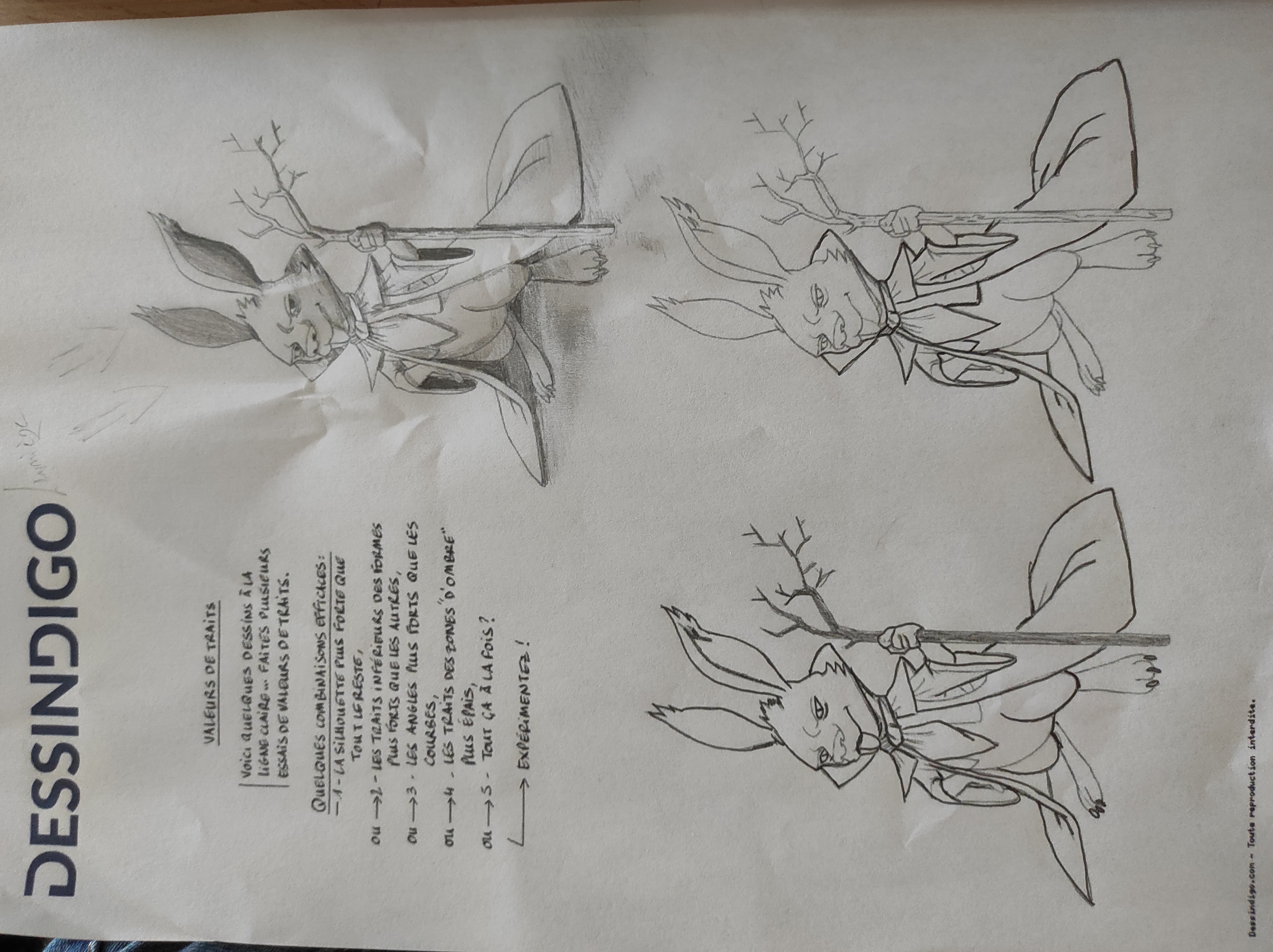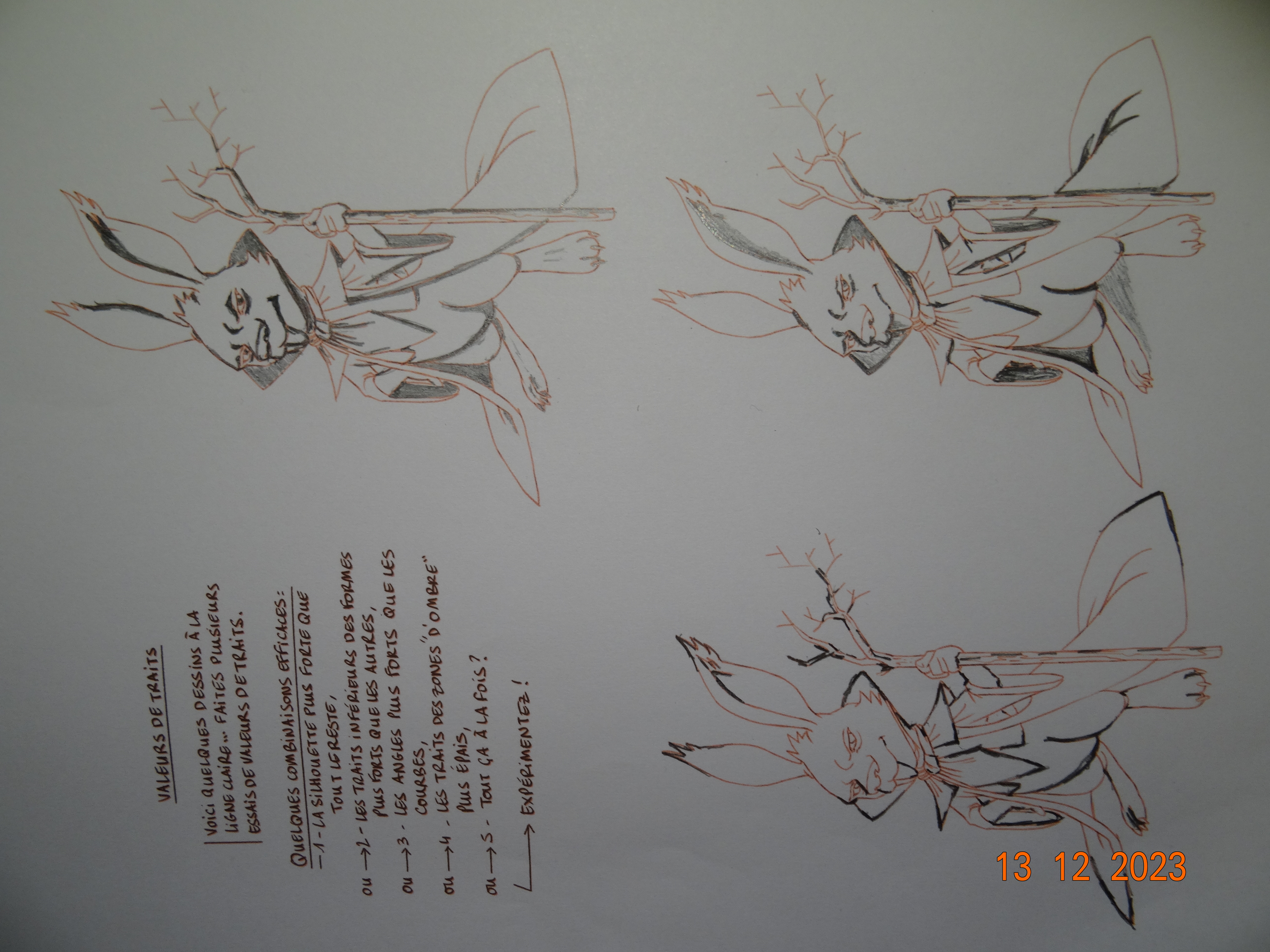 Bonsoir Sunaria, c'est super tout ça! Je pense que tu peux ajouter davantage d'épaisseur: sur la vue une tu as épaissi uniquement le contour du lapin, mais tu peux également faire la cape avec. Sur la deux, tu t'es concentrée sur le corps et pas assez sur la tête, et sur la troisième c'est la partie inférieur du corps que tu as un peu laissé de côté...
