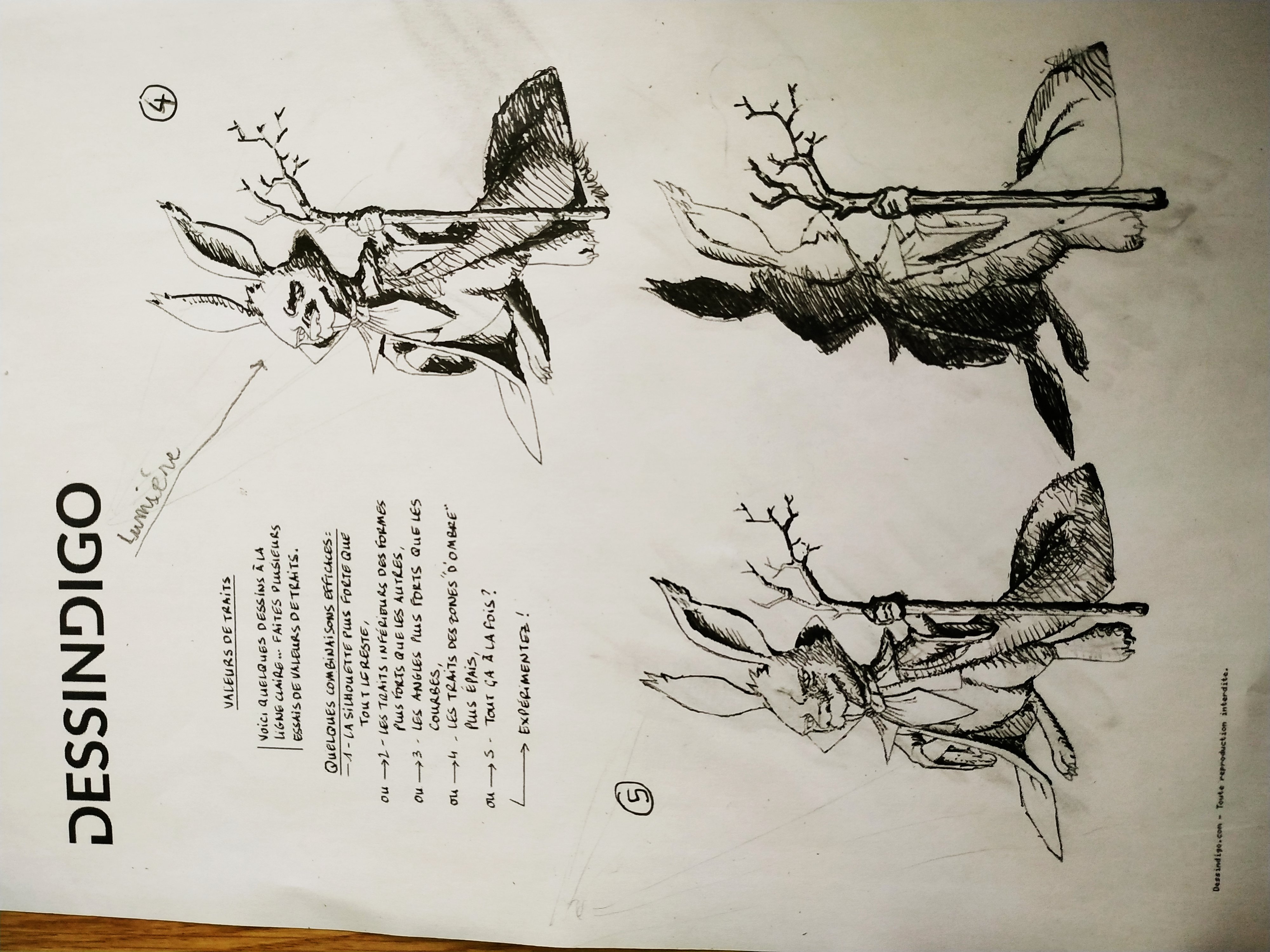 Re! Super! J'aime beaucoup le rendu du dessin 5! Sur le 4, je ferai à peu près le même commentaire que sur ton exercice précédent, tu peux encore ajouter des zones de variations d'épaisseur. C'est vrai que ça peut être un peu complexe à appréhender la gestion de l'épaisseur de trait selon le placement d'ombre, mais tu dois utiliser ça comme un repère et non comme un impératif dans ton encrage. Tu visualises ta source de lumière et tu gères ensuite ton épaisseur de trait comme tu le sens selon ce choix! Tu n'es pas obligée d'y être 100% fidèle.